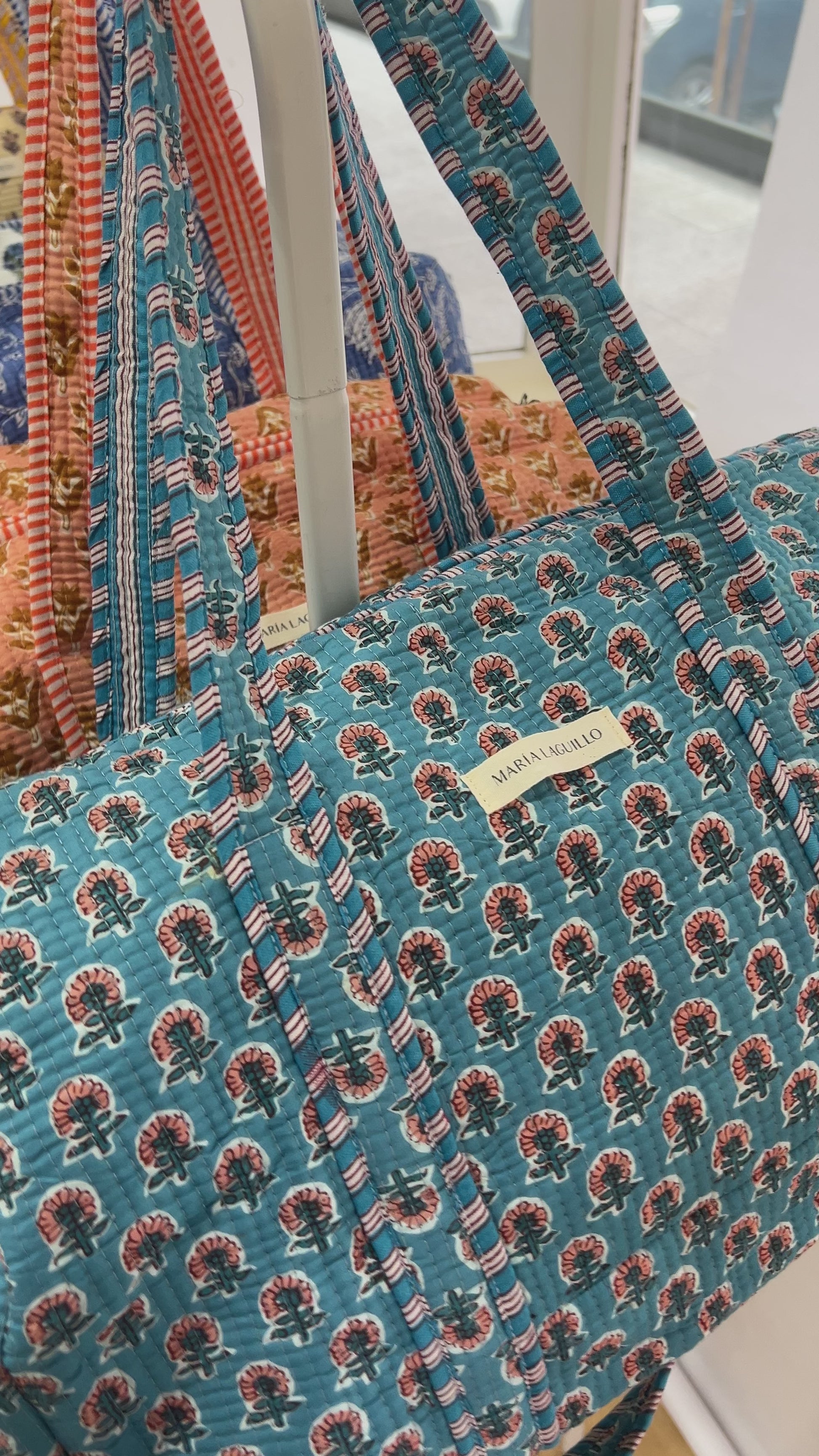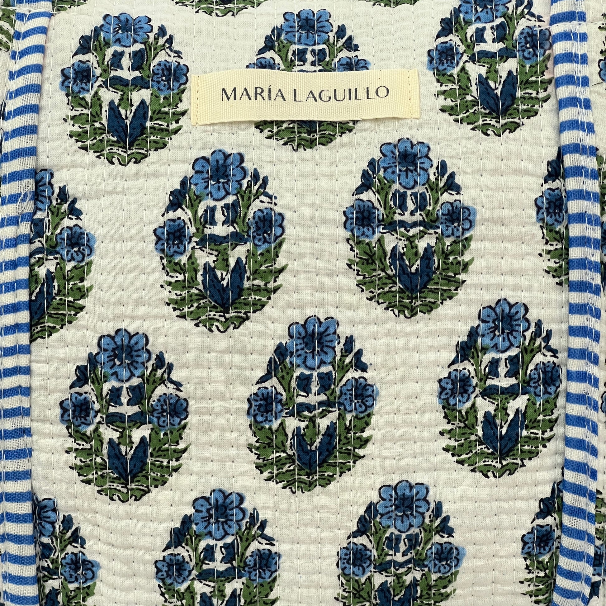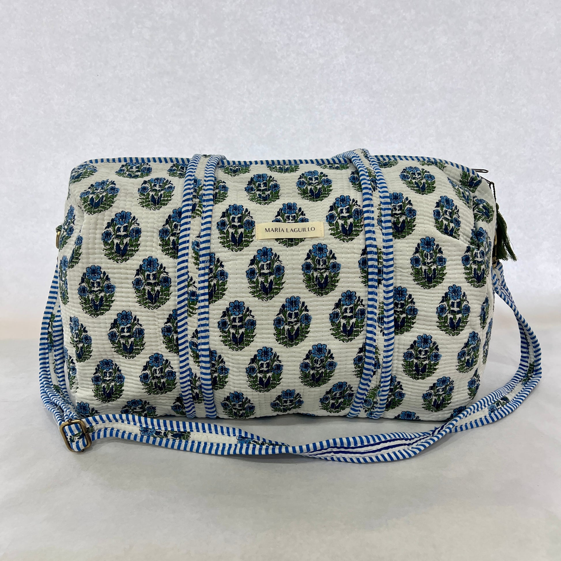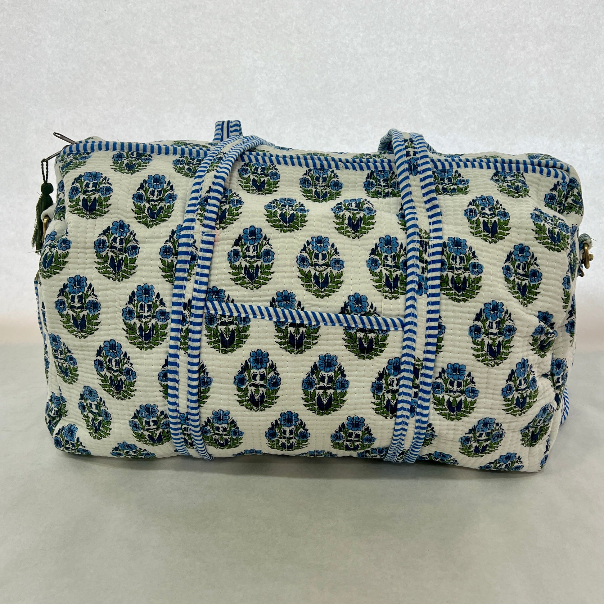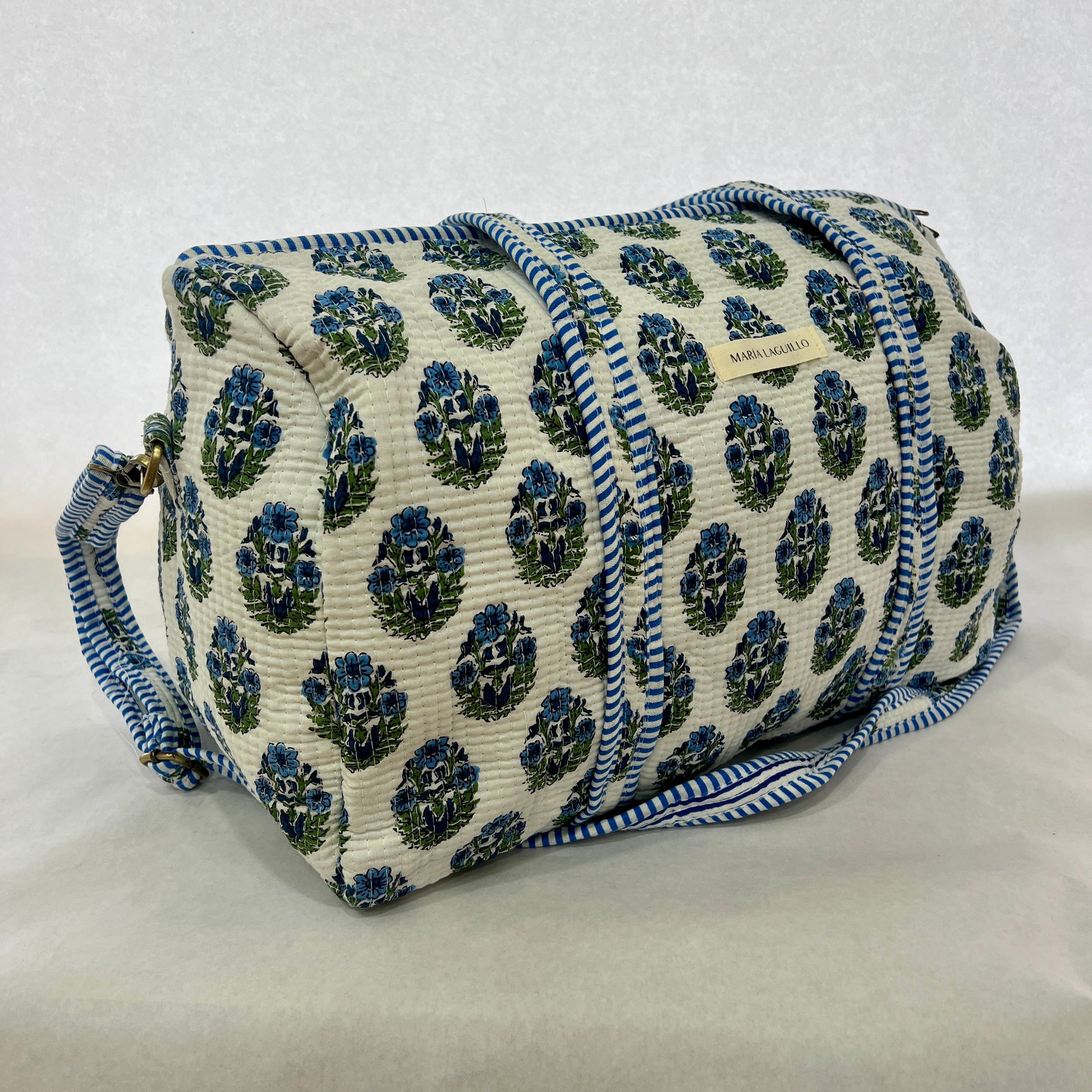 Bolso de viaje VIKRAM confeccionado en tela block print 100% algodón, con cierre de cremallera exterior. Fabricado artesanalmente en la India, combina estilo y funcionalidad para acompañarte en tus desplazamientos.