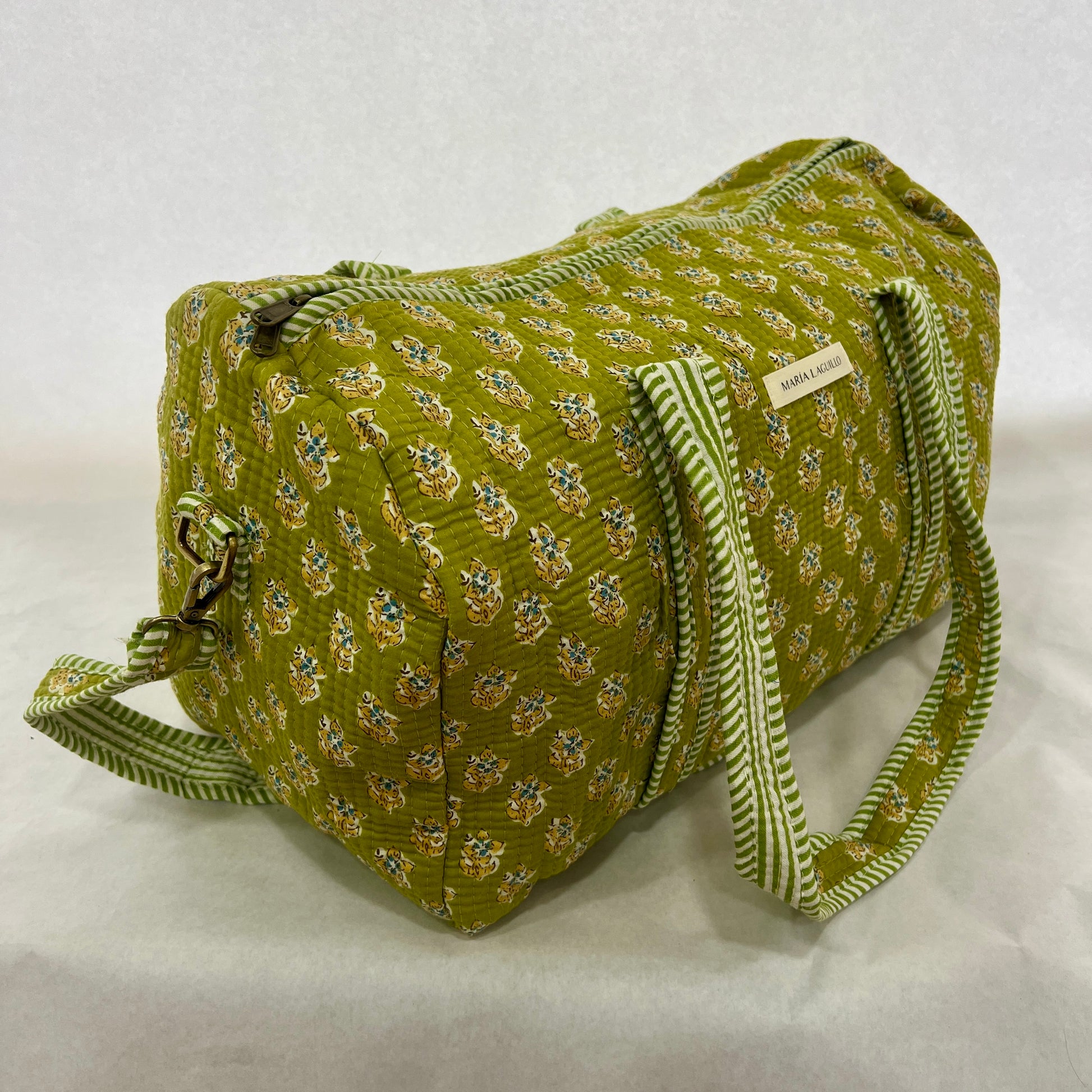 Bolso de viaje RUSHA confeccionado en tela block print 100% algodón, con cierre de cremallera exterior. Fabricado artesanalmente en la India, combina estilo y funcionalidad para acompañarte en tus desplazamientos.