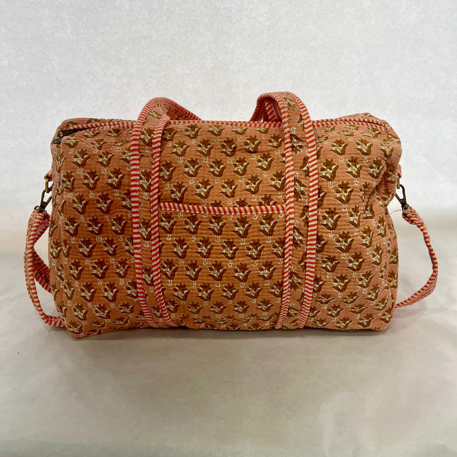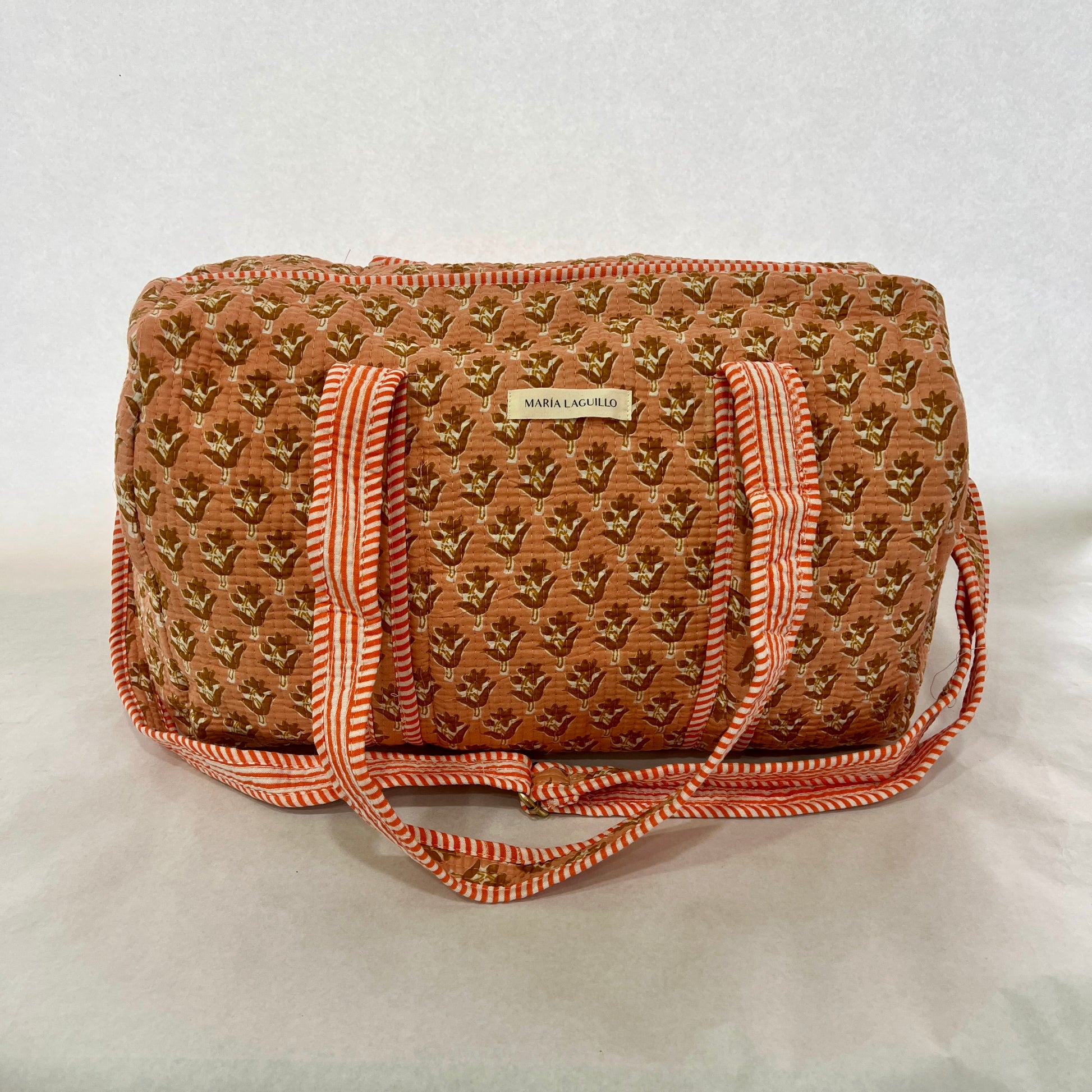 Bolso de viaje TRASHNA confeccionado en tela block print 100% algodón, con cierre de cremallera exterior. Fabricado artesanalmente en la India, combina estilo y funcionalidad para acompañarte en tus desplazamientos.