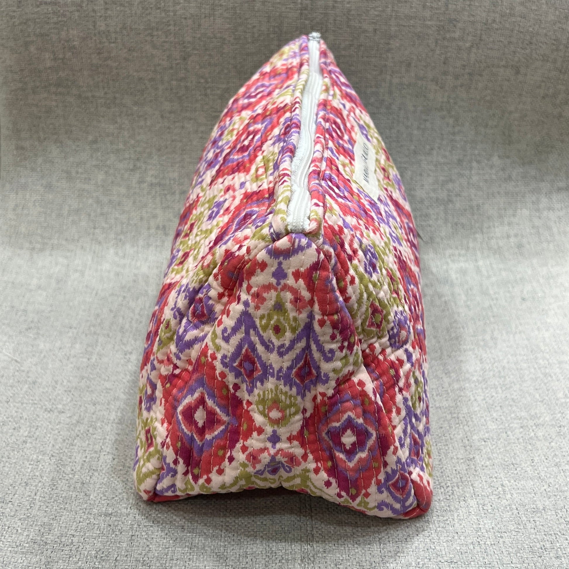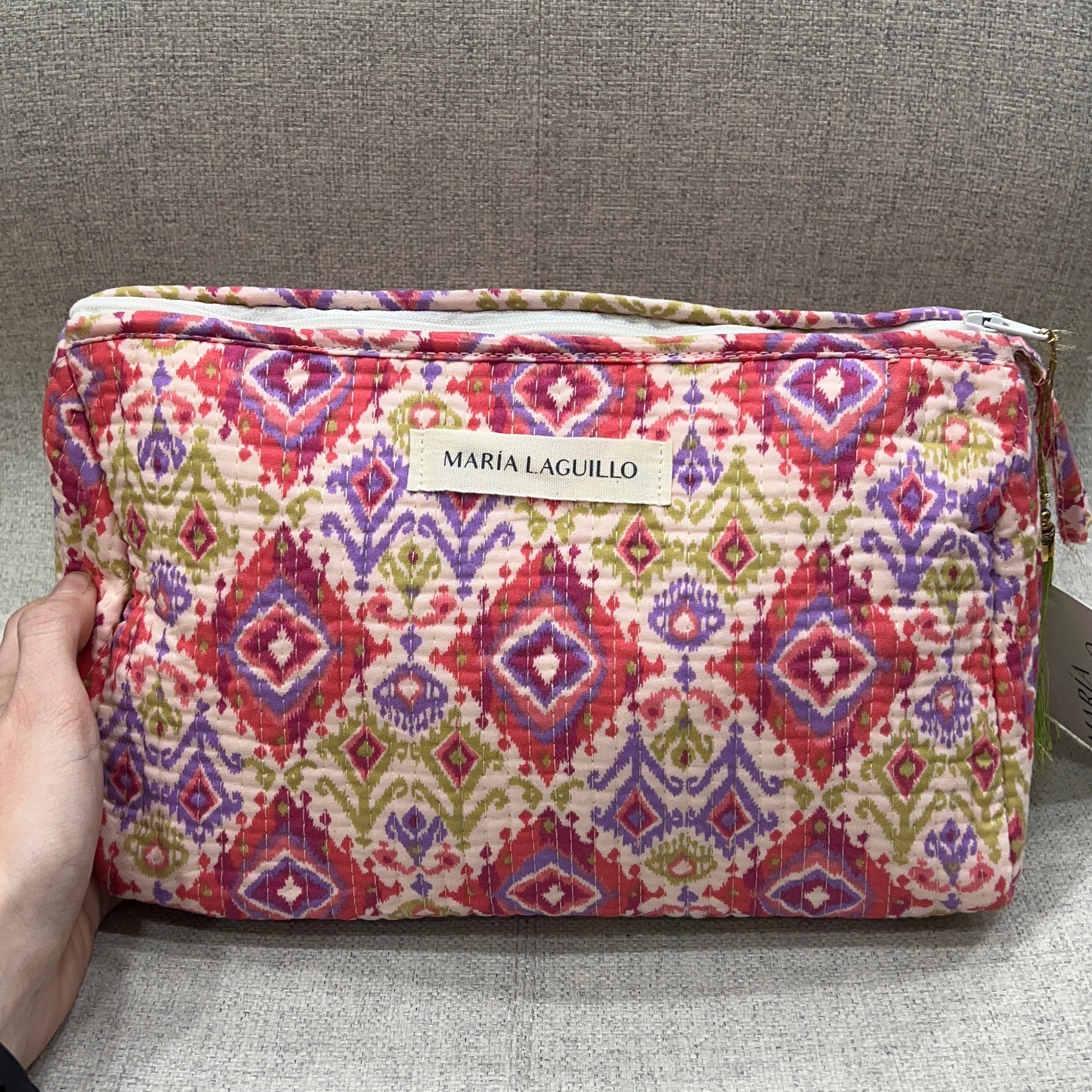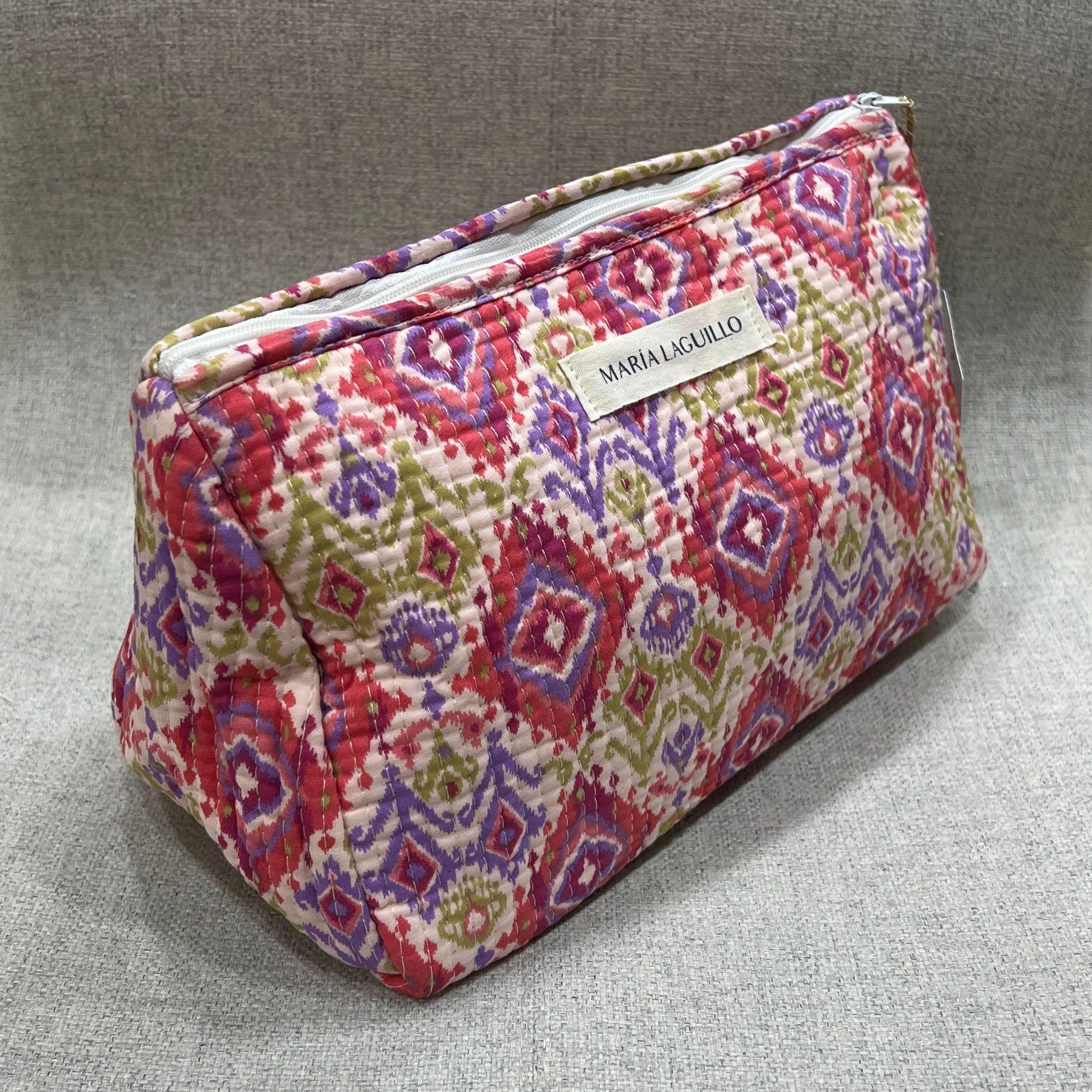 Confeccionado en 100% algodón y decorado con un estampado block print aplicado artesanalmente en la India, cada pieza es única. Su interior impermeable y cuatro bolsillos garantizan orden y protección, mientras que su forma triangular ofrece una gran capacidad sin ocupar demasiado espacio.