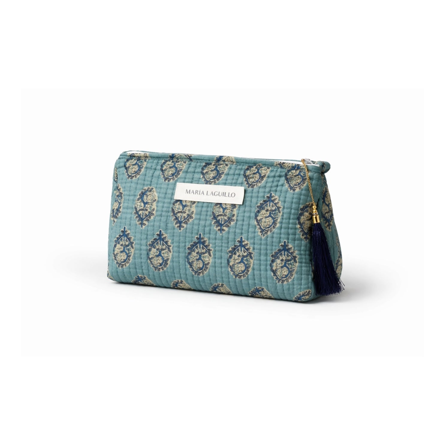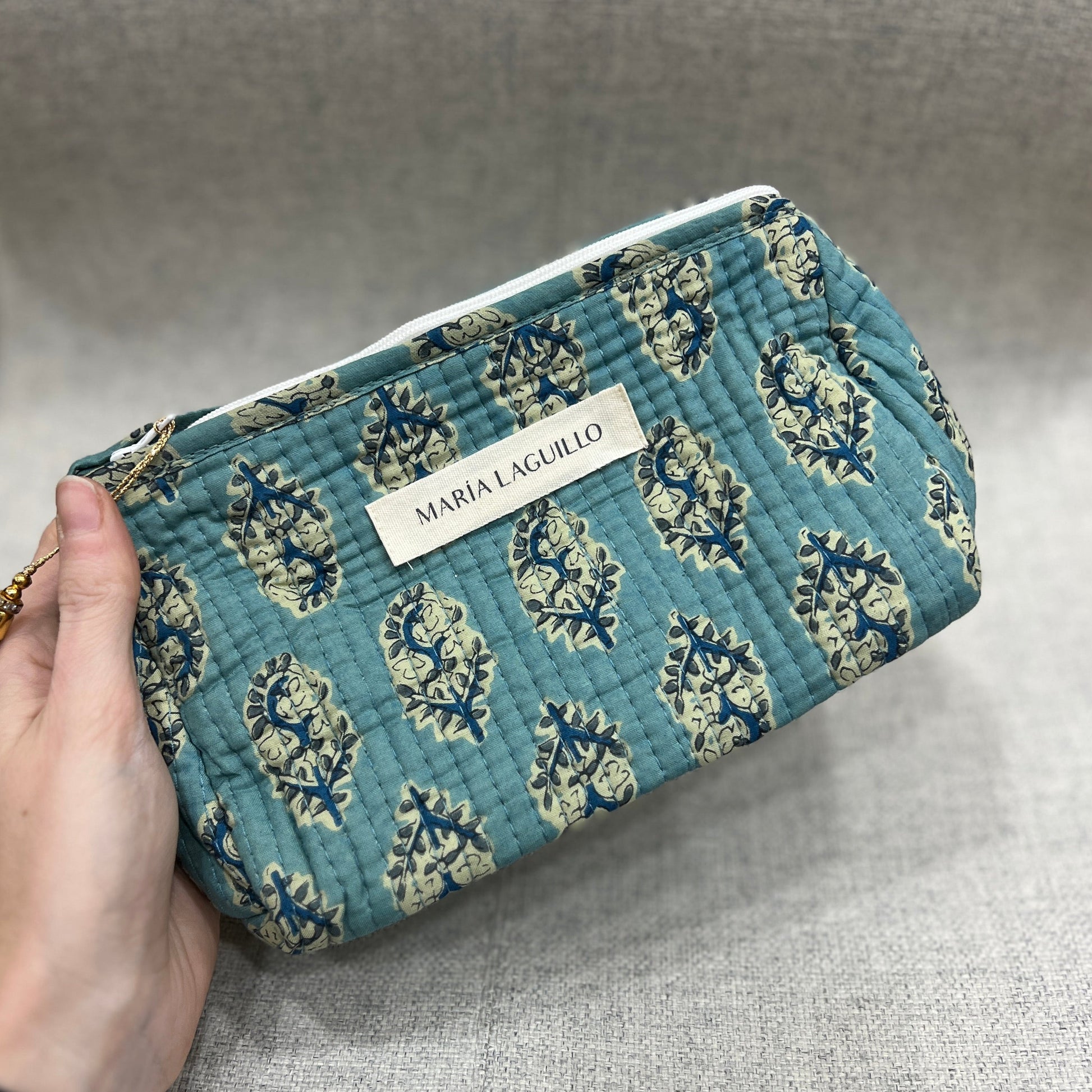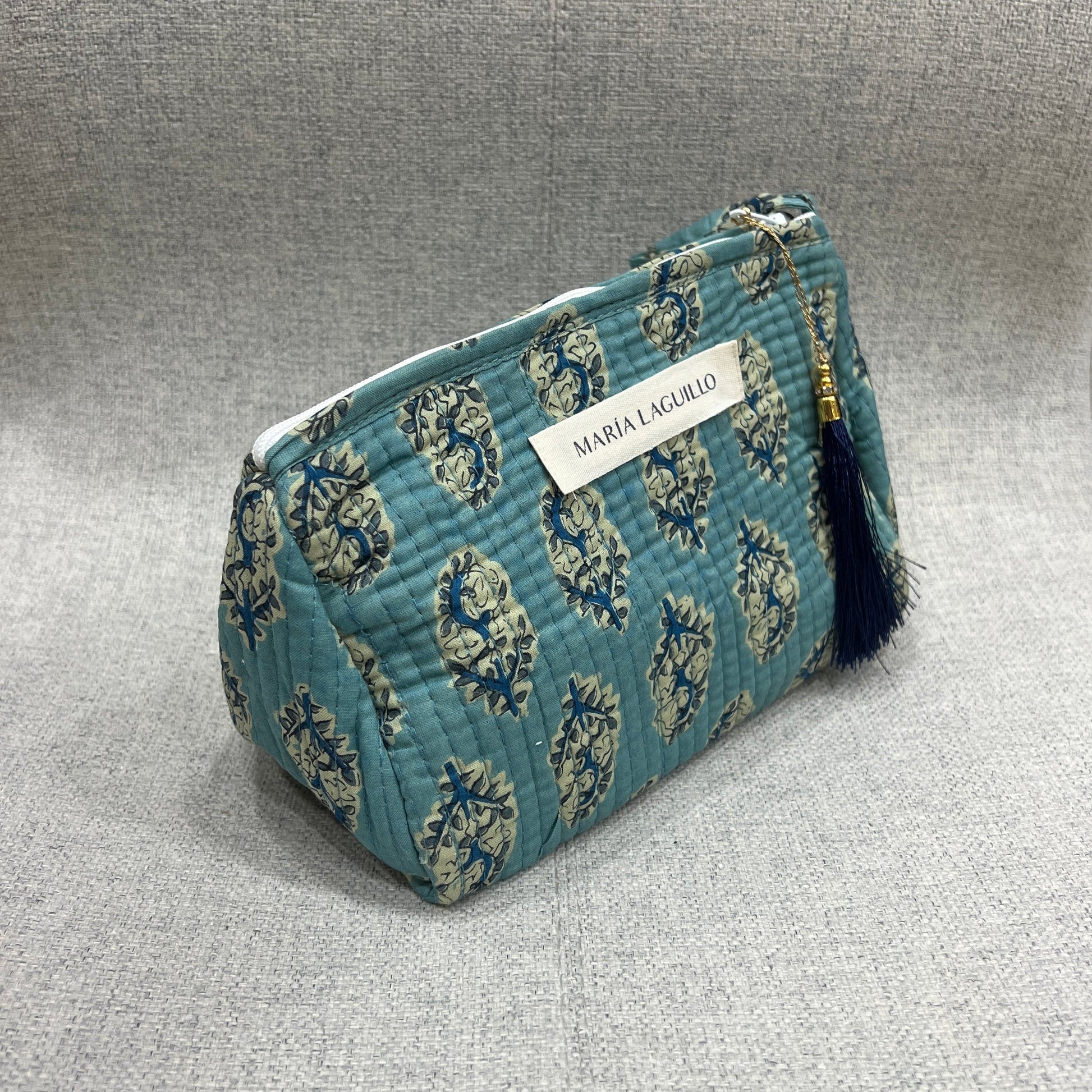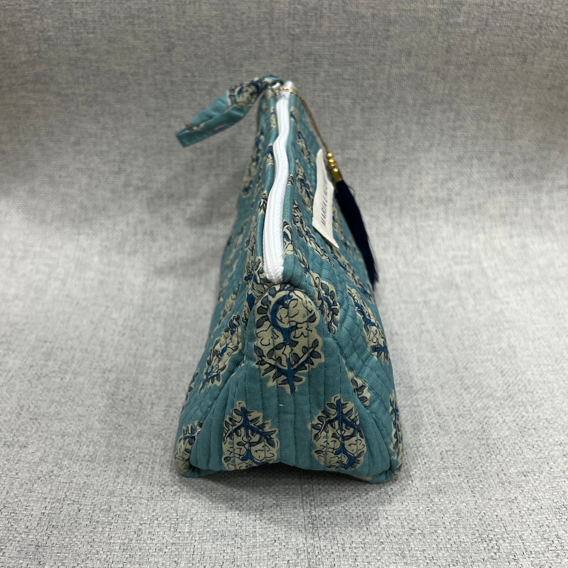 Neceser PEQUEÑO IMPERMEABLE HOJAN confeccionado en 100% algodón y elaborado artesanalmente en la India mediante la técnica tradicional de block print, que aporta un encanto único a cada pieza.