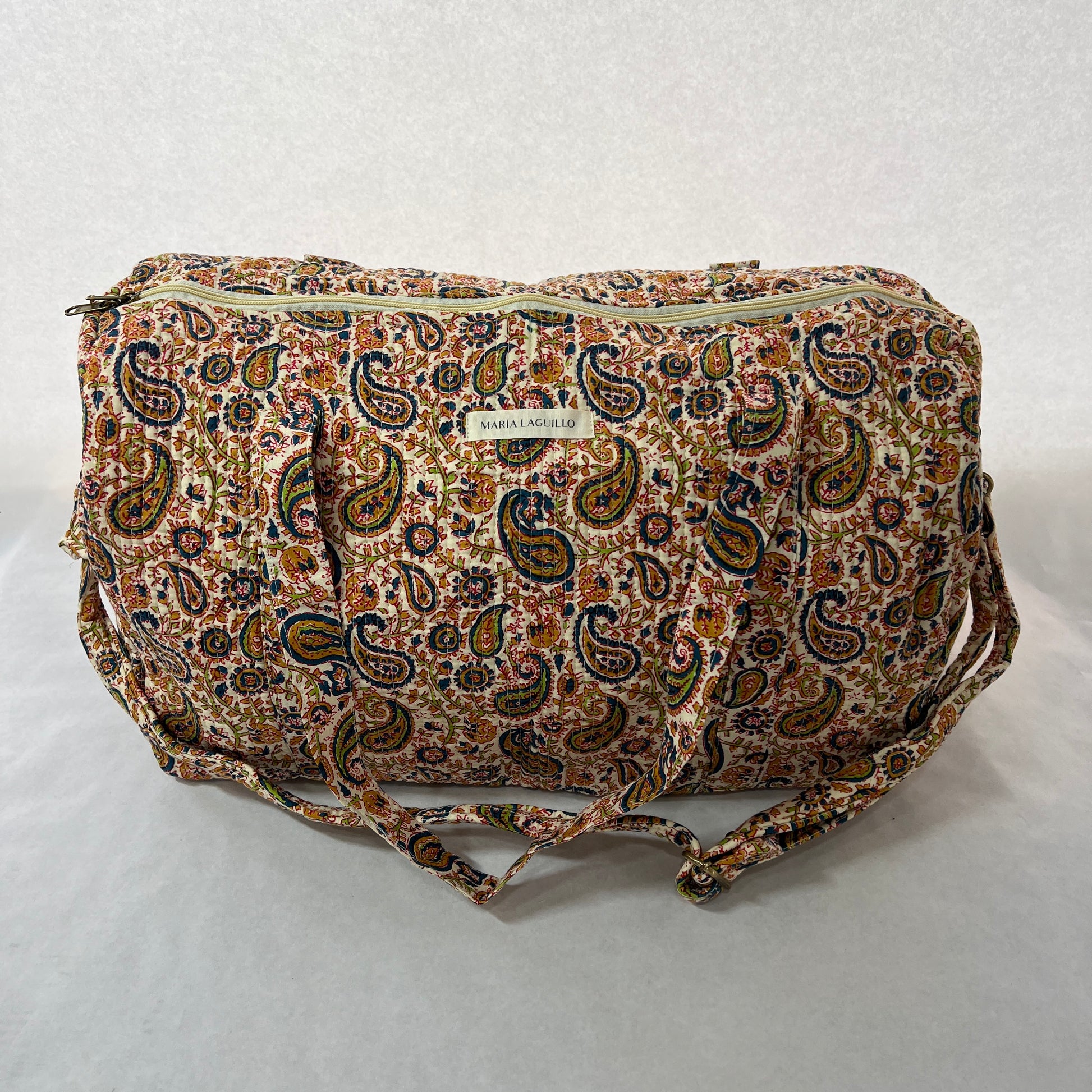 Bolso de viaje NIRMA confeccionado en tela block print 100% algodón, con cierre de cremallera exterior. Fabricado artesanalmente en la India, combina estilo y funcionalidad para acompañarte en tus desplazamientos.
