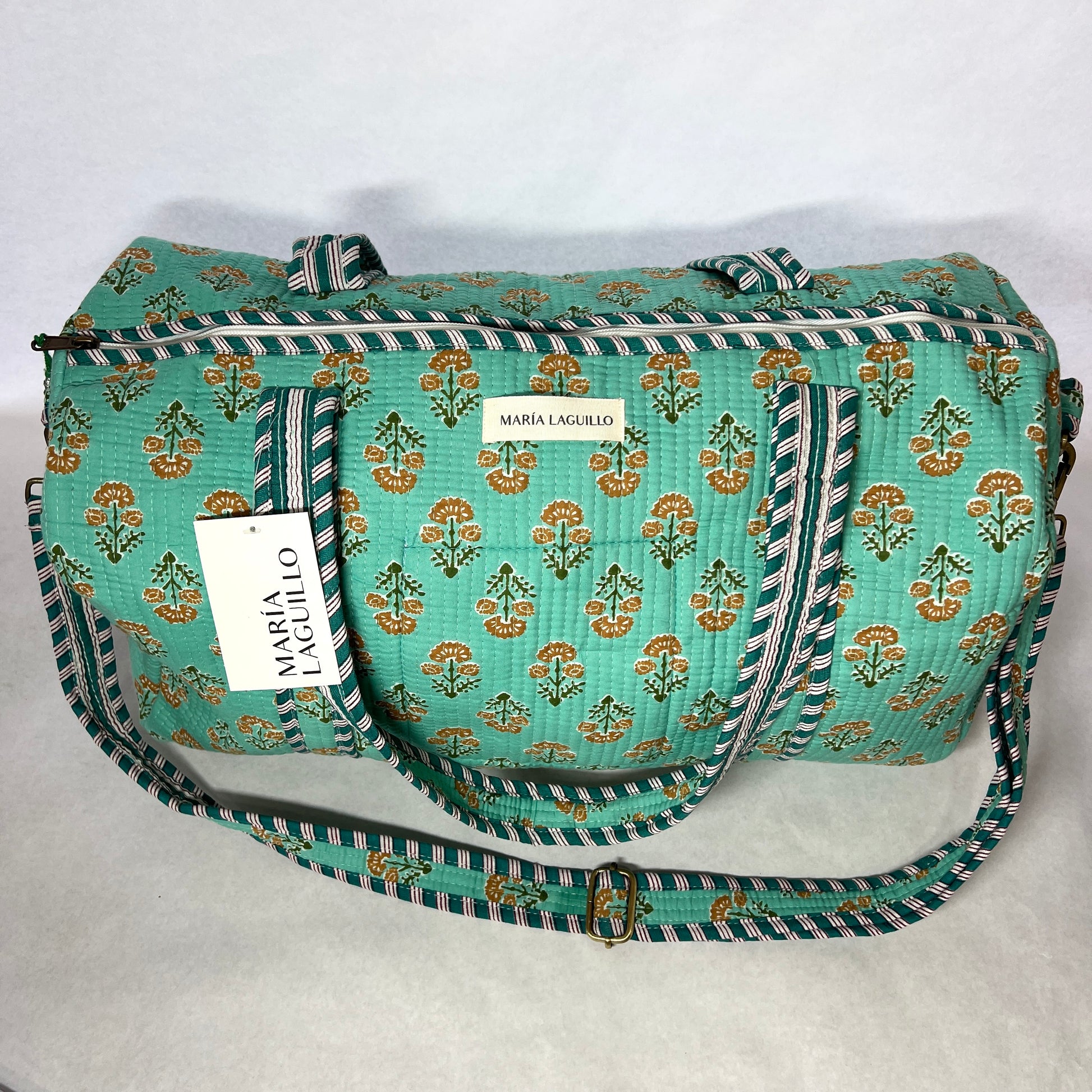 Bolso de viaje PRIVI confeccionado en tela block print 100% algodón, con cierre de cremallera exterior. Fabricado artesanalmente en la India, combina estilo y funcionalidad para acompañarte en tus desplazamientos.