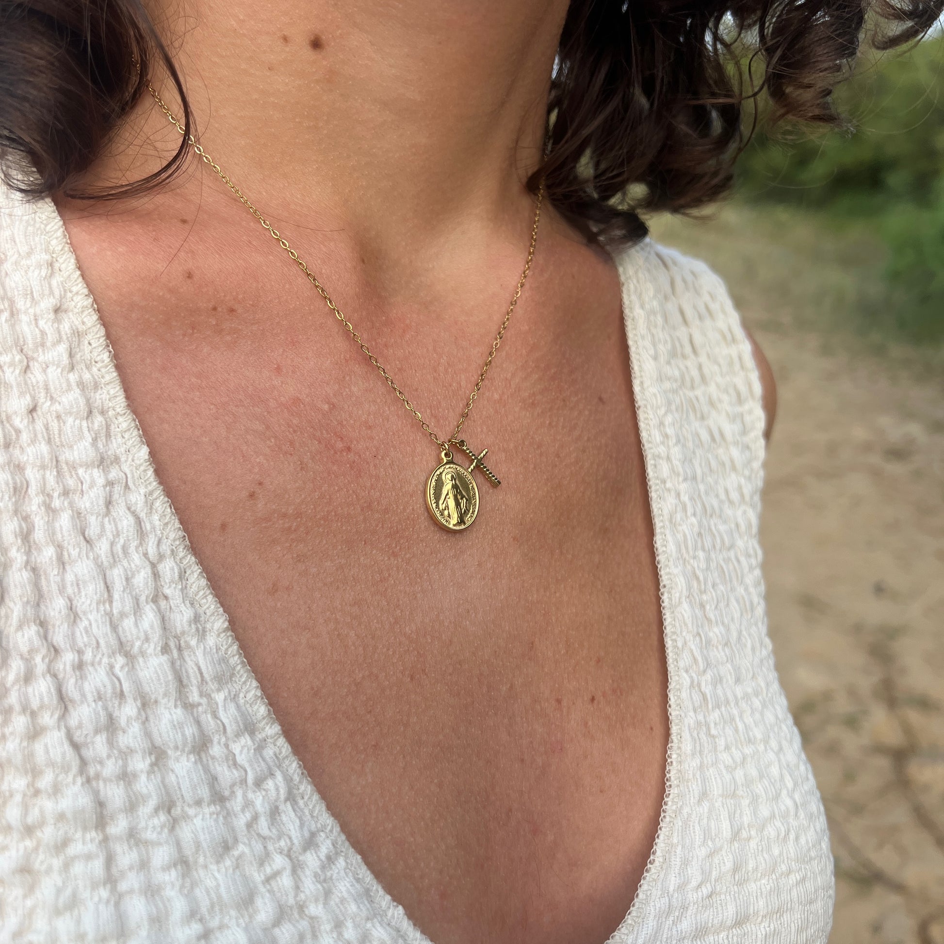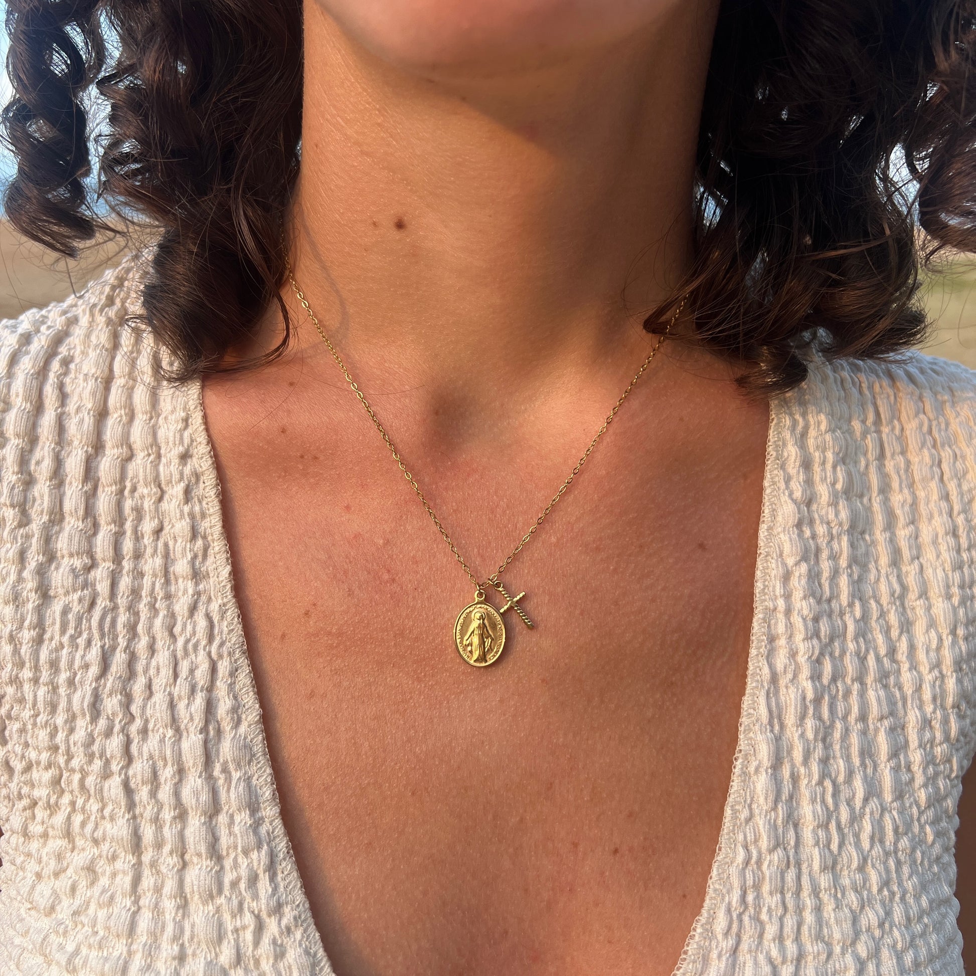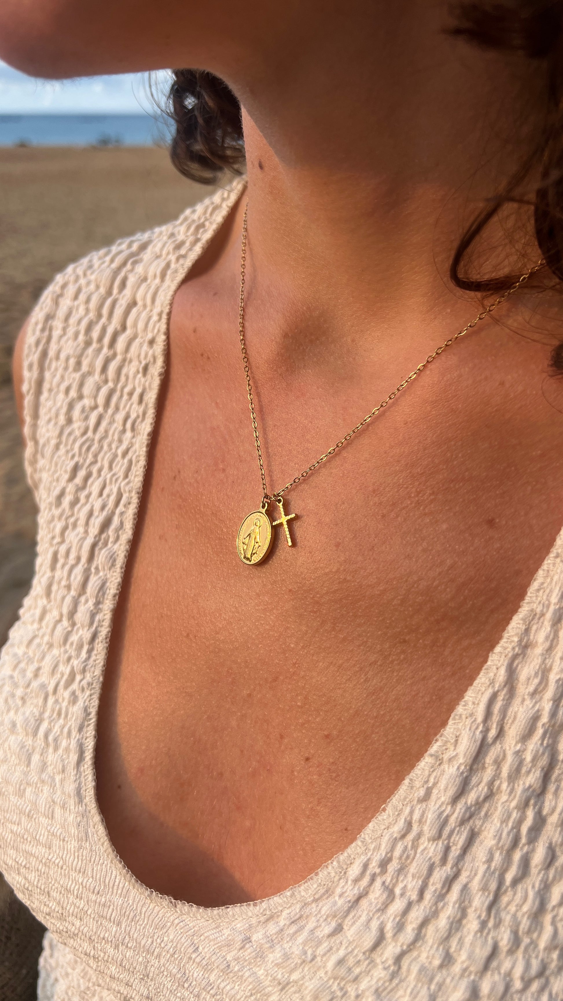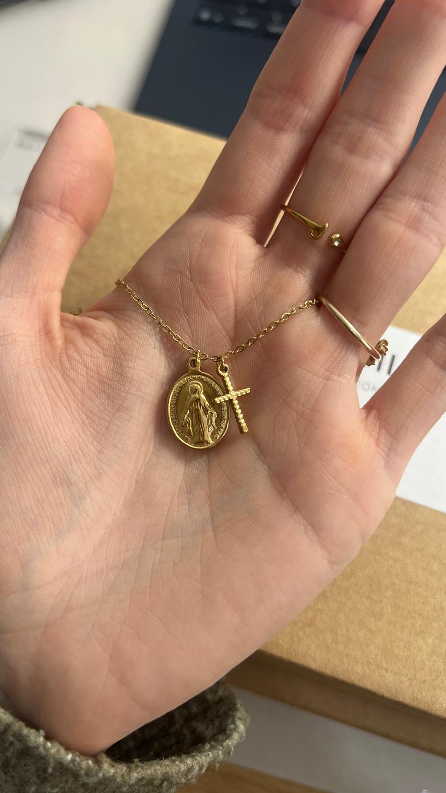 Collar VIRGEN MILAGROSA CRUZ DORADO de acero inoxidable.
