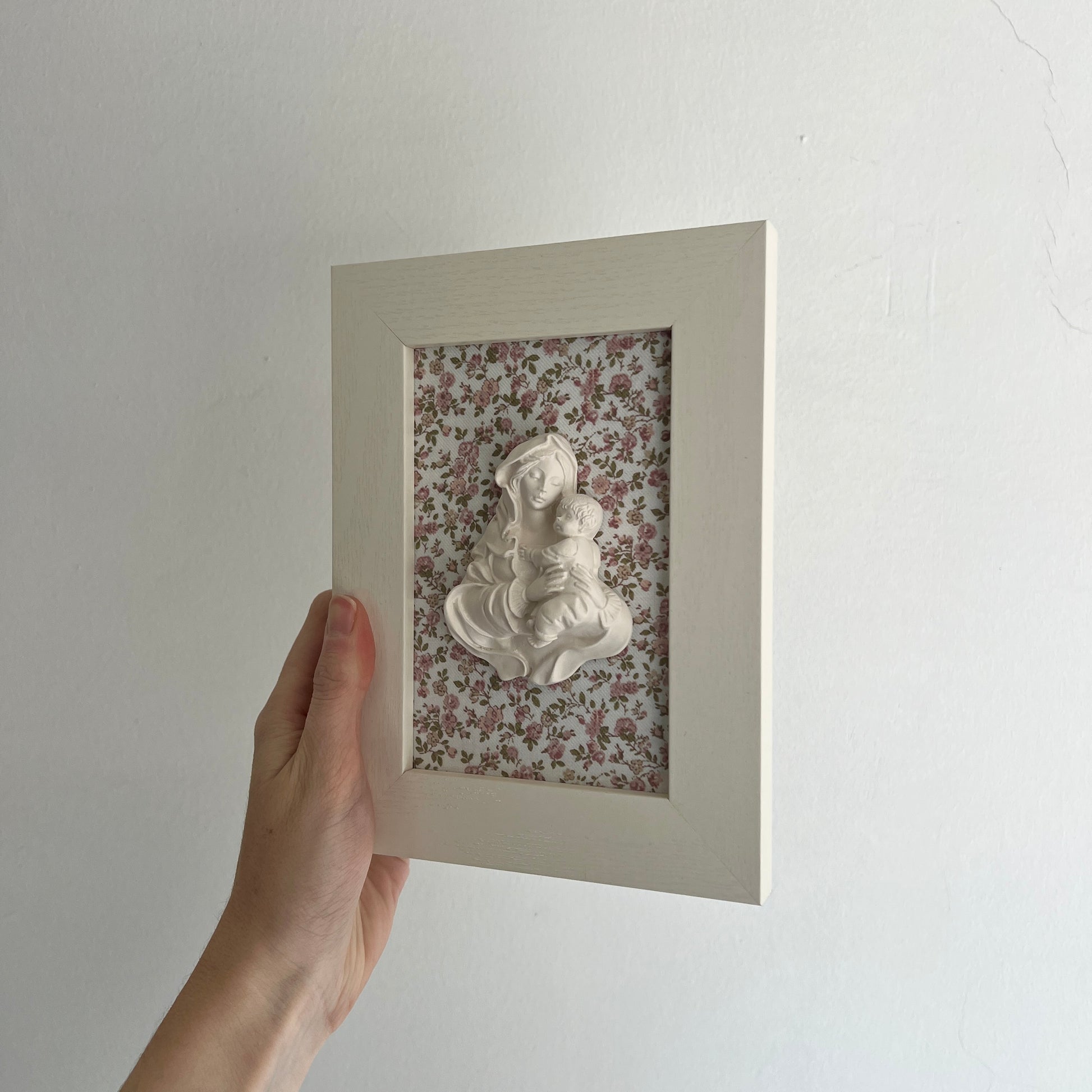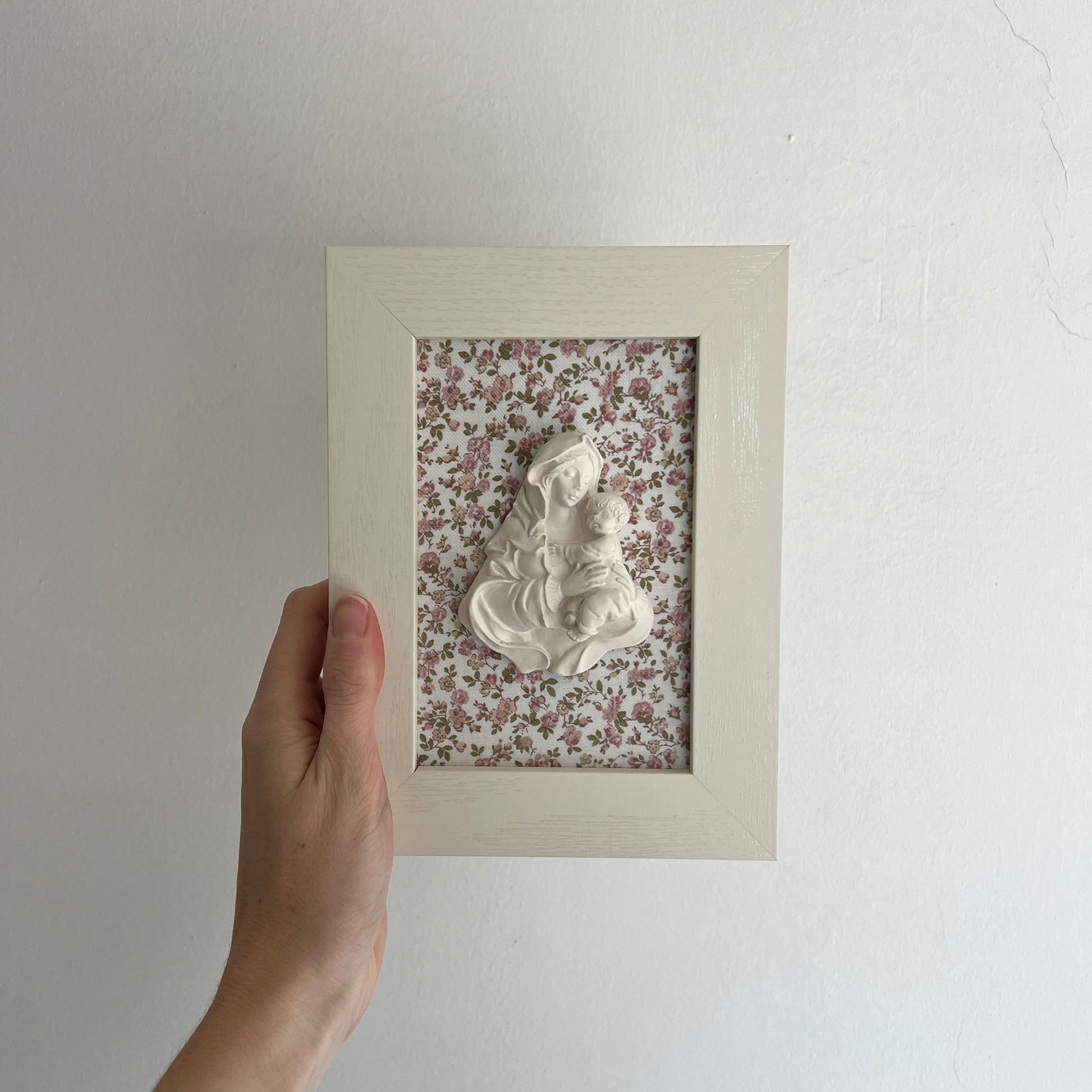 PRE-VENTA Cuadro Virgen de la Familia - Flores rosa empolvado (marco blanco) | Se enviará el miércoles 10 de diciembre