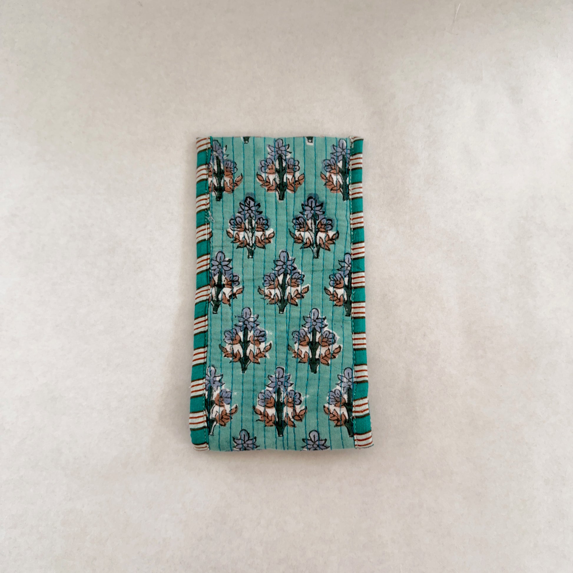 Funda de gafas SAPNA confeccionada en 100% algodón con estampado block print, fabricada en la India. Su formato rectangular y acolchado protege las gafas en el día a día y es fácil de llevar dentro del bolso.