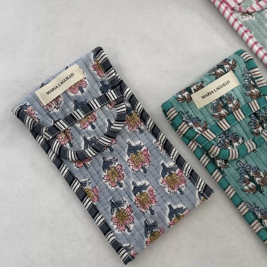 Funda de gafas TOPI confeccionada en 100% algodón con estampado block print, fabricada en la India. Su formato rectangular y acolchado protege las gafas en el día a día y es fácil de llevar dentro del bolso.