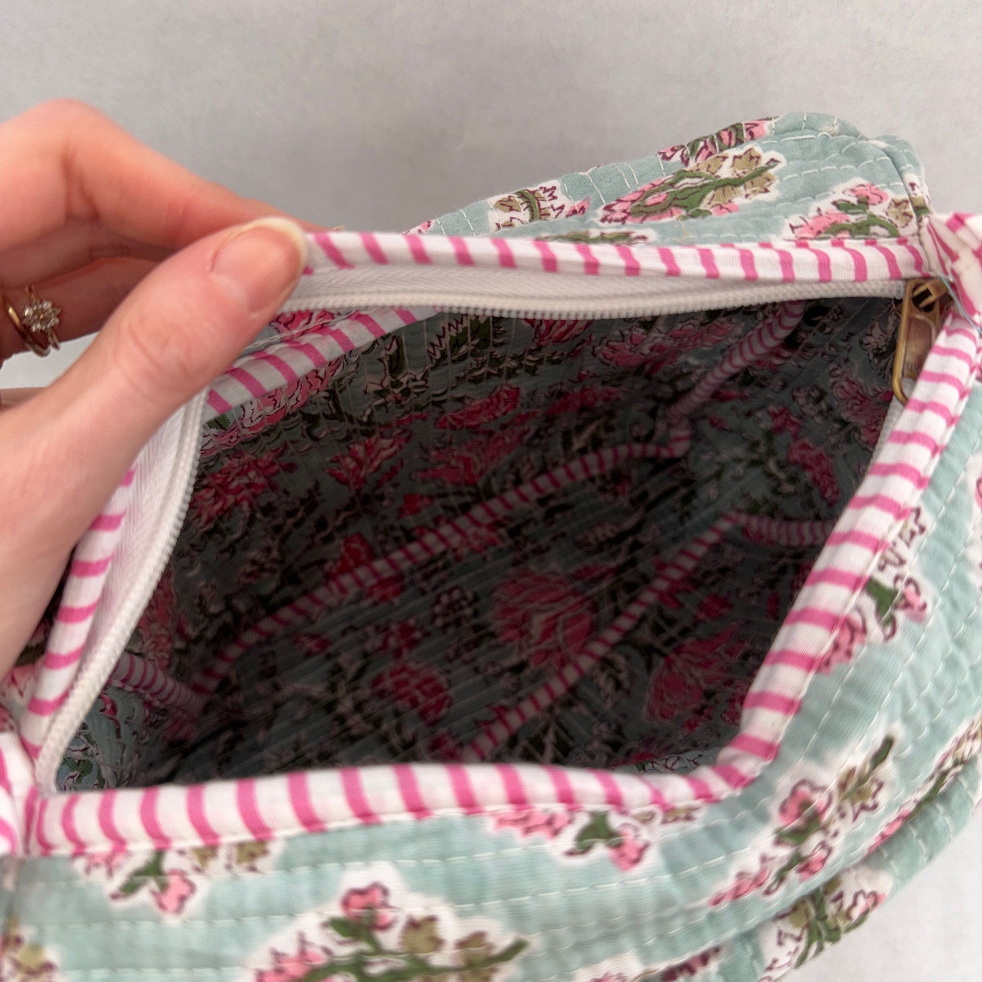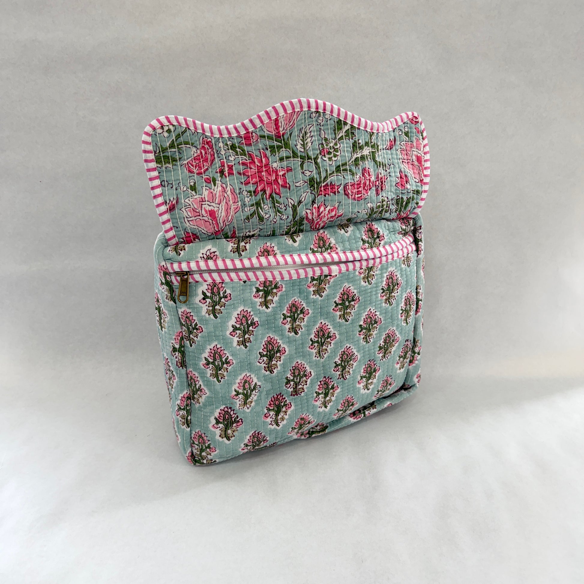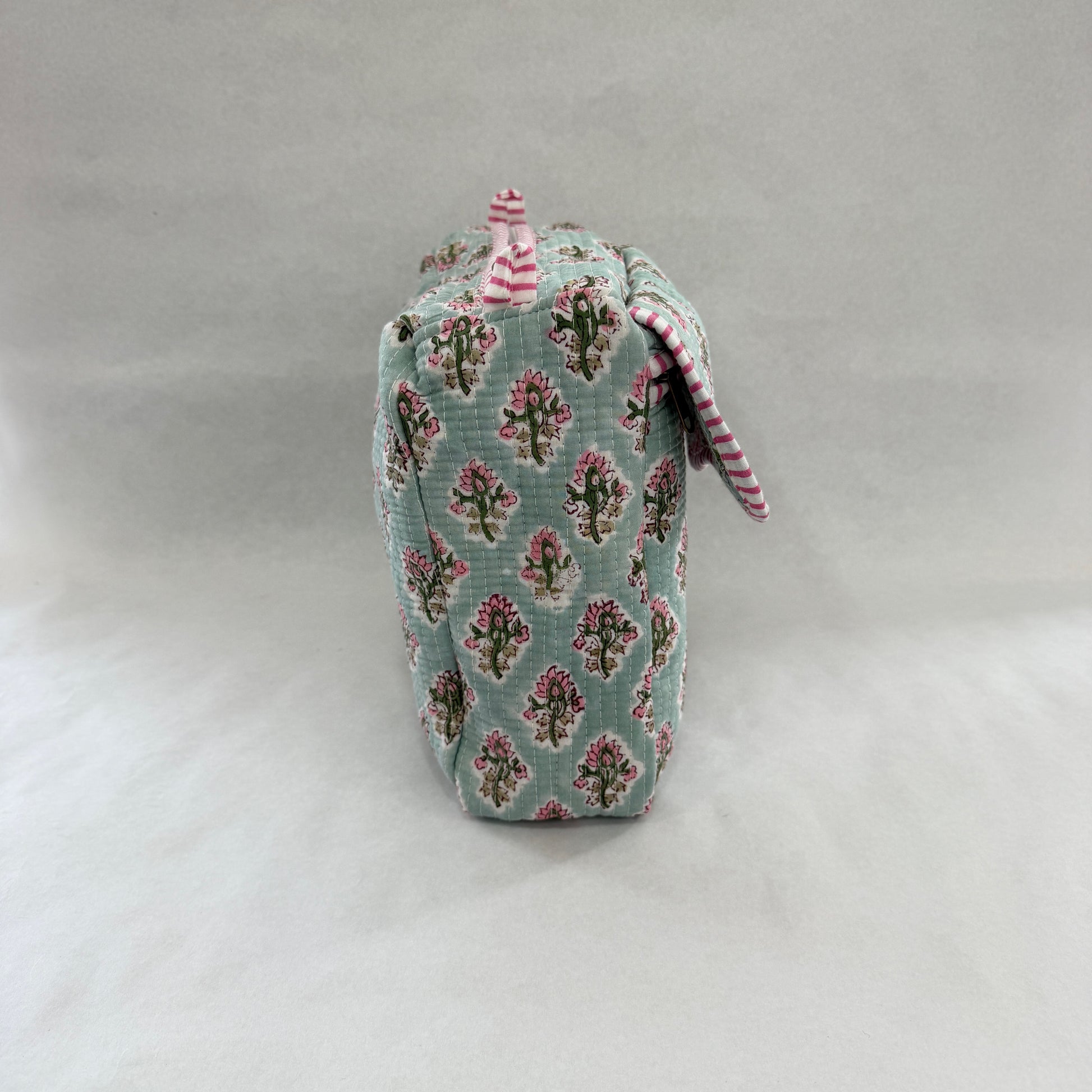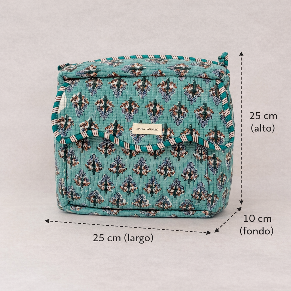 El Neceser EXTRA GRANDE AURAT es la opción ideal para quienes necesitan máxima capacidad sin renunciar al diseño. Confeccionado en 100% algodón y fabricado artesanalmente en la India, destaca por su elegante estampado block print, que convierte cada pieza en un producto único.