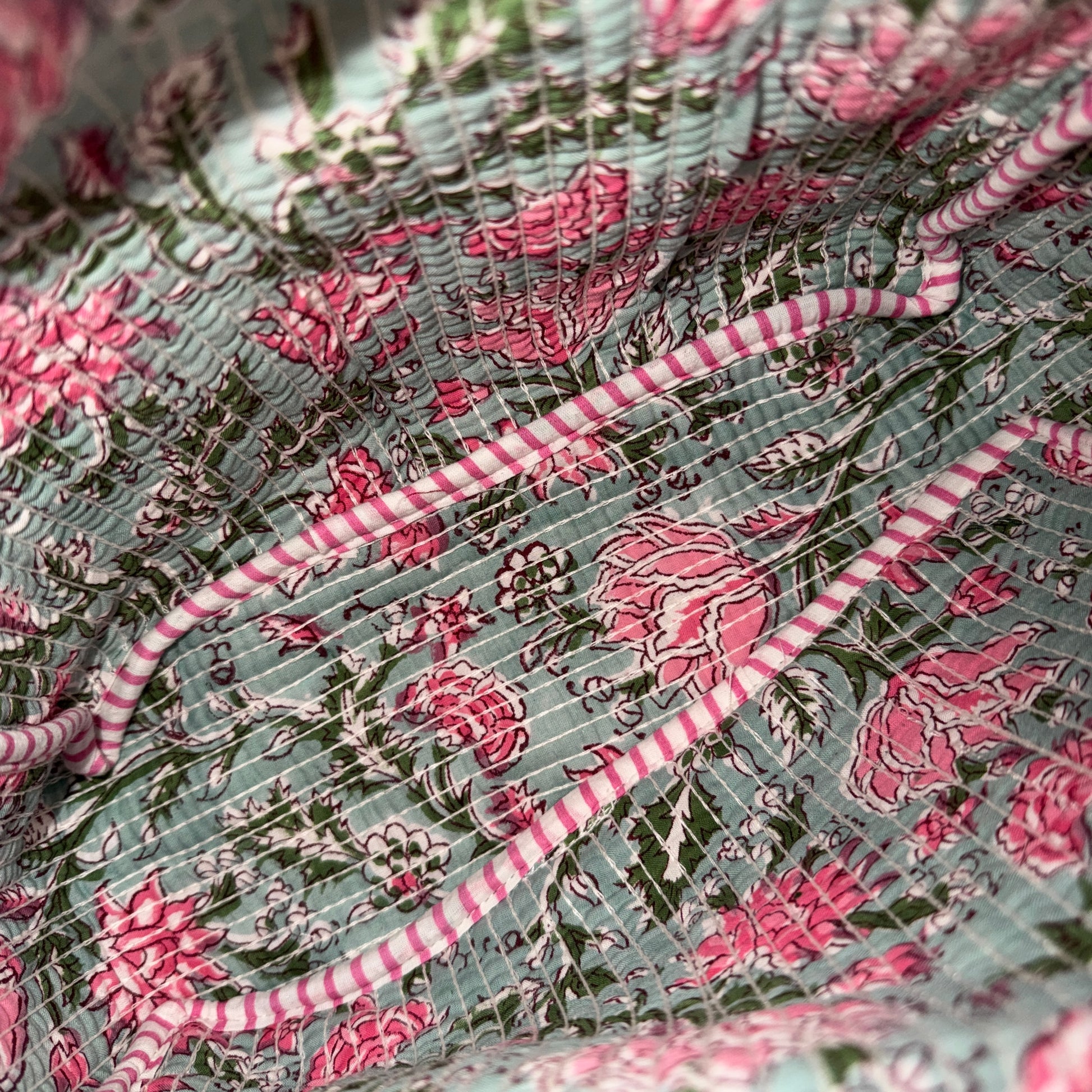 Tanto el exterior como el interior están realizados en estampados diferentes, cuidadosamente combinados para crear un contraste armonioso y especial, manteniendo la esencia artesanal de la pieza.