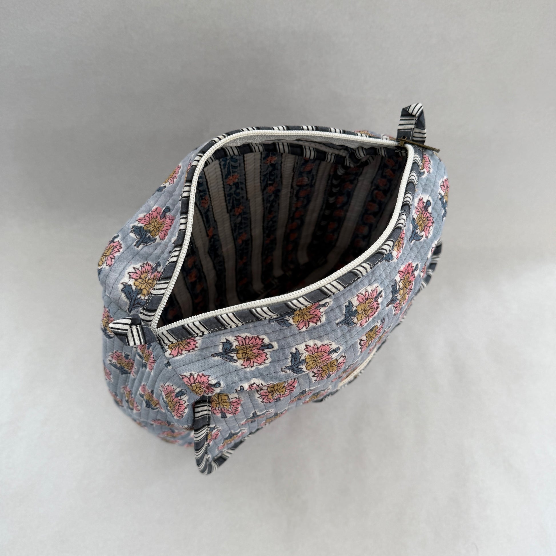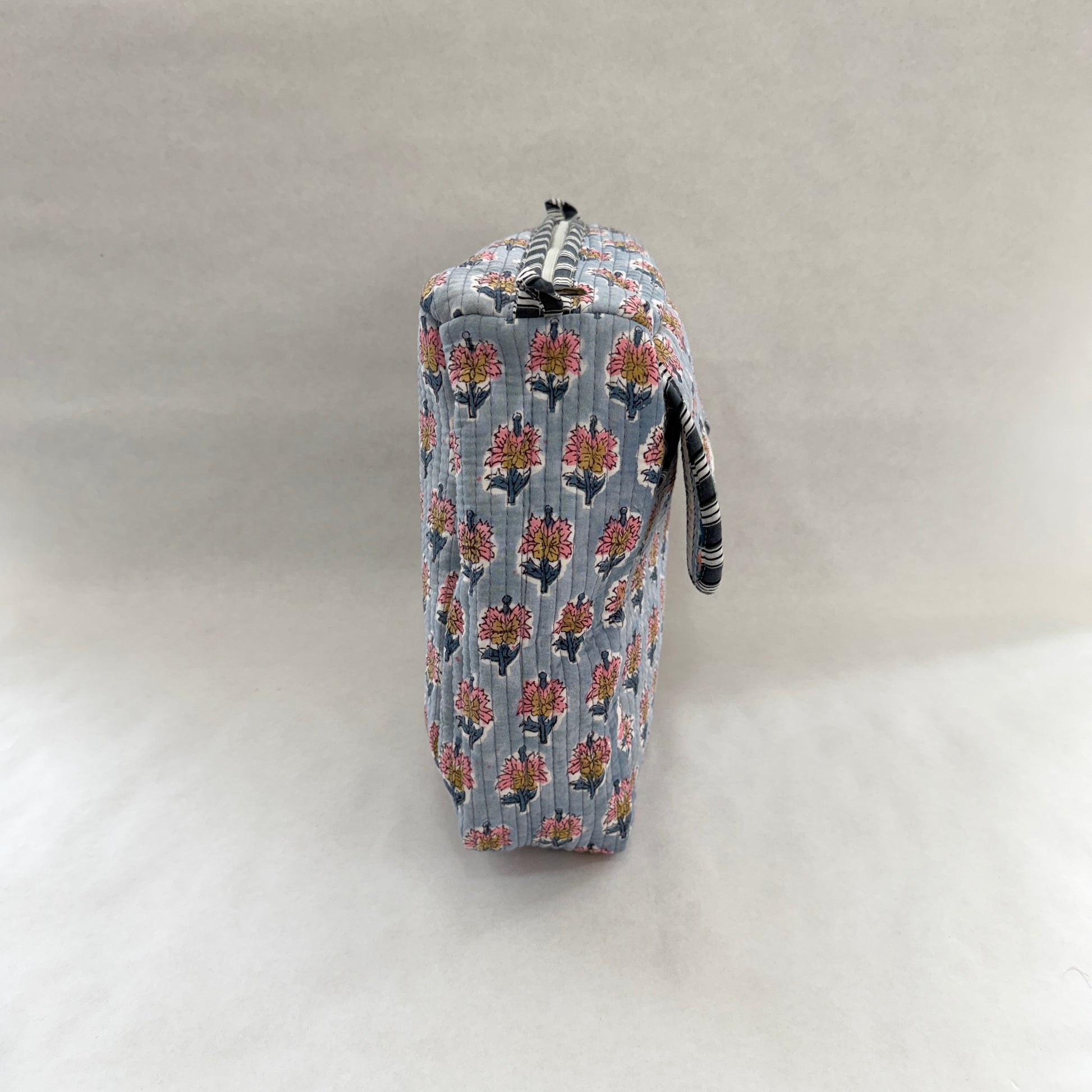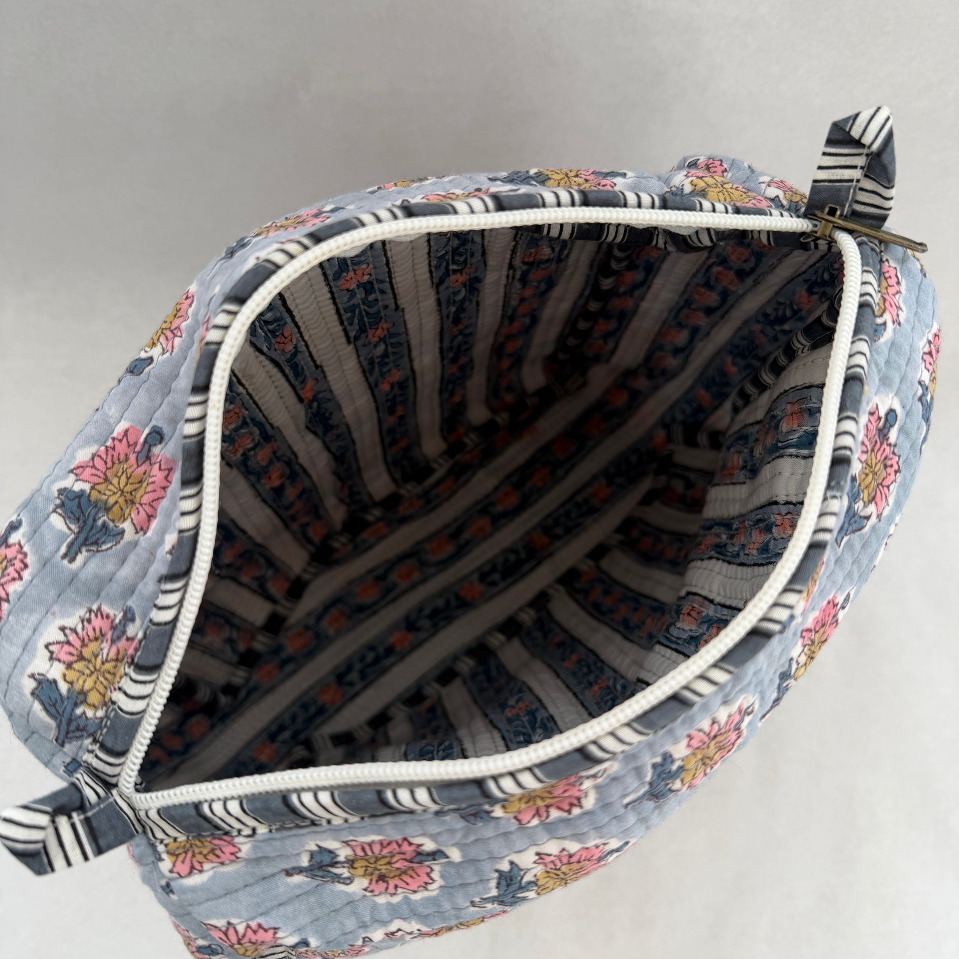 El Neceser EXTRA GRANDE PYAAS es la opción ideal para quienes necesitan máxima capacidad sin renunciar al diseño. Confeccionado en 100% algodón y fabricado artesanalmente en la India, destaca por su elegante estampado block print, que convierte cada pieza en un producto único.