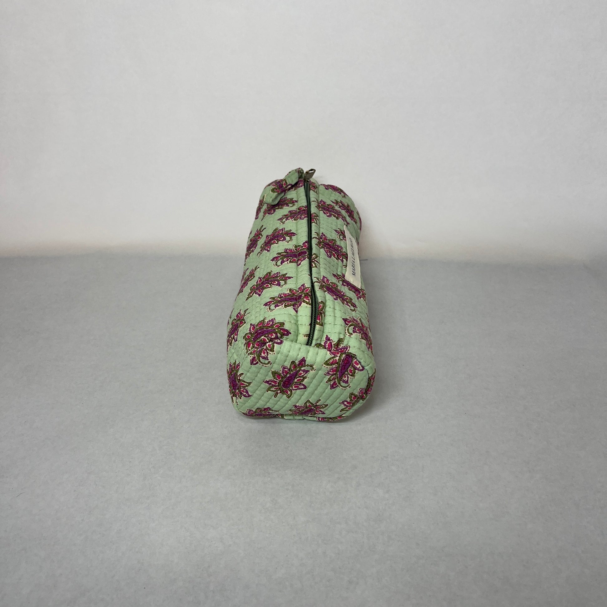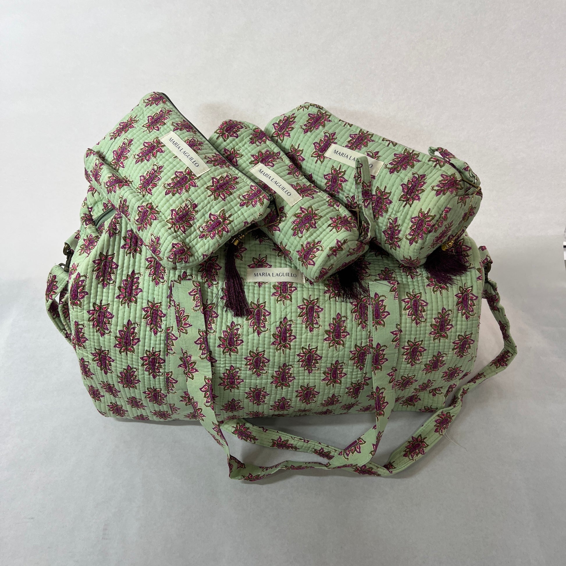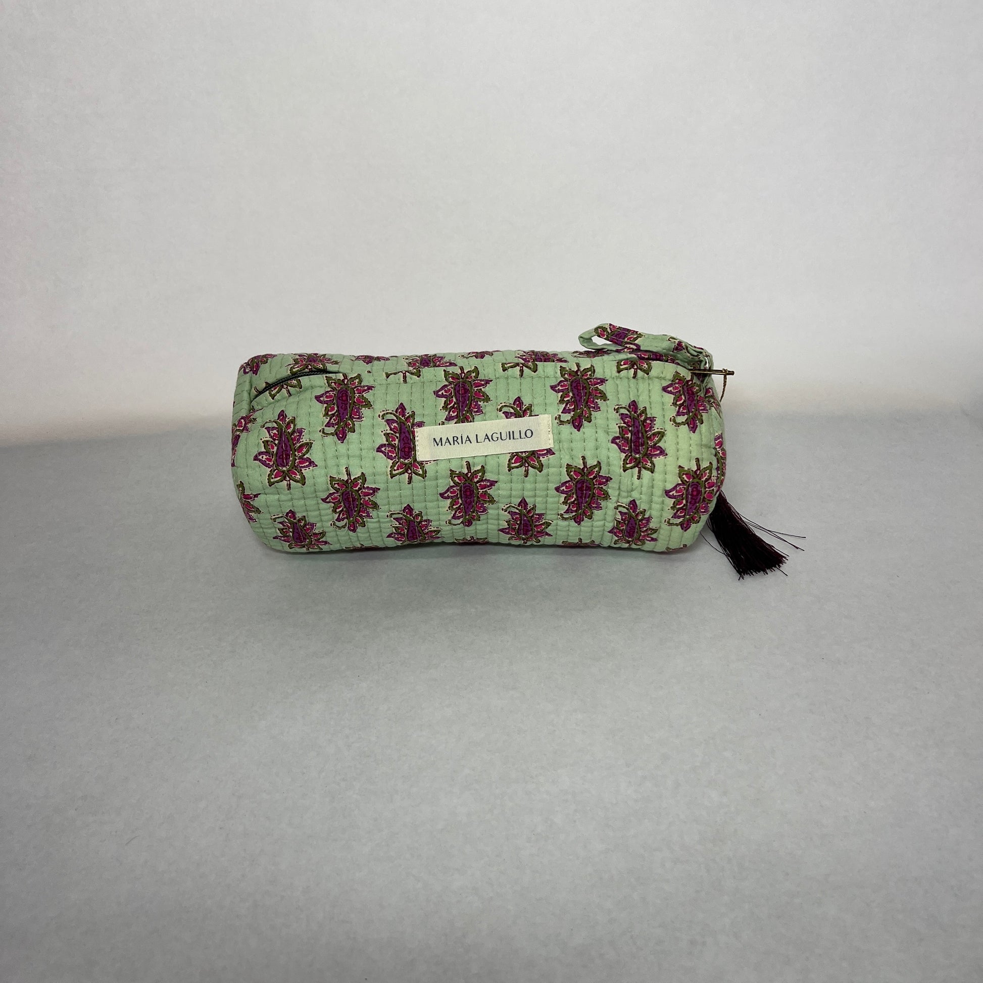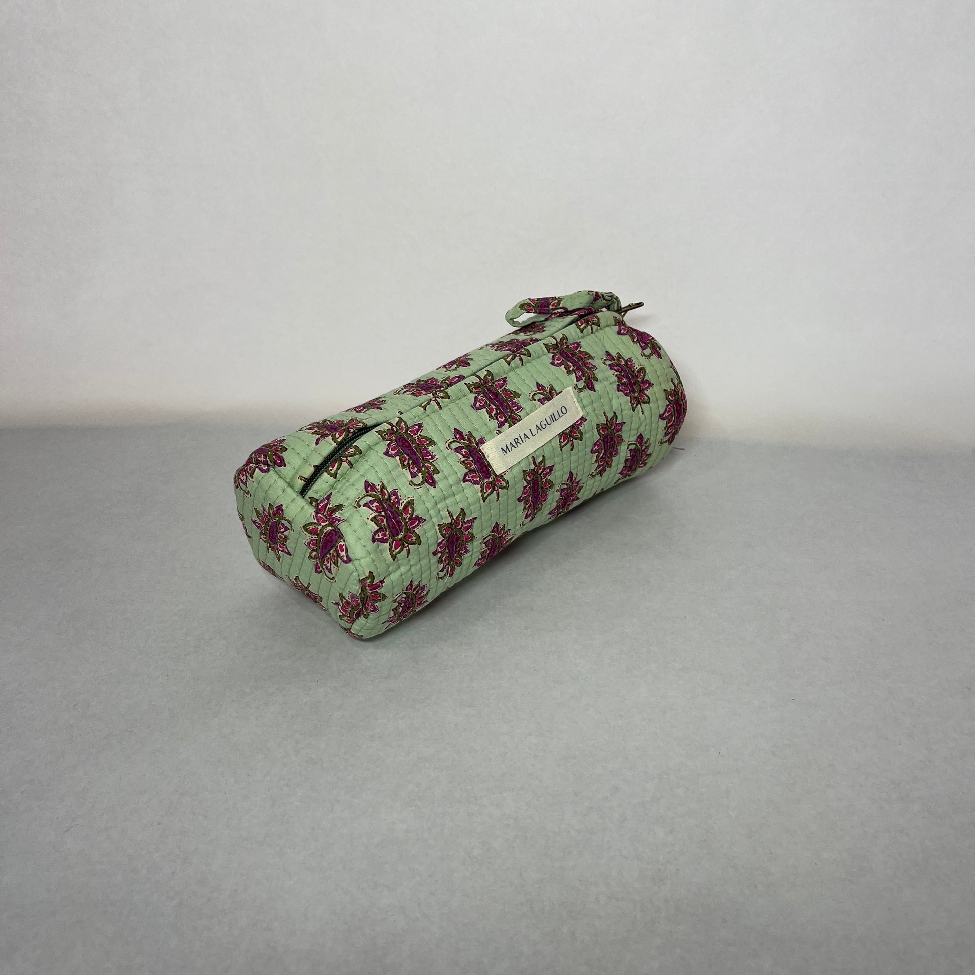Neceser L AVNI de tela "block print", tiene forma cilíndrica.