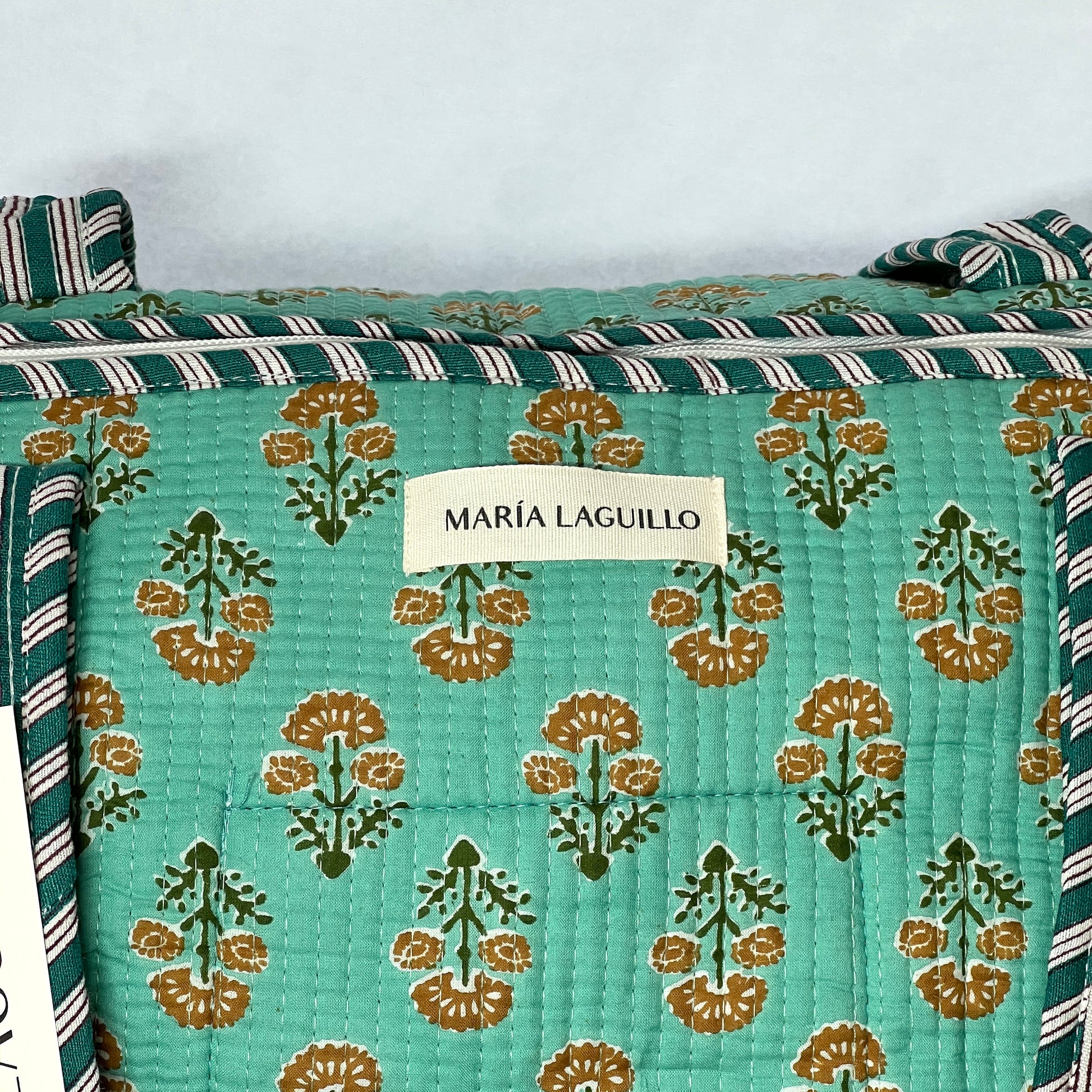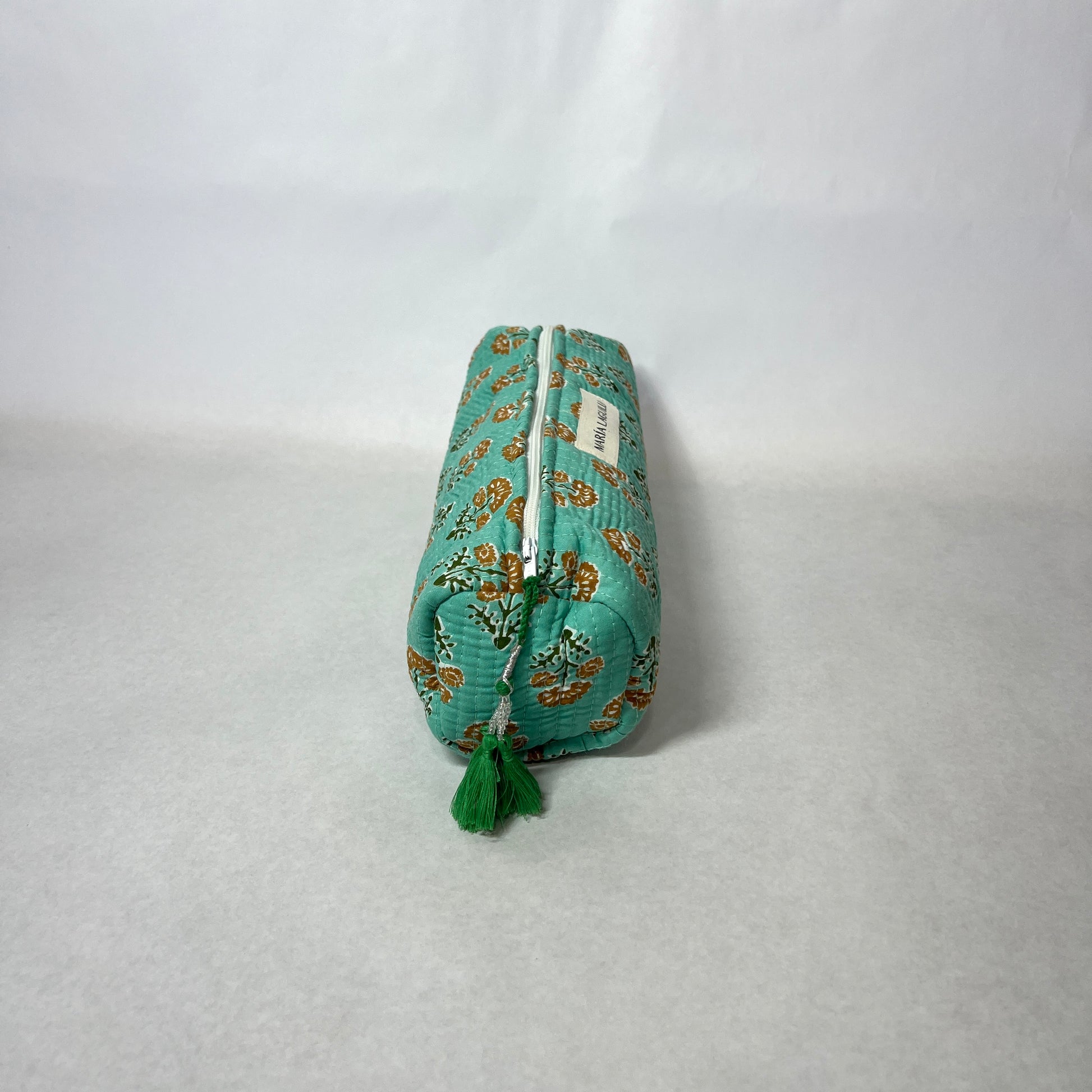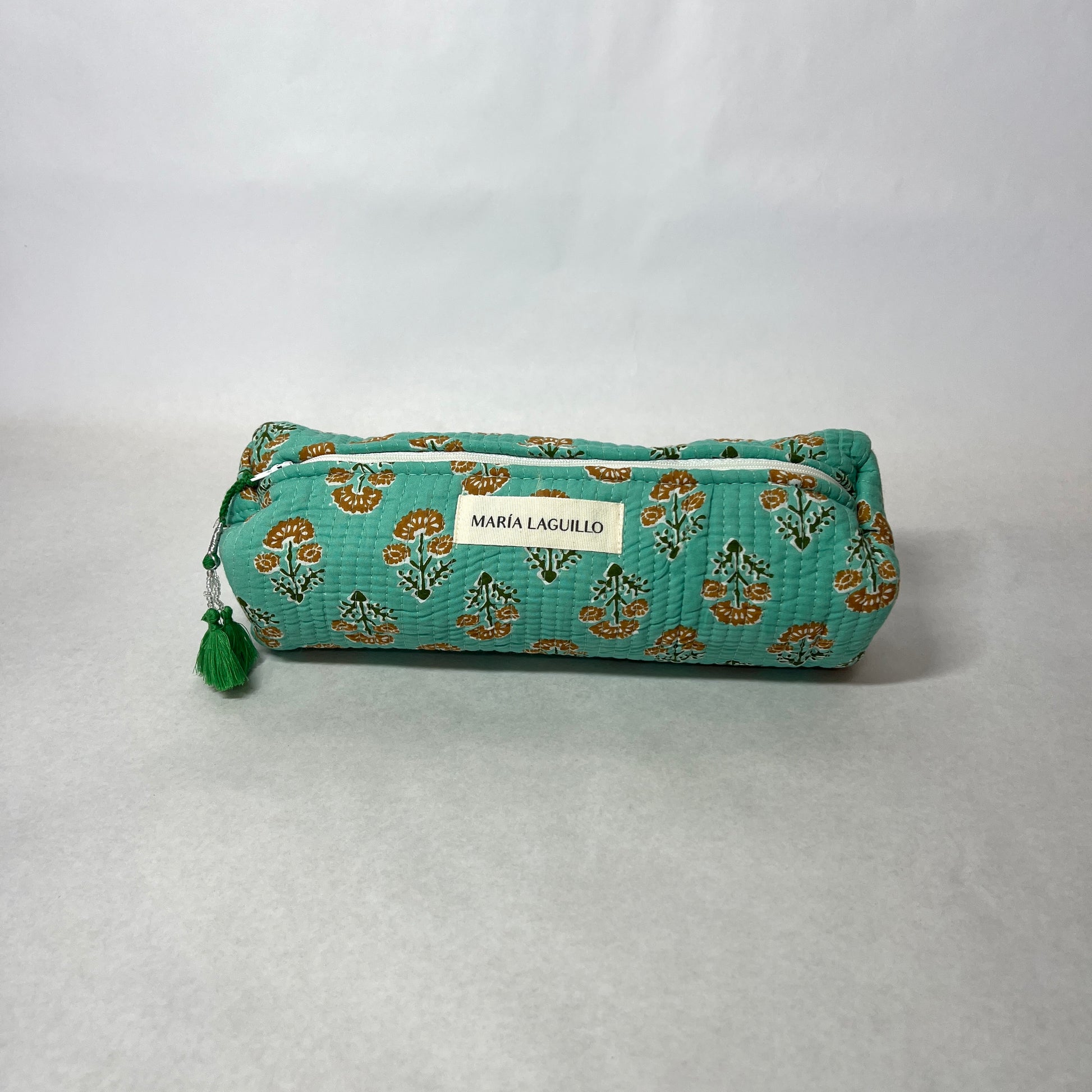 Neceser L PRIVI de tela "block print", tiene forma cilíndrica.