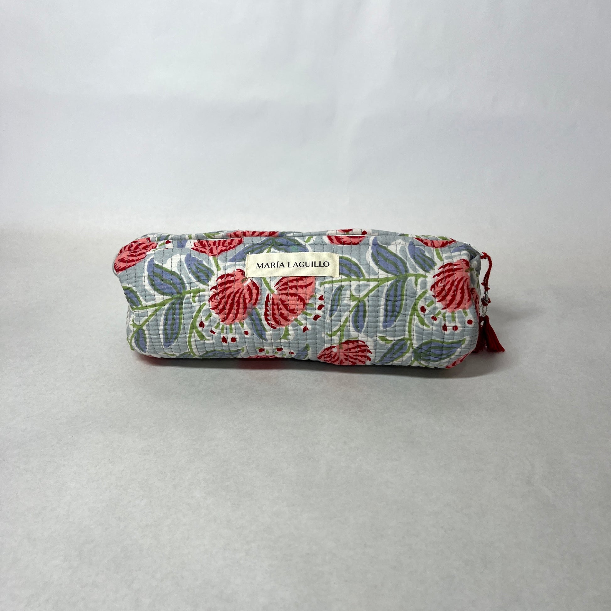 Neceser L PUSHPIKA de tela "block print", tiene forma cilíndrica.