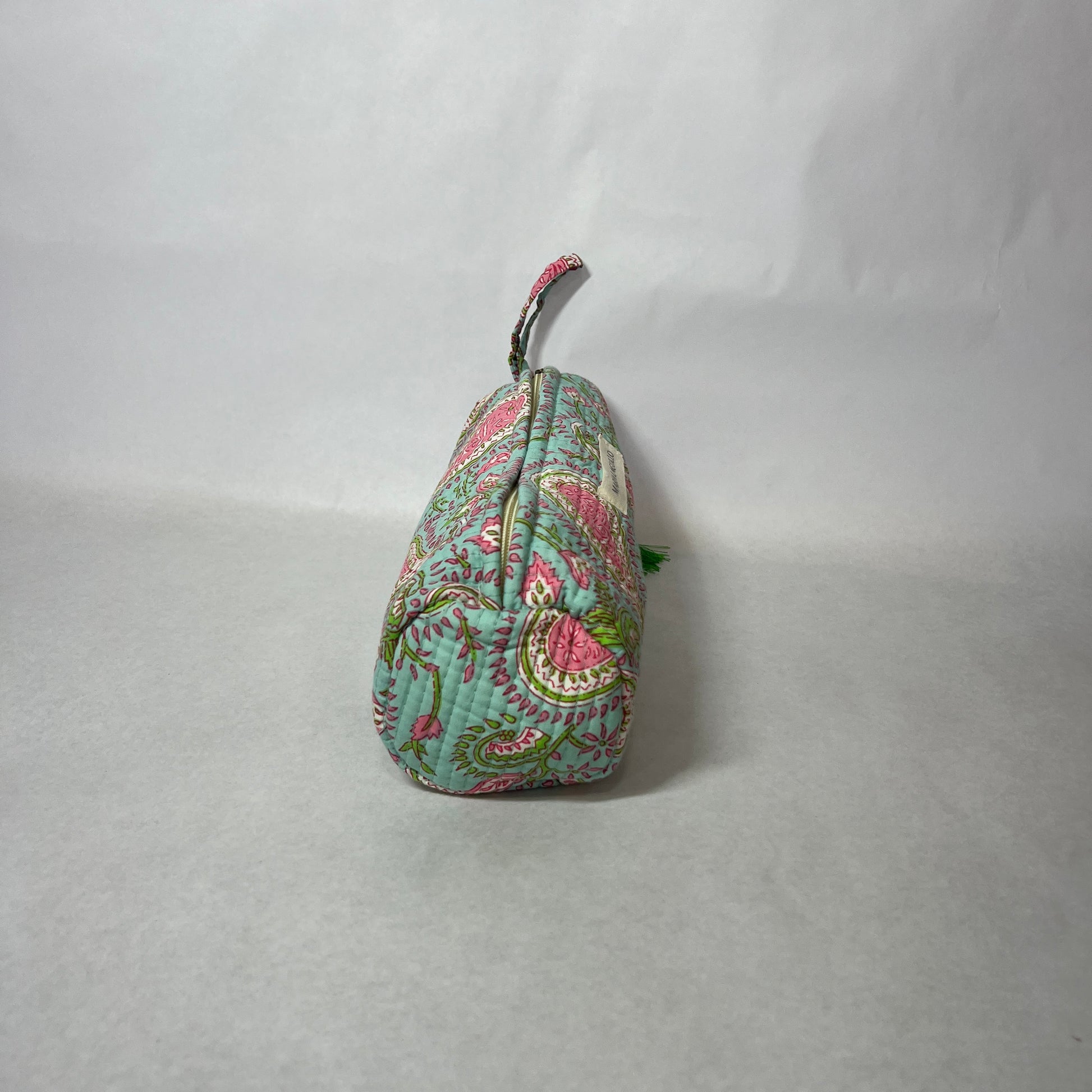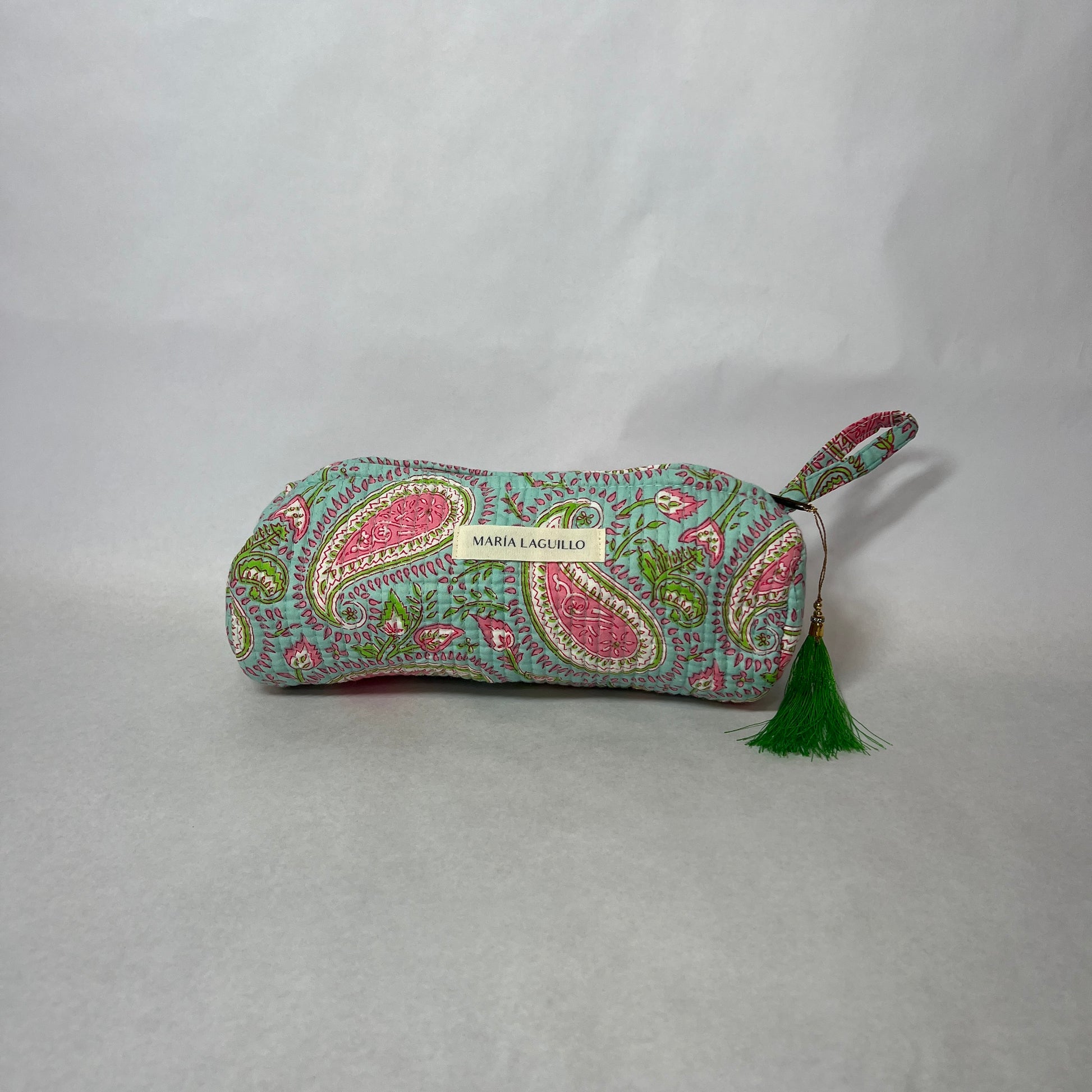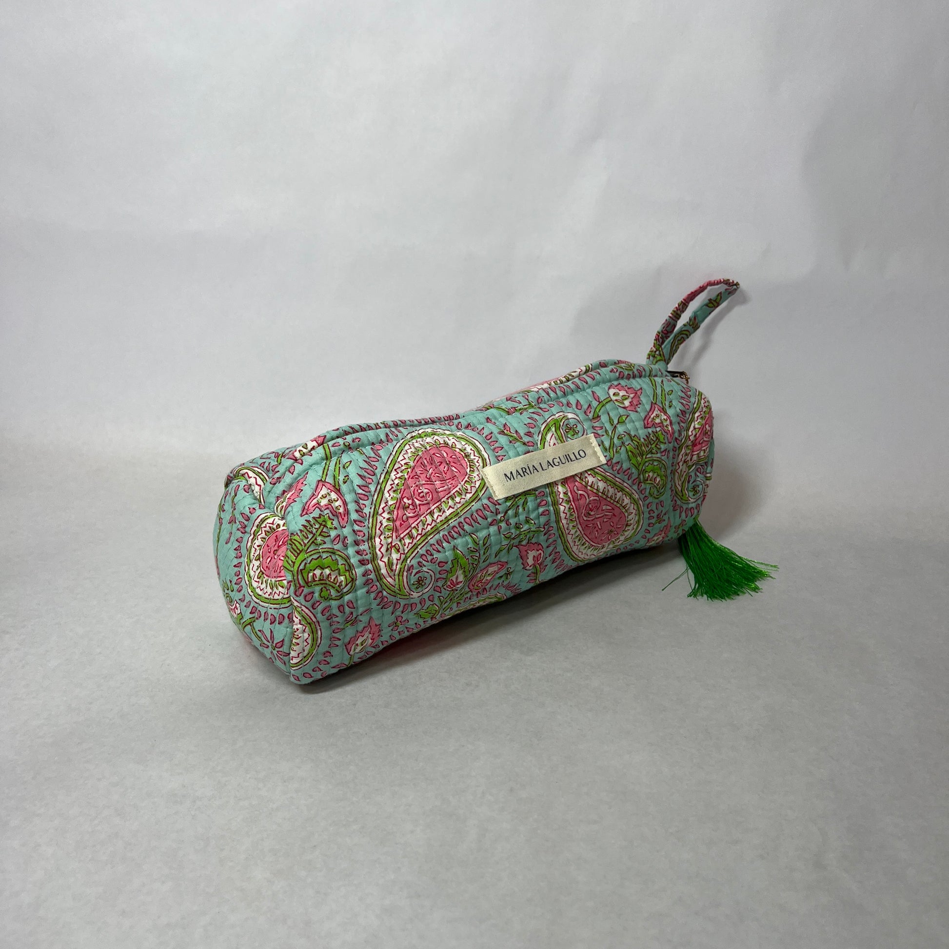 Neceser L KAYI de tela "block print", tiene forma cilíndrica.