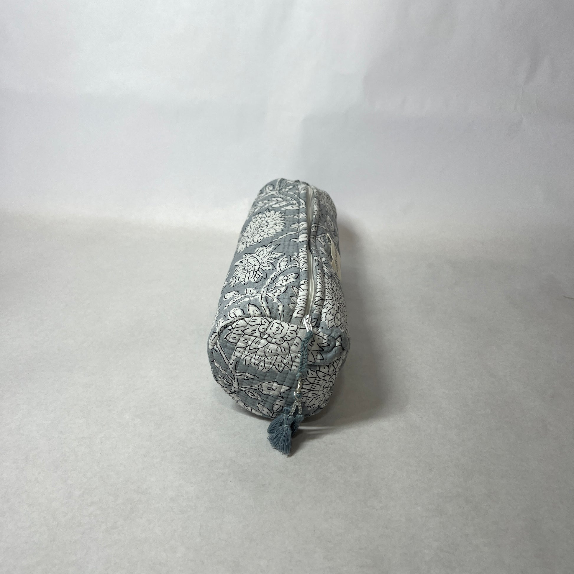 Neceser L KIARA de tela "block print", tiene forma cilíndrica.