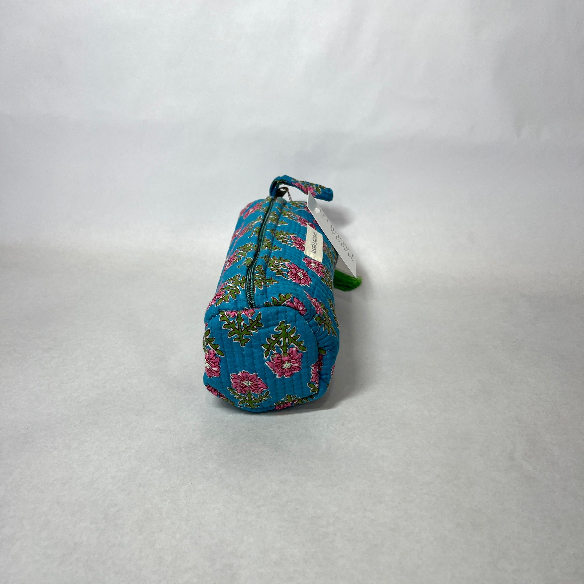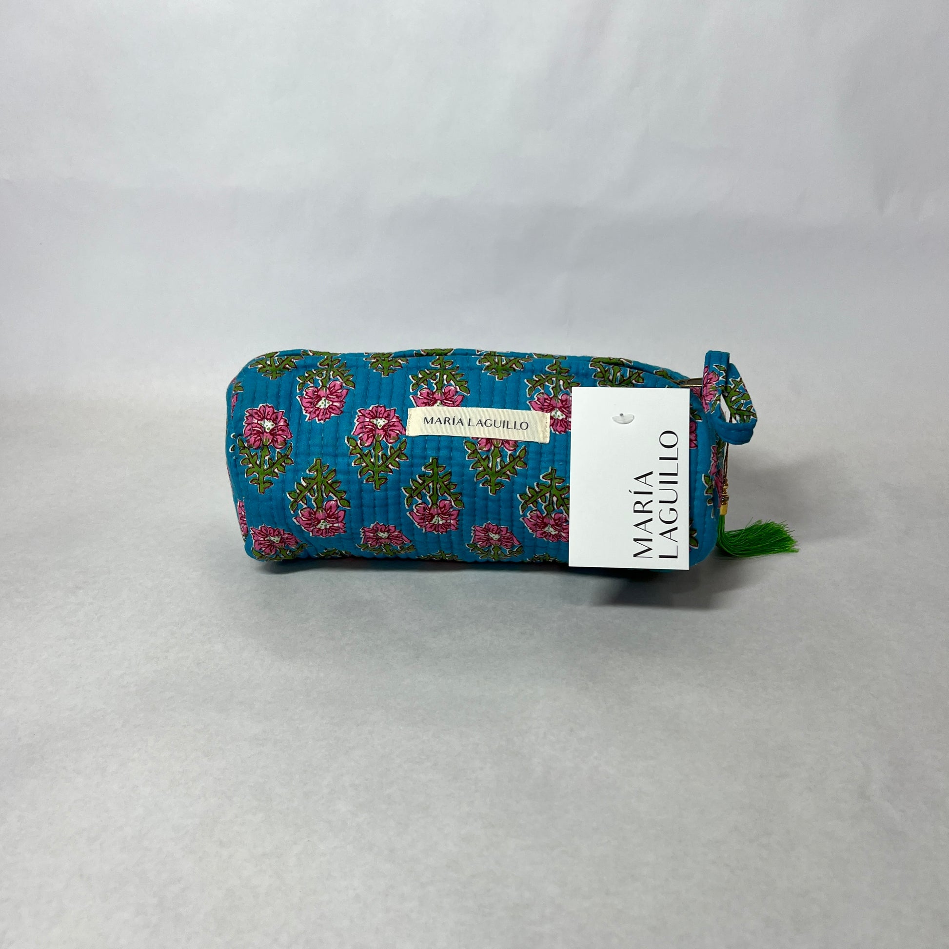 Neceser L LAJU de tela "block print", tiene forma cilíndrica.