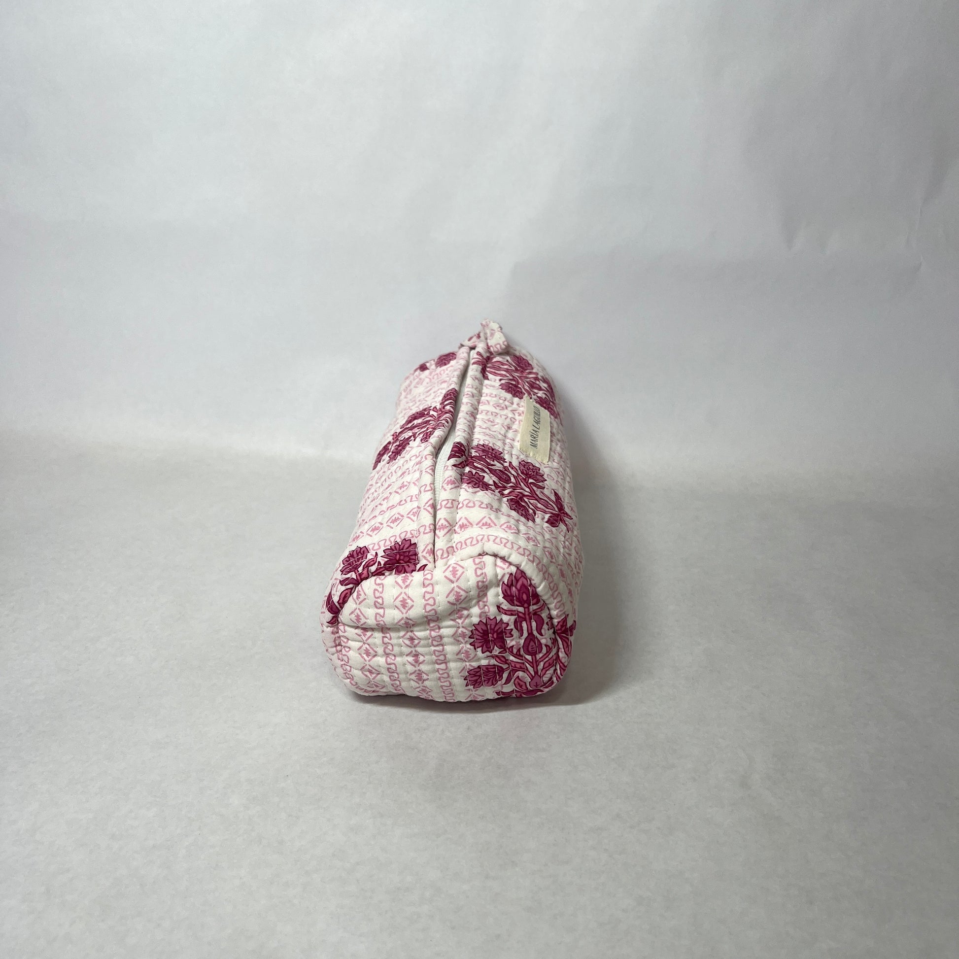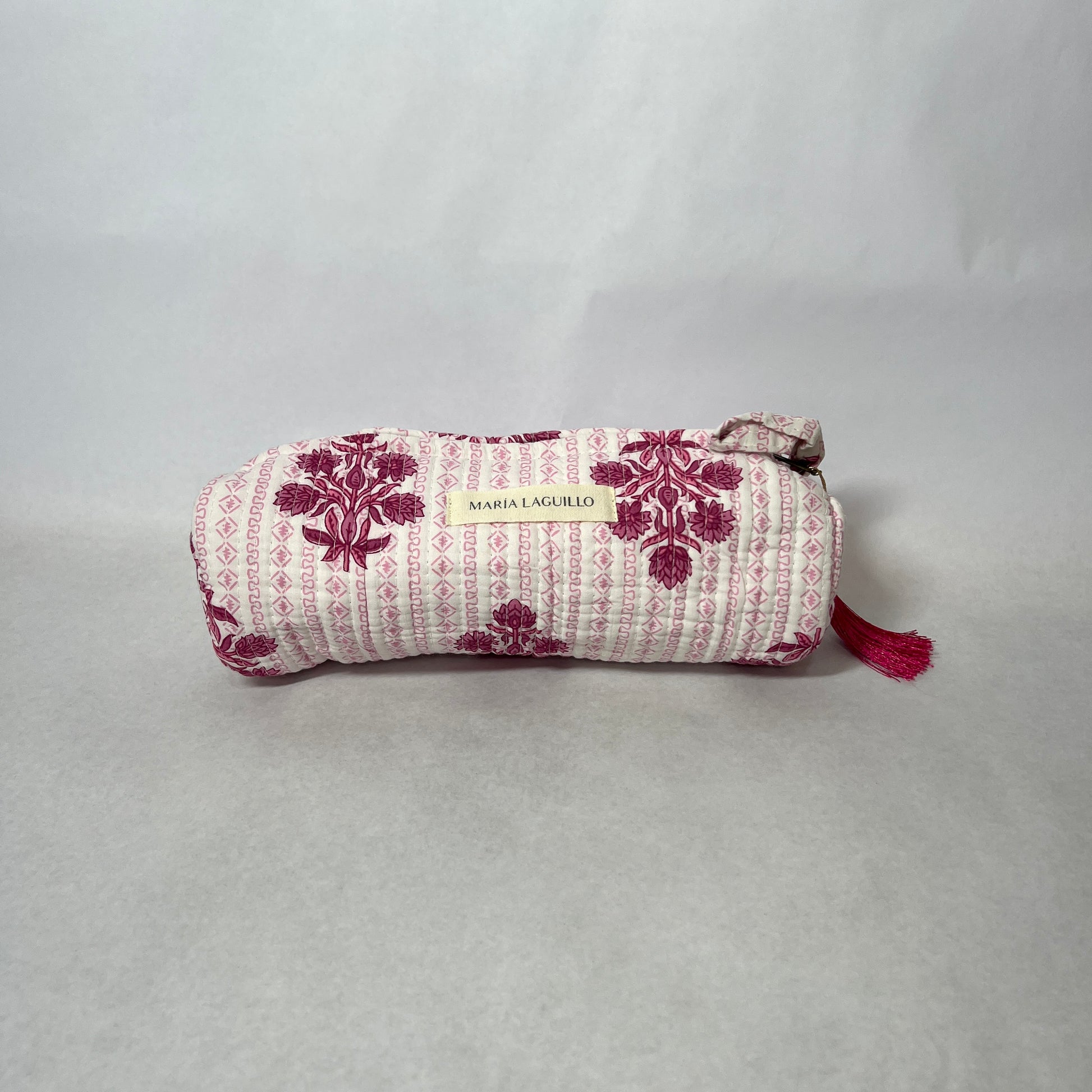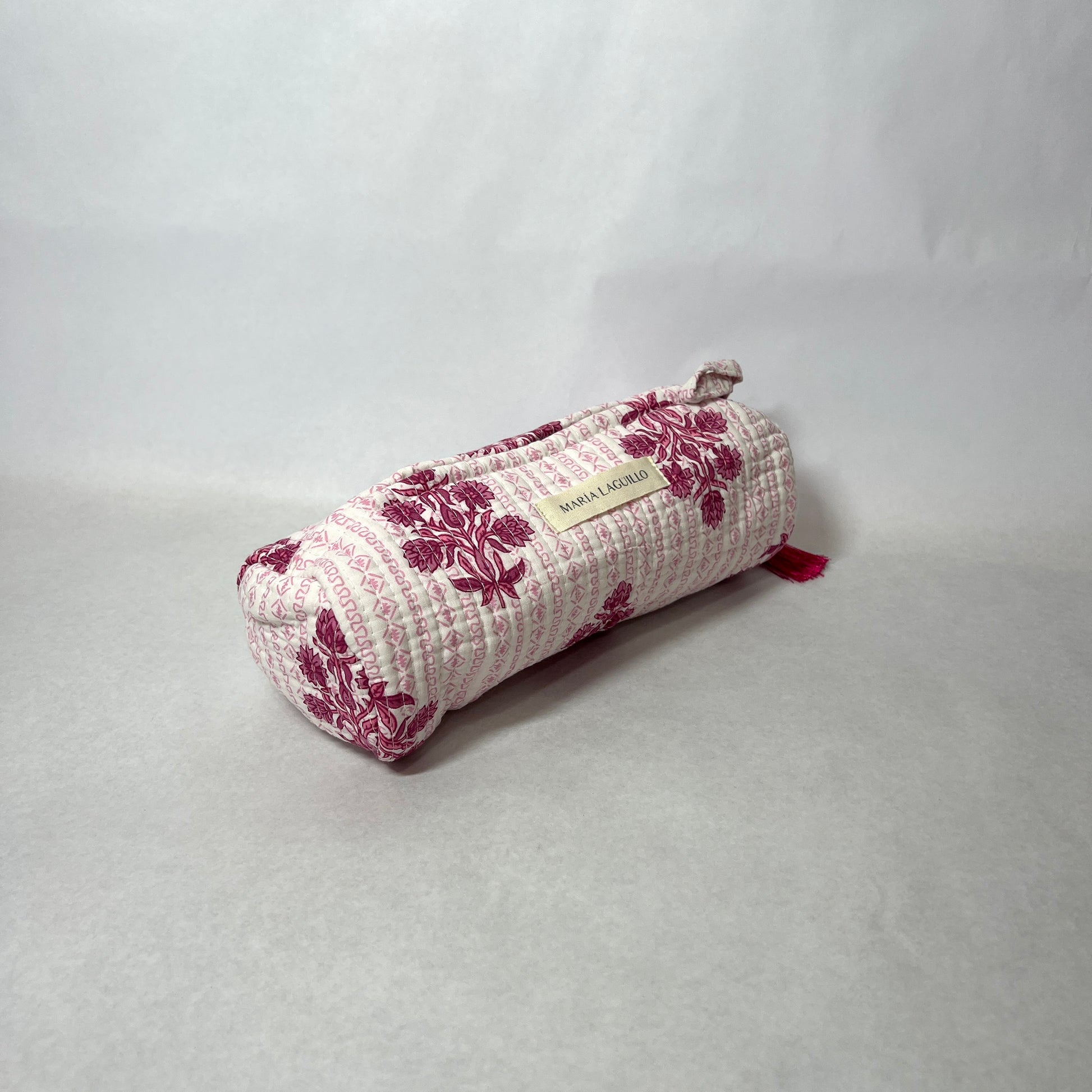 Neceser L MATTVA de tela "block print", tiene forma cilíndrica.