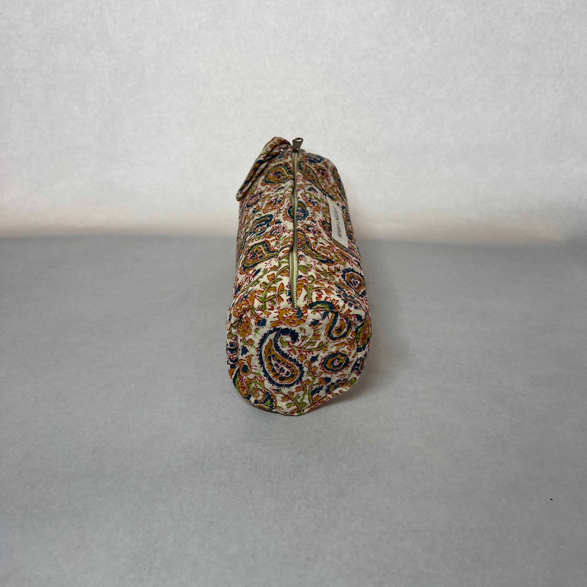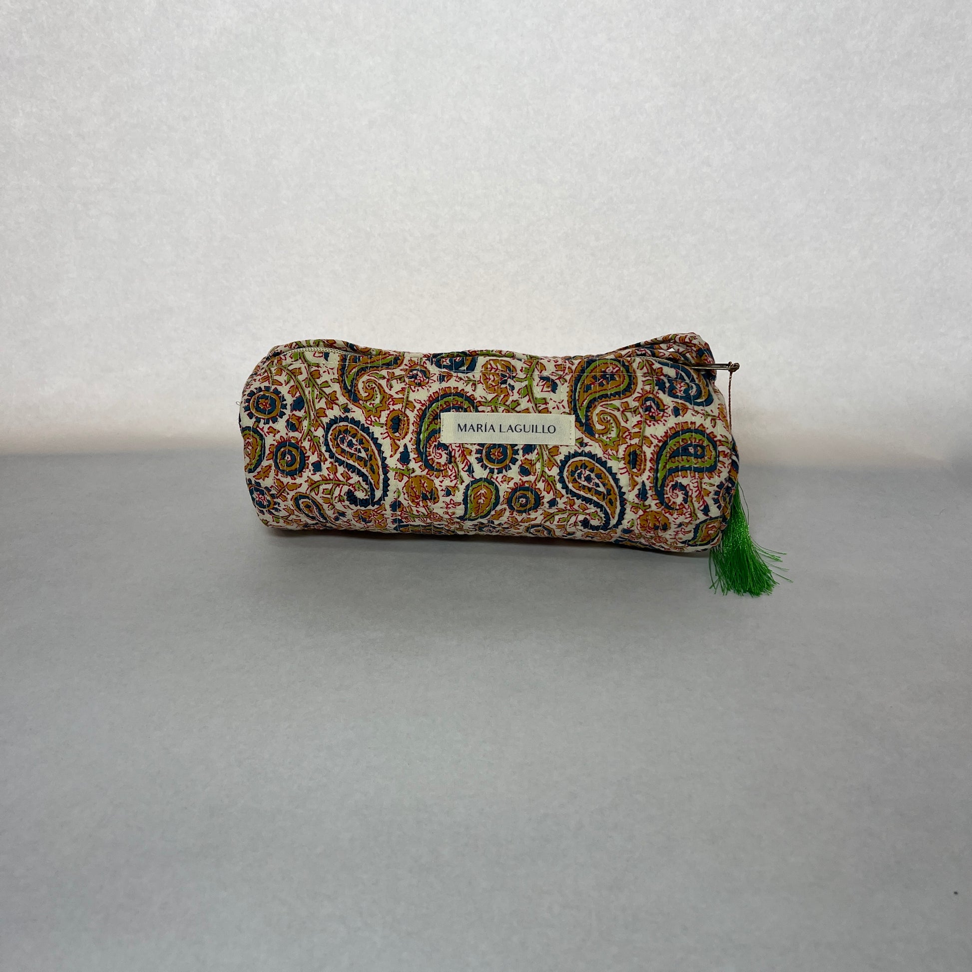 Neceser L NIRMA de tela "block print", tiene forma cilíndrica.