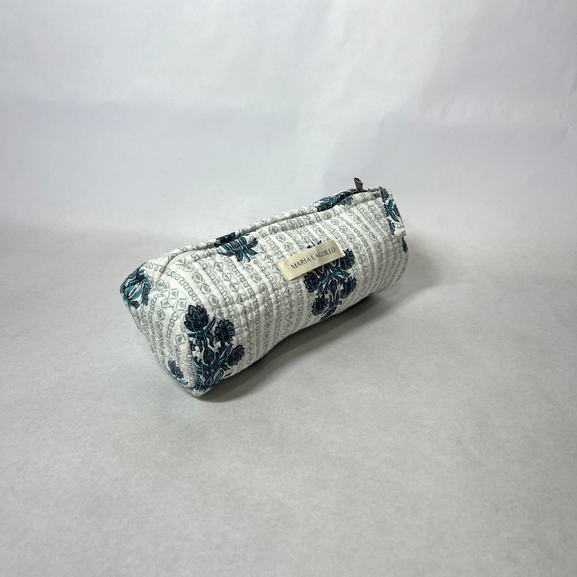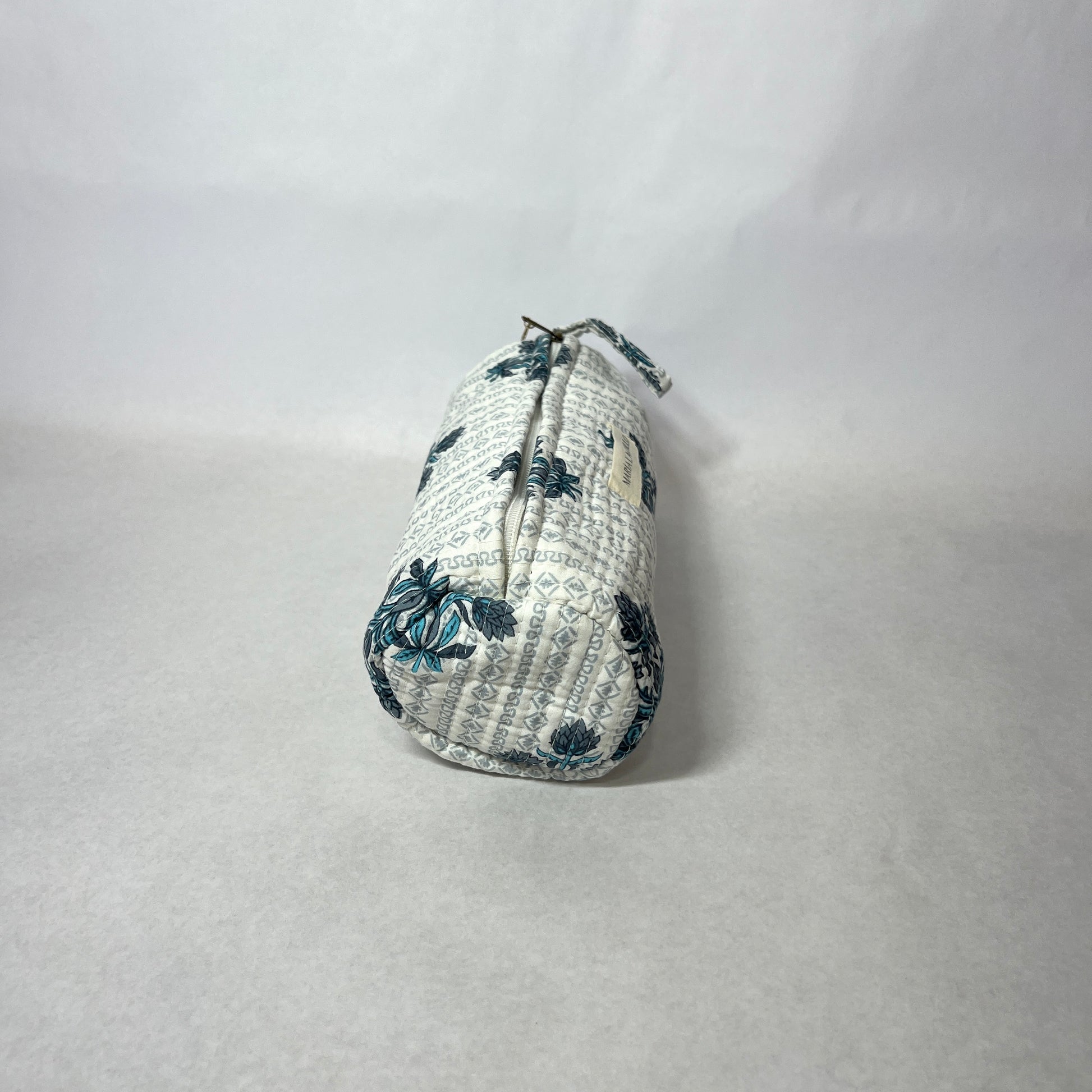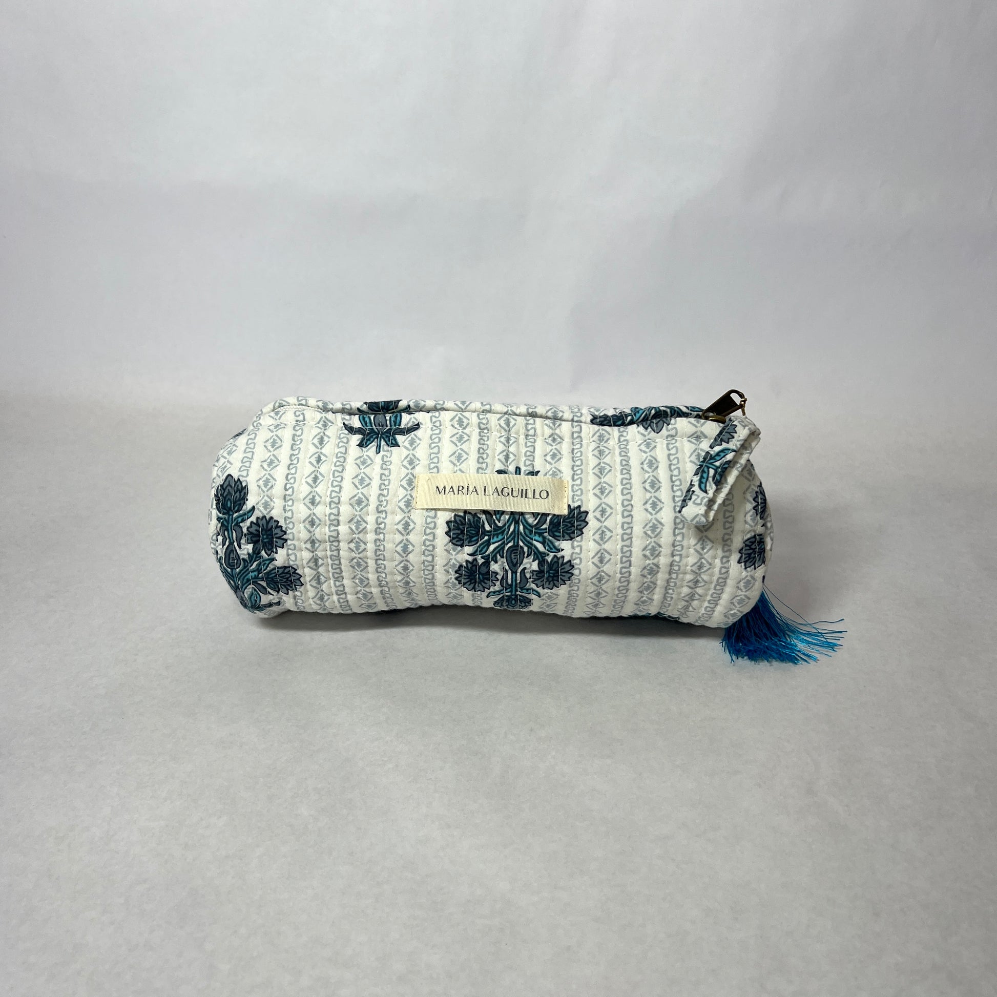 Neceser L SATTVA de tela "block print", tiene forma cilíndrica.
