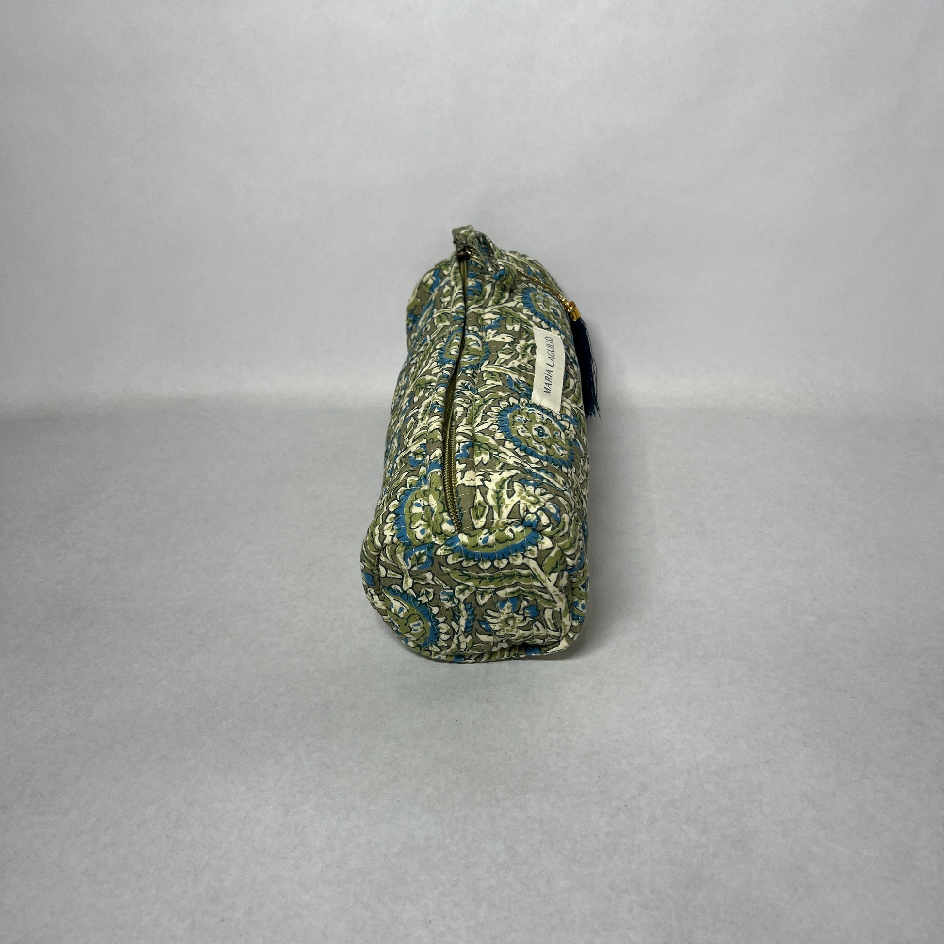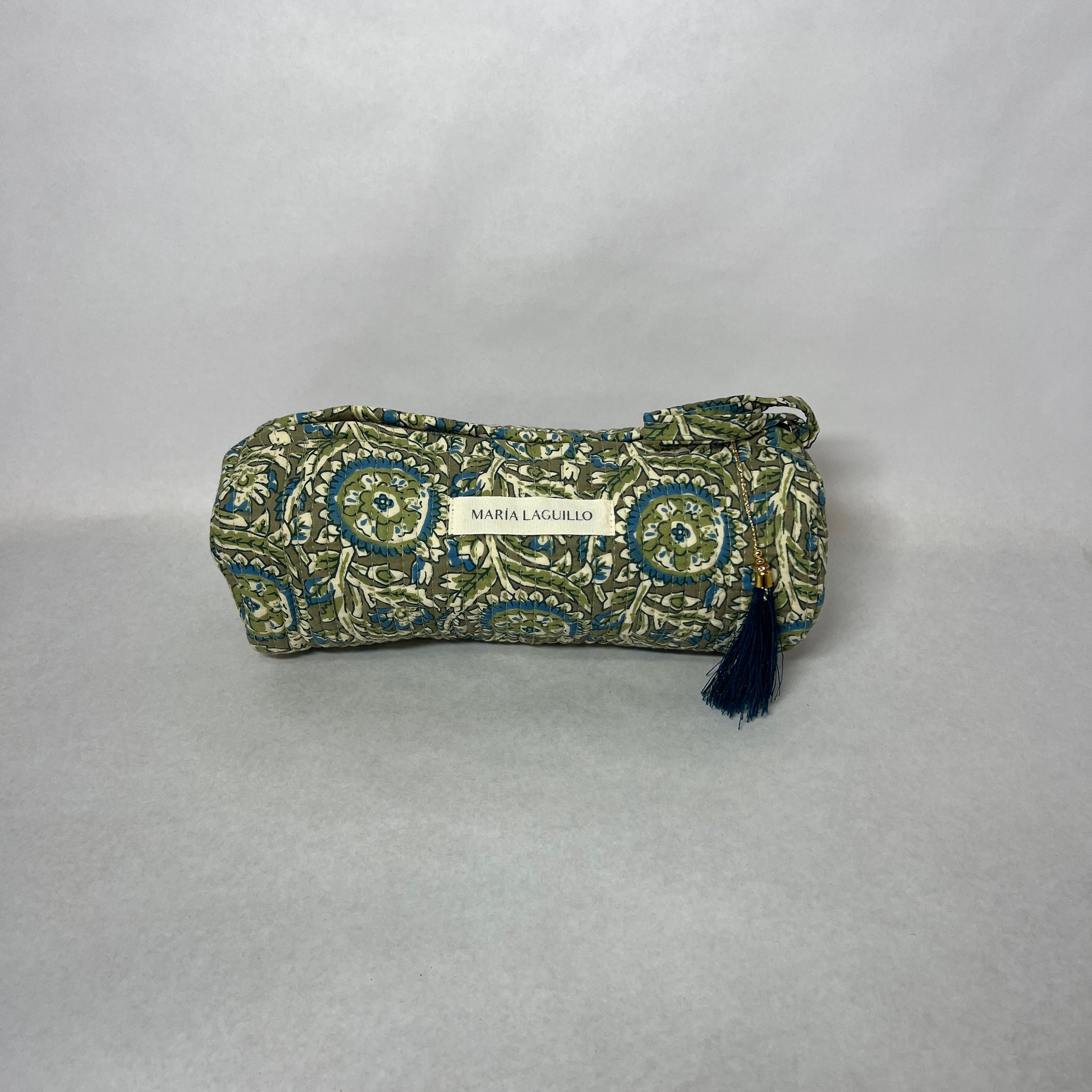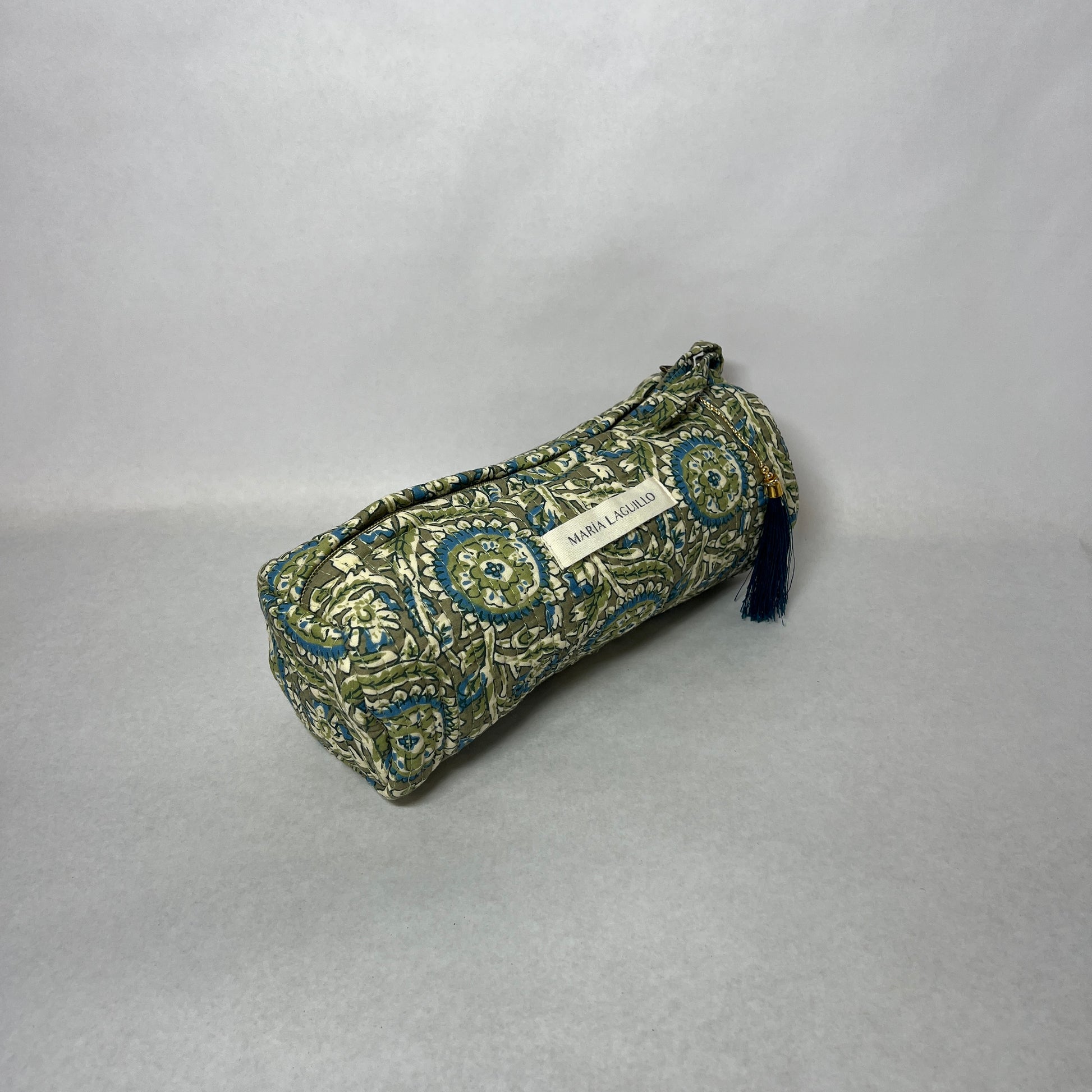 Neceser L TARANI de tela "block print", tiene forma cilíndrica.