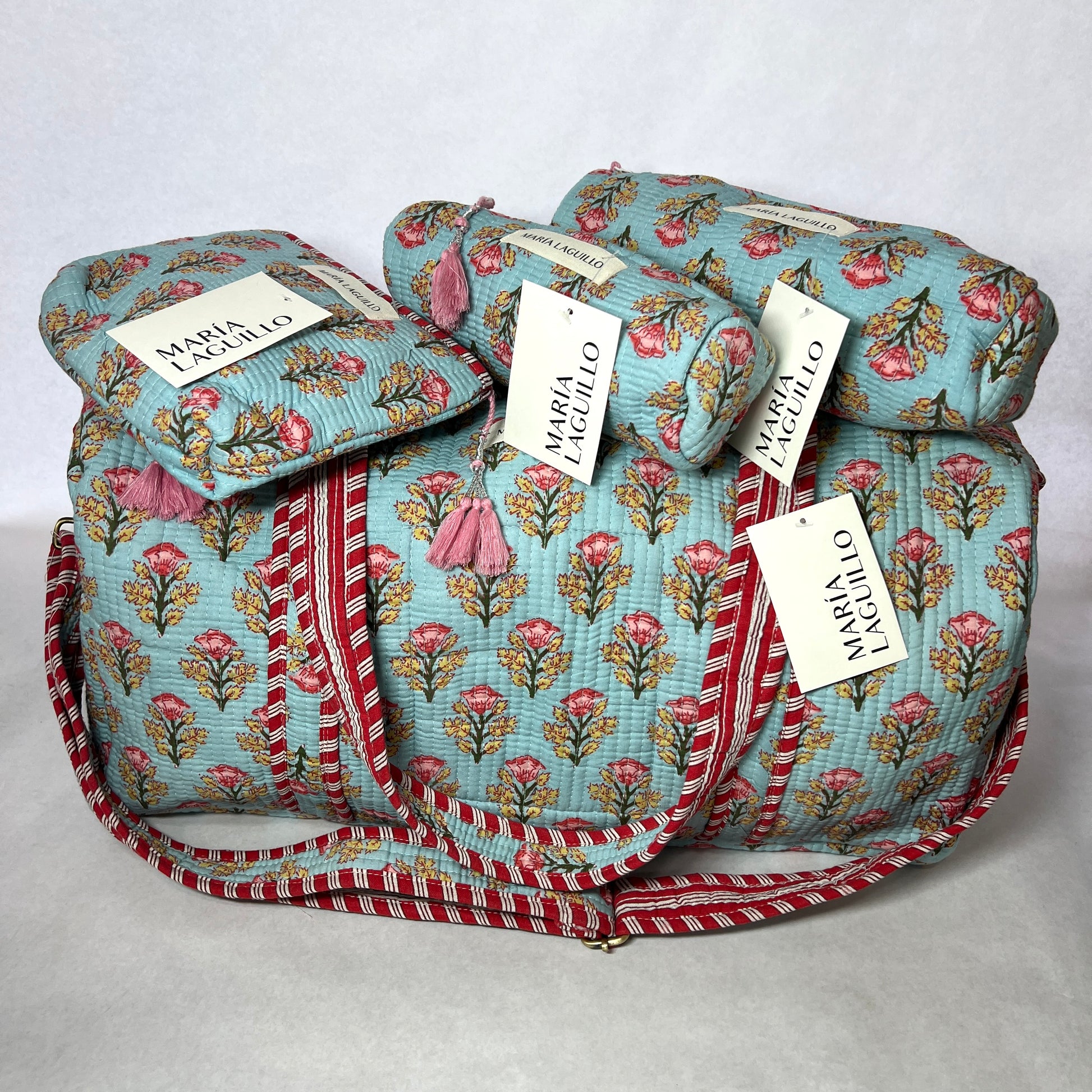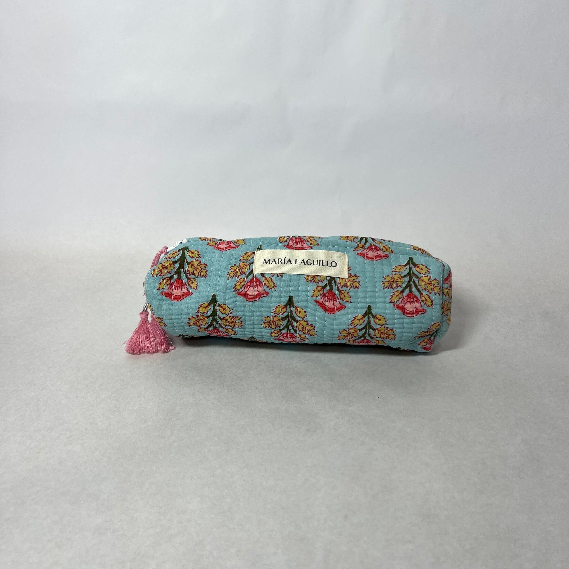 Neceser S SEVA de tela "block print", tiene forma cilíndrica. Forro interior impermeable.