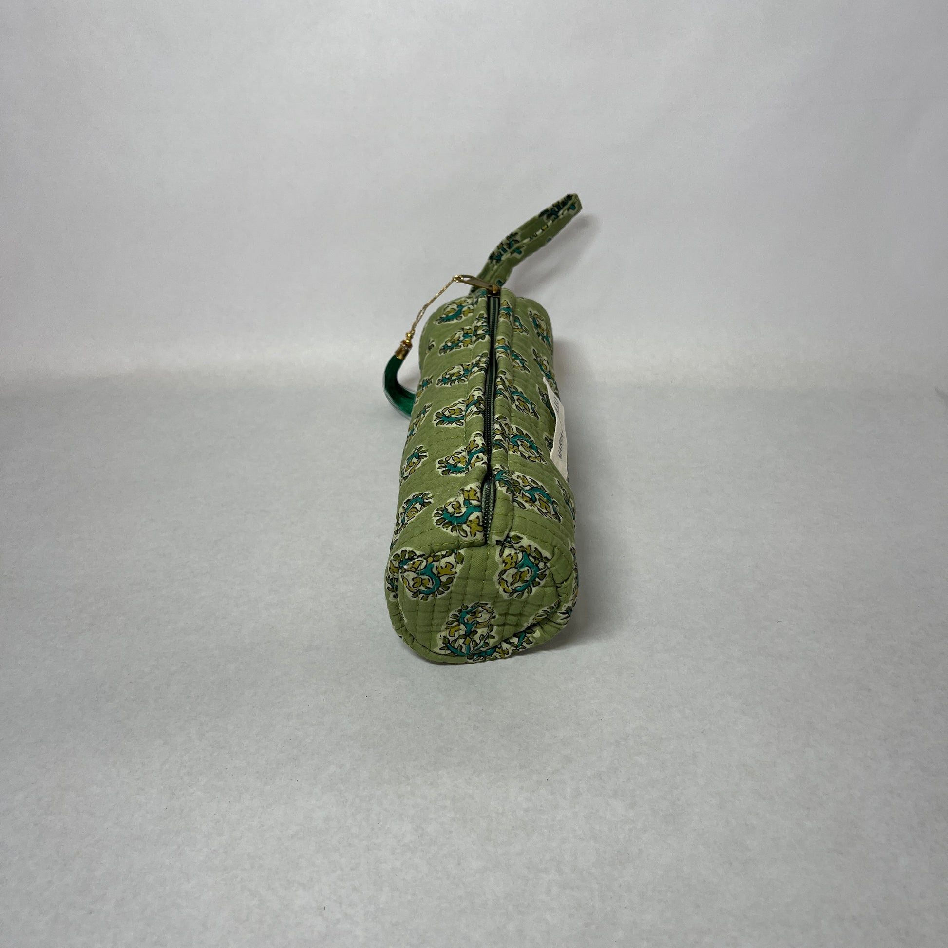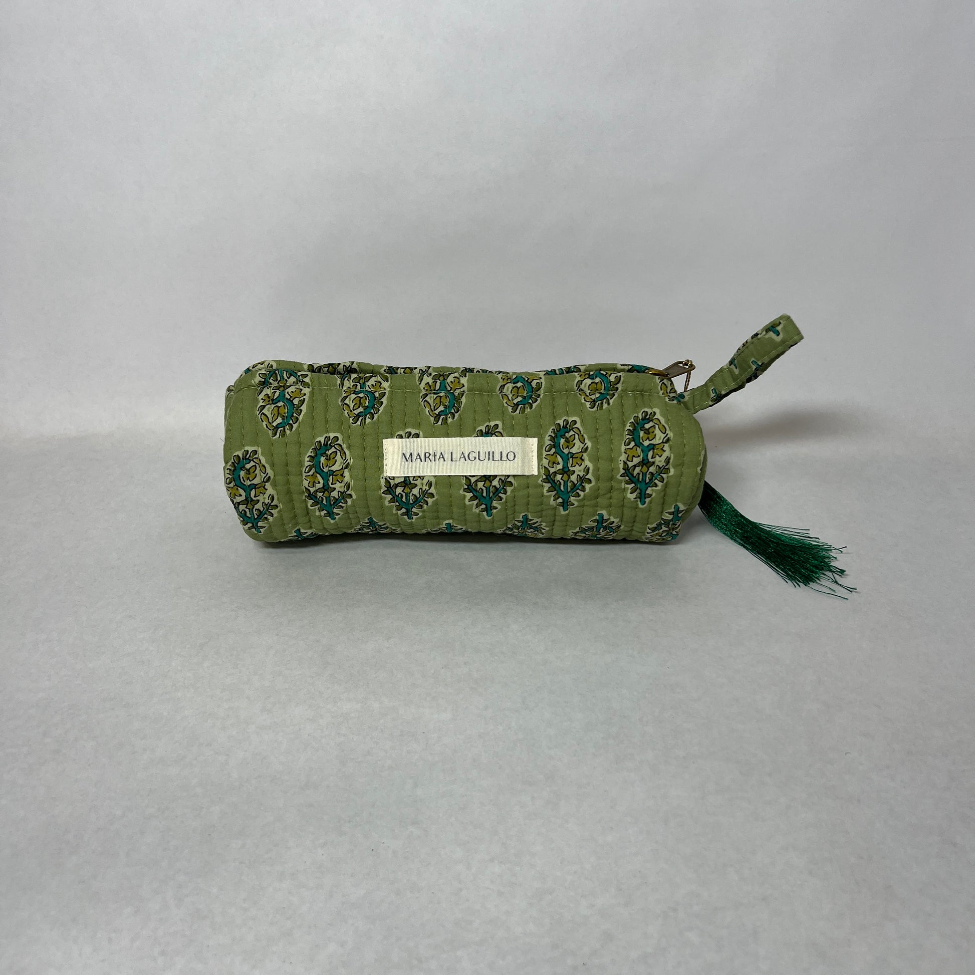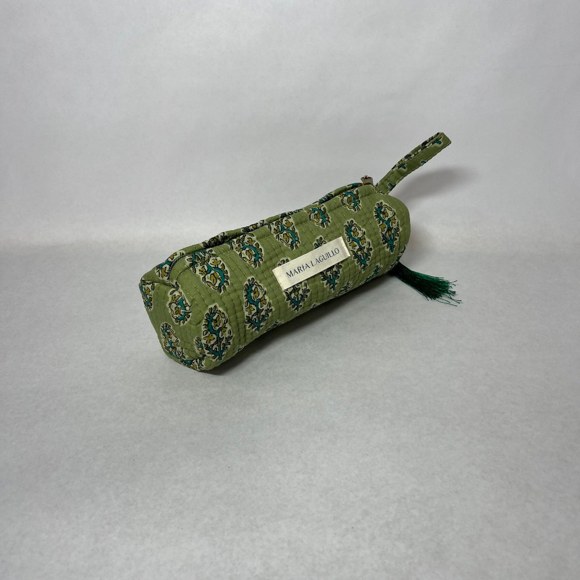 Neceser S INDRAVI de tela "block print", tiene forma cilíndrica.