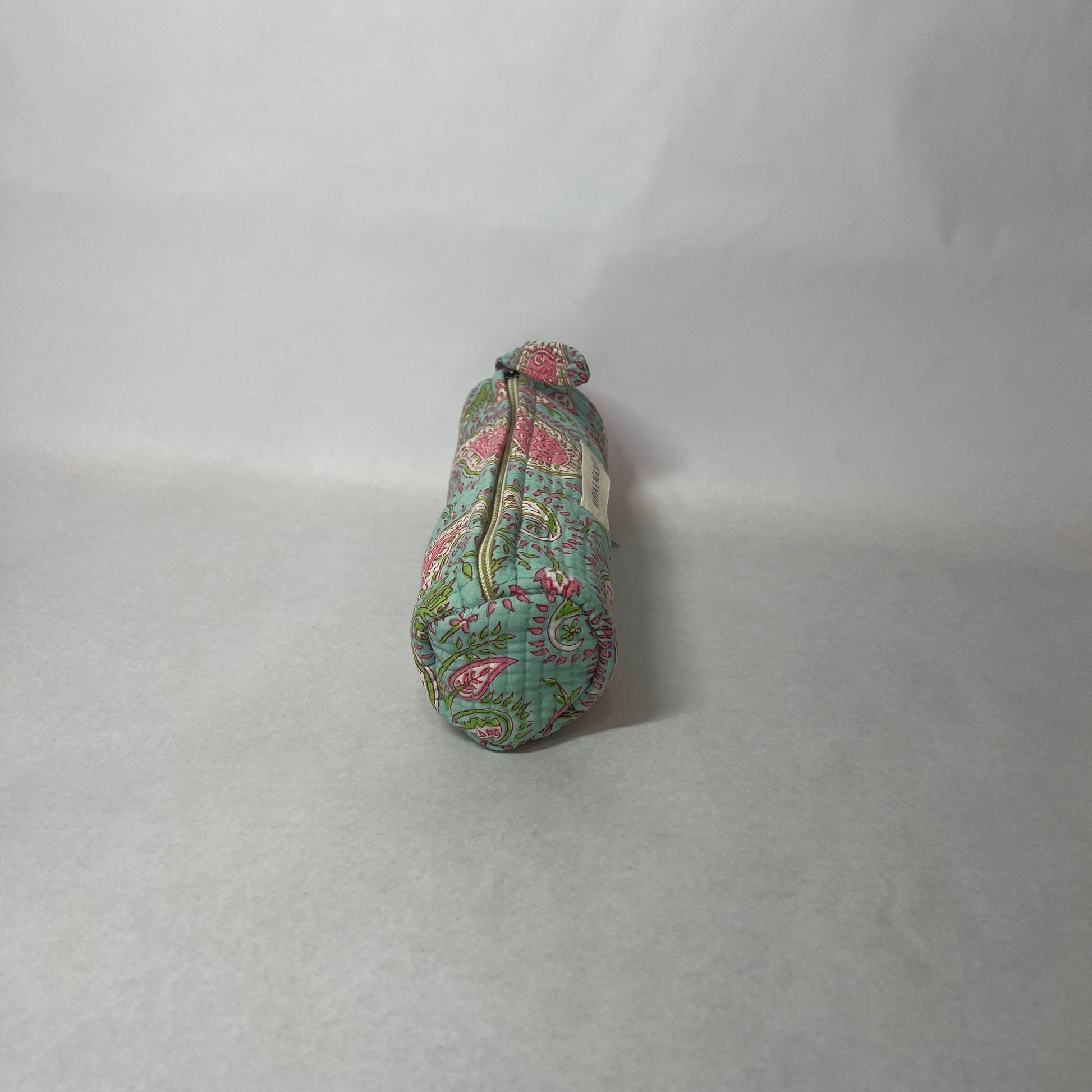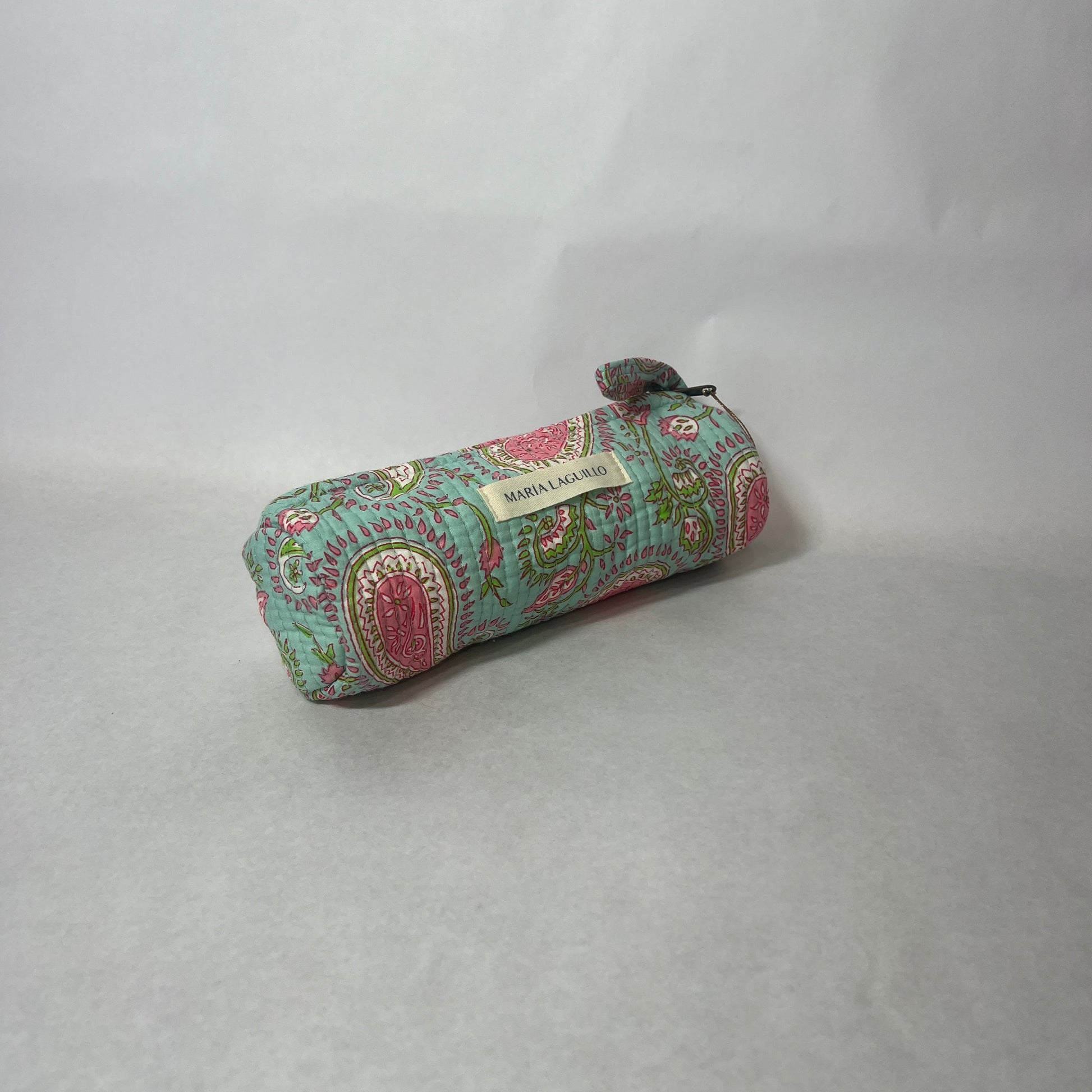 Neceser S KAYI de tela "block print", tiene forma cilíndrica.