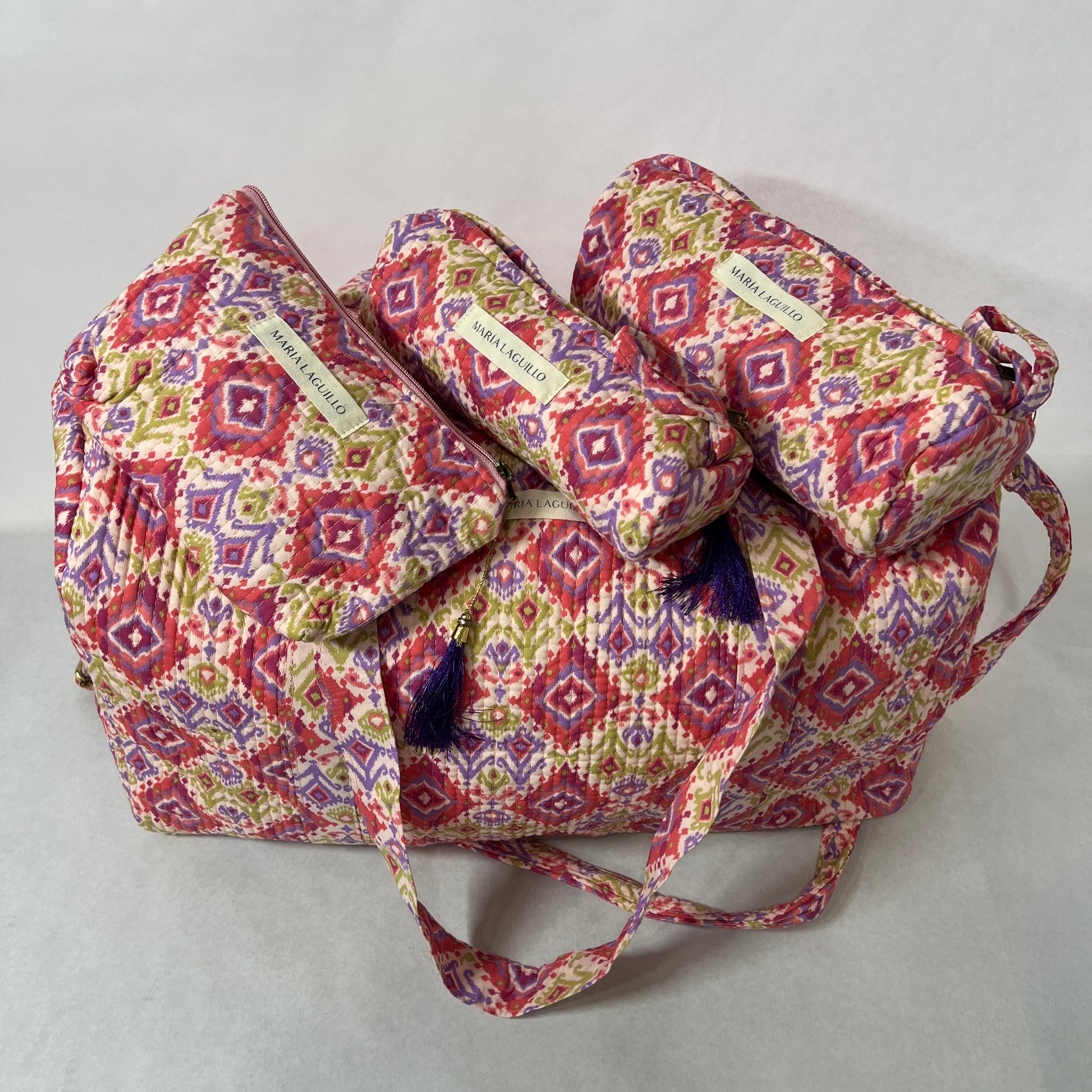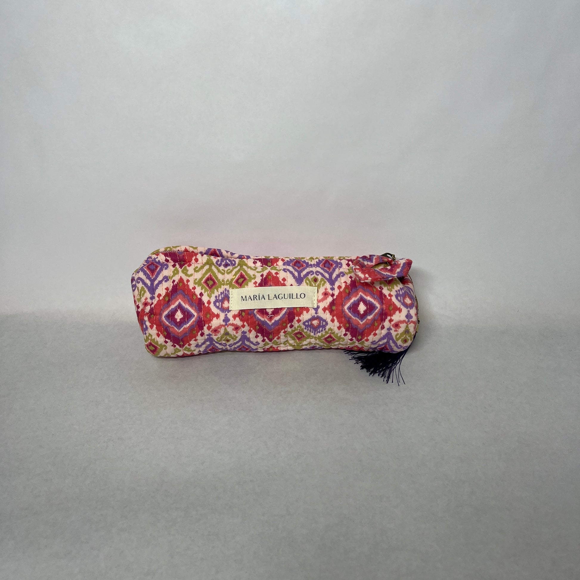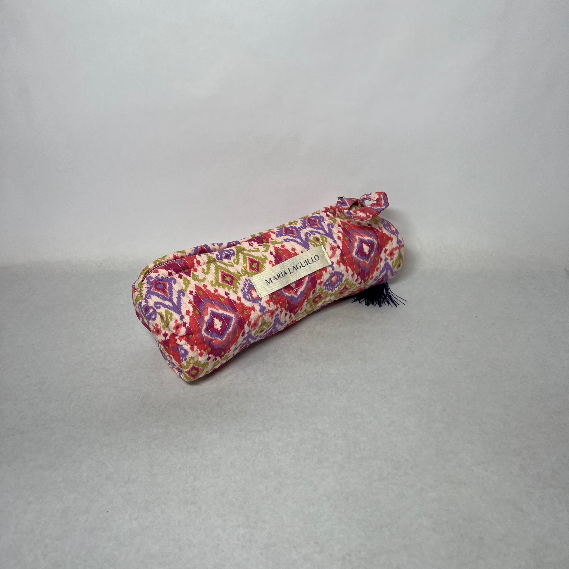 Neceser S MISHIKA de tela "block print", tiene forma cilíndrica.