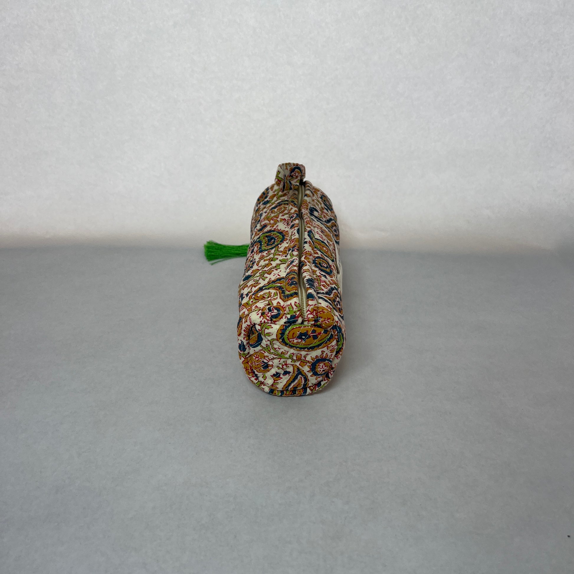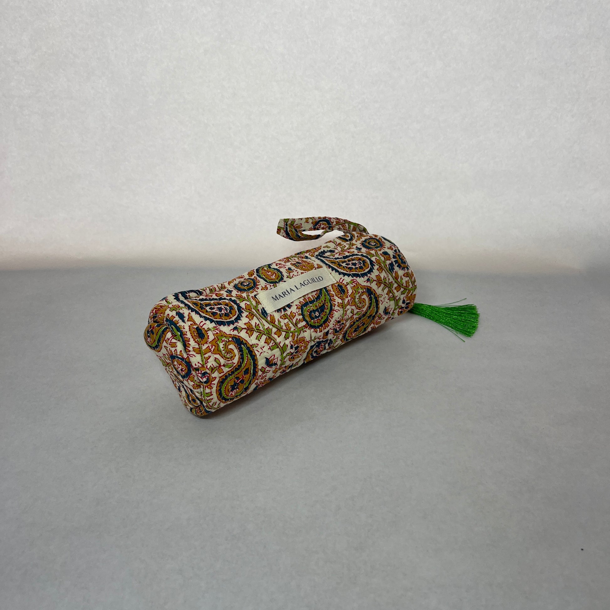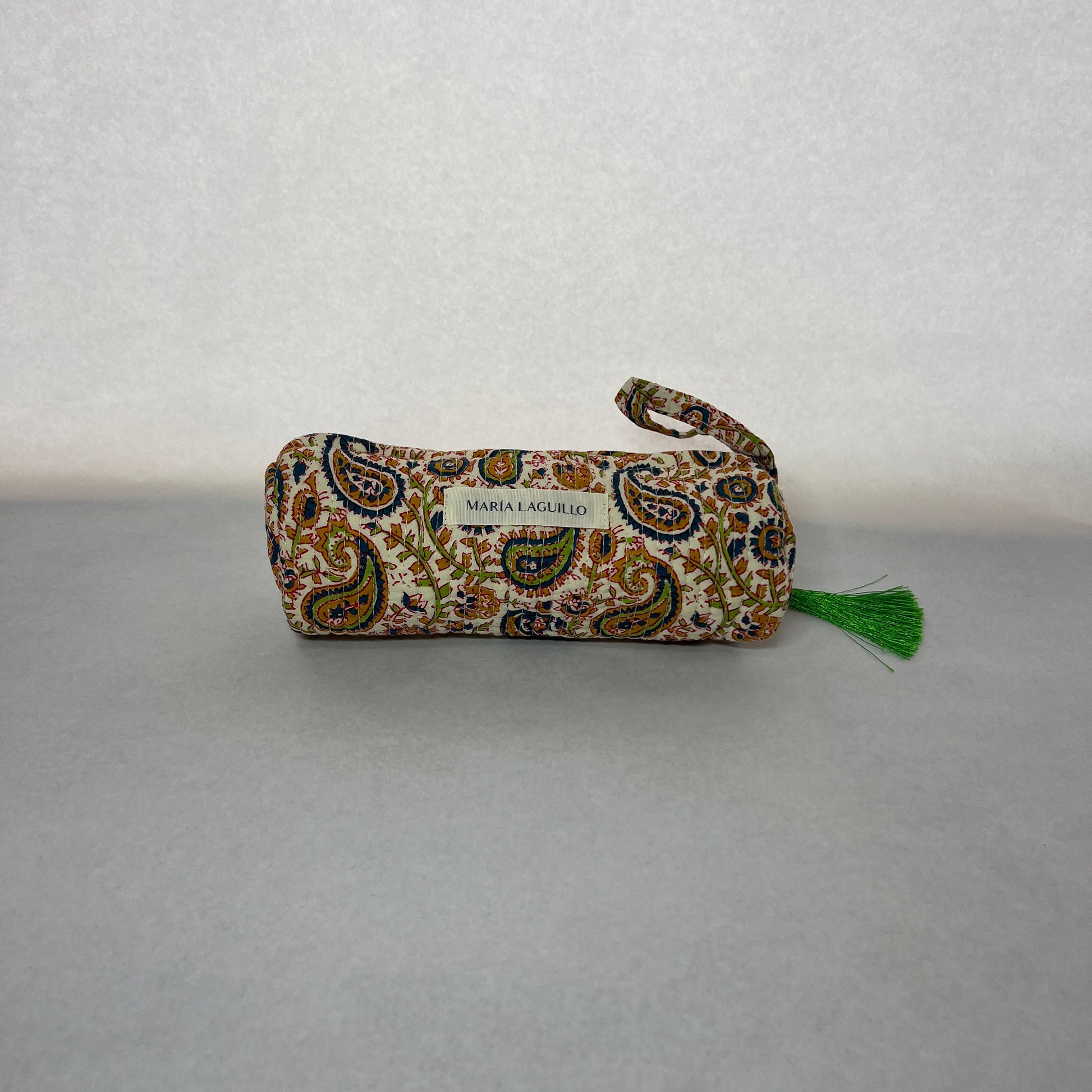 Neceser S NIRMA de tela "block print", tiene forma cilíndrica.