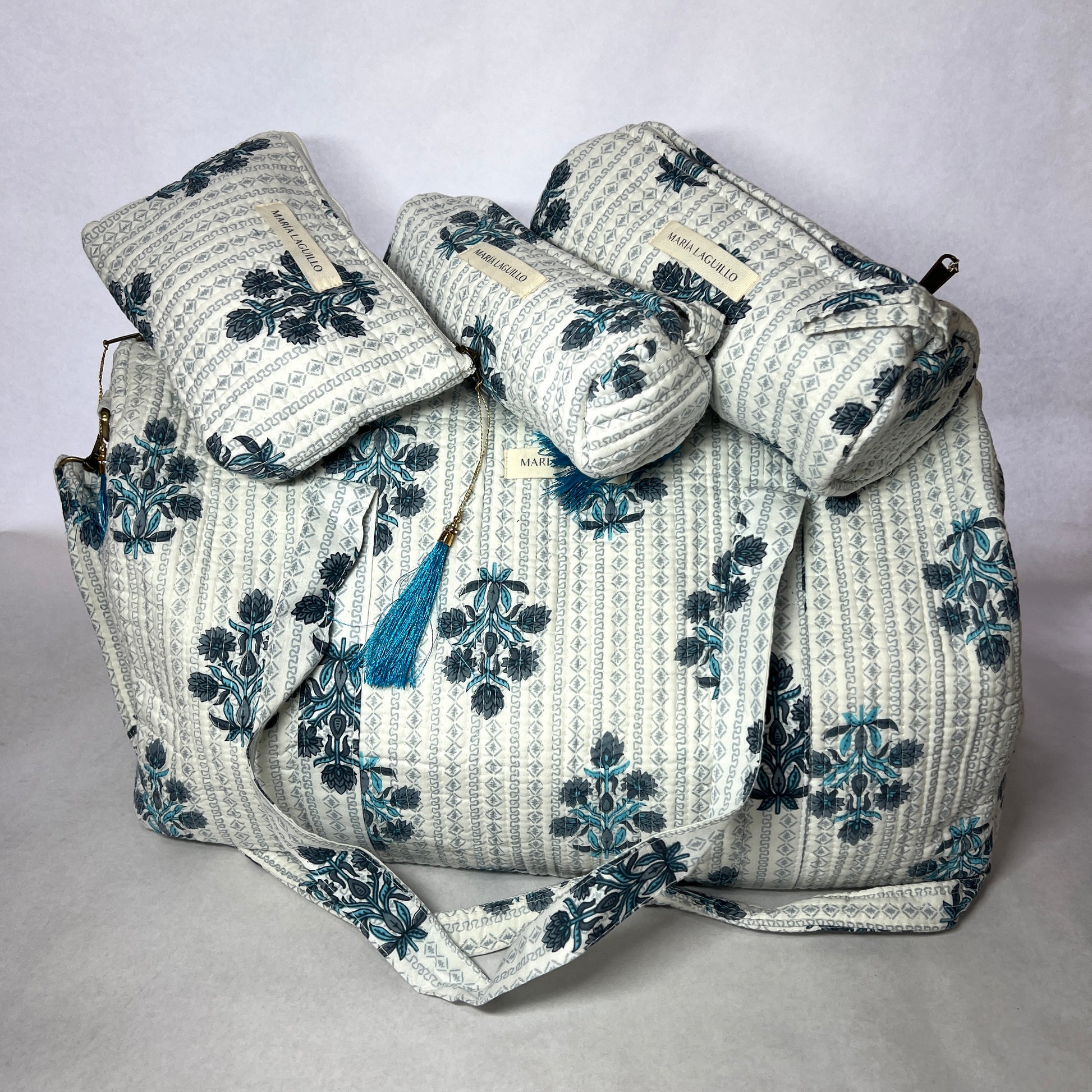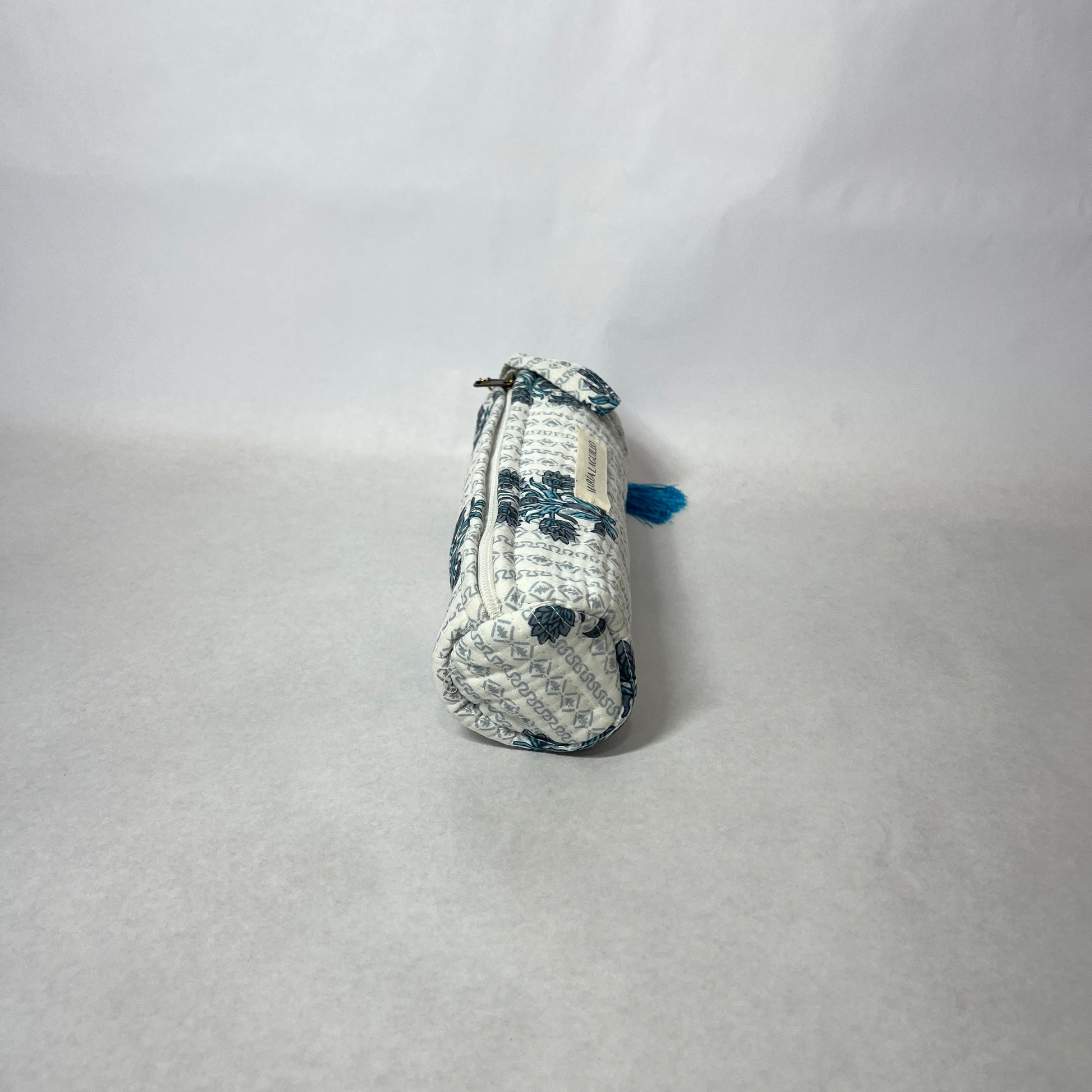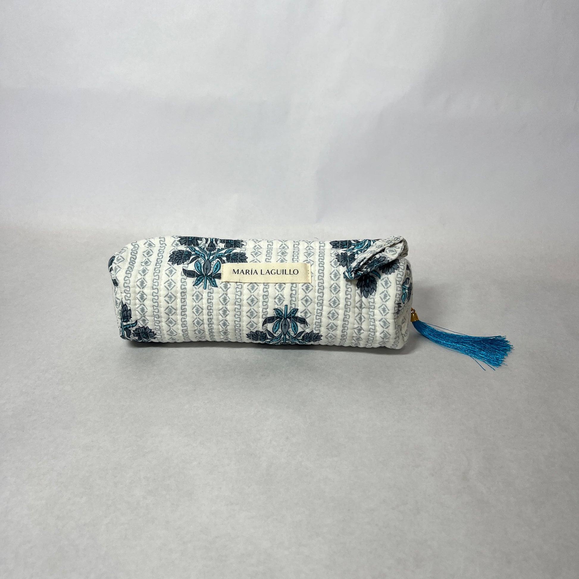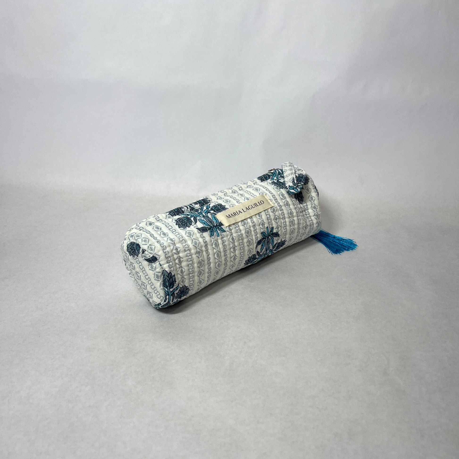 Neceser S SATTVA de tela "block print", tiene forma cilíndrica.