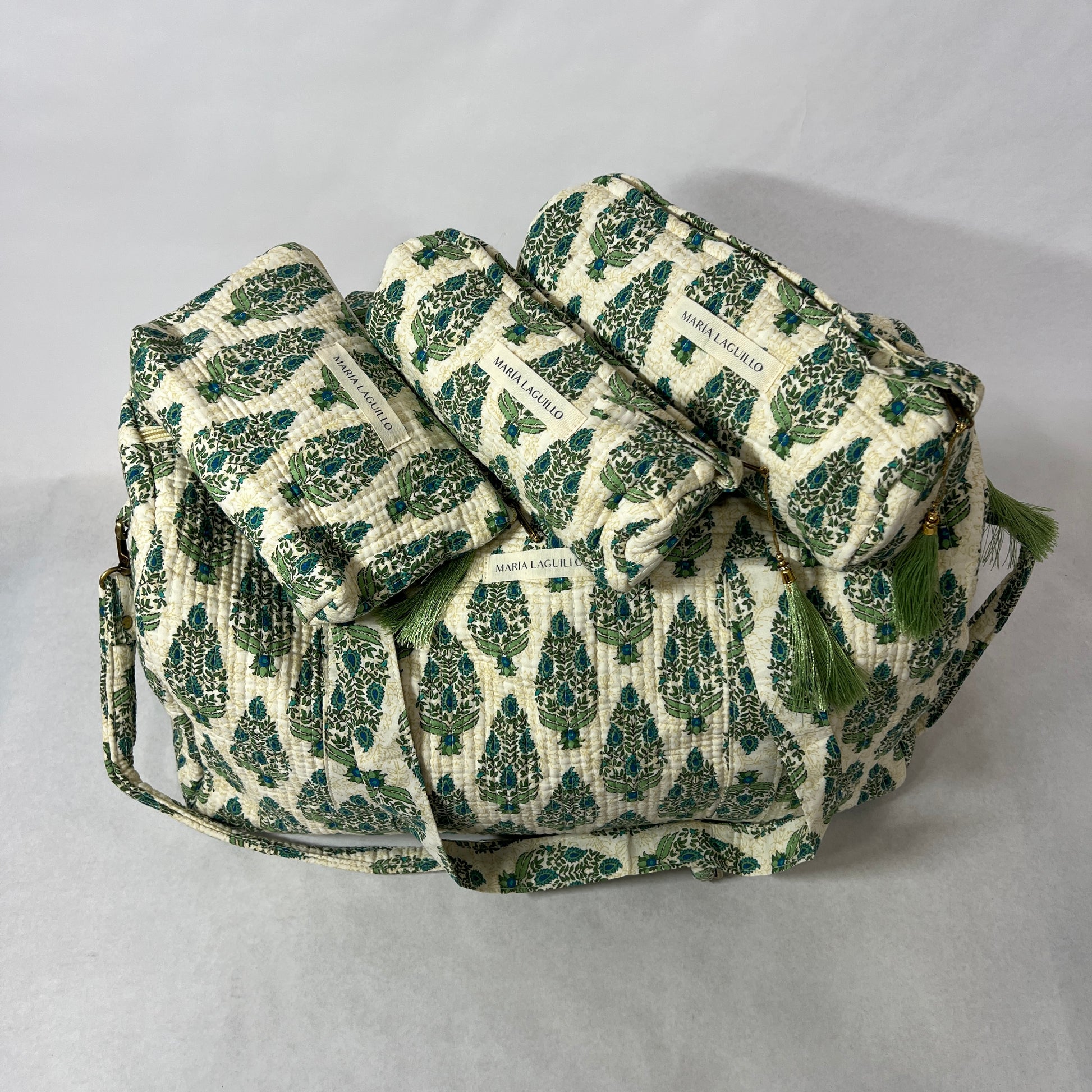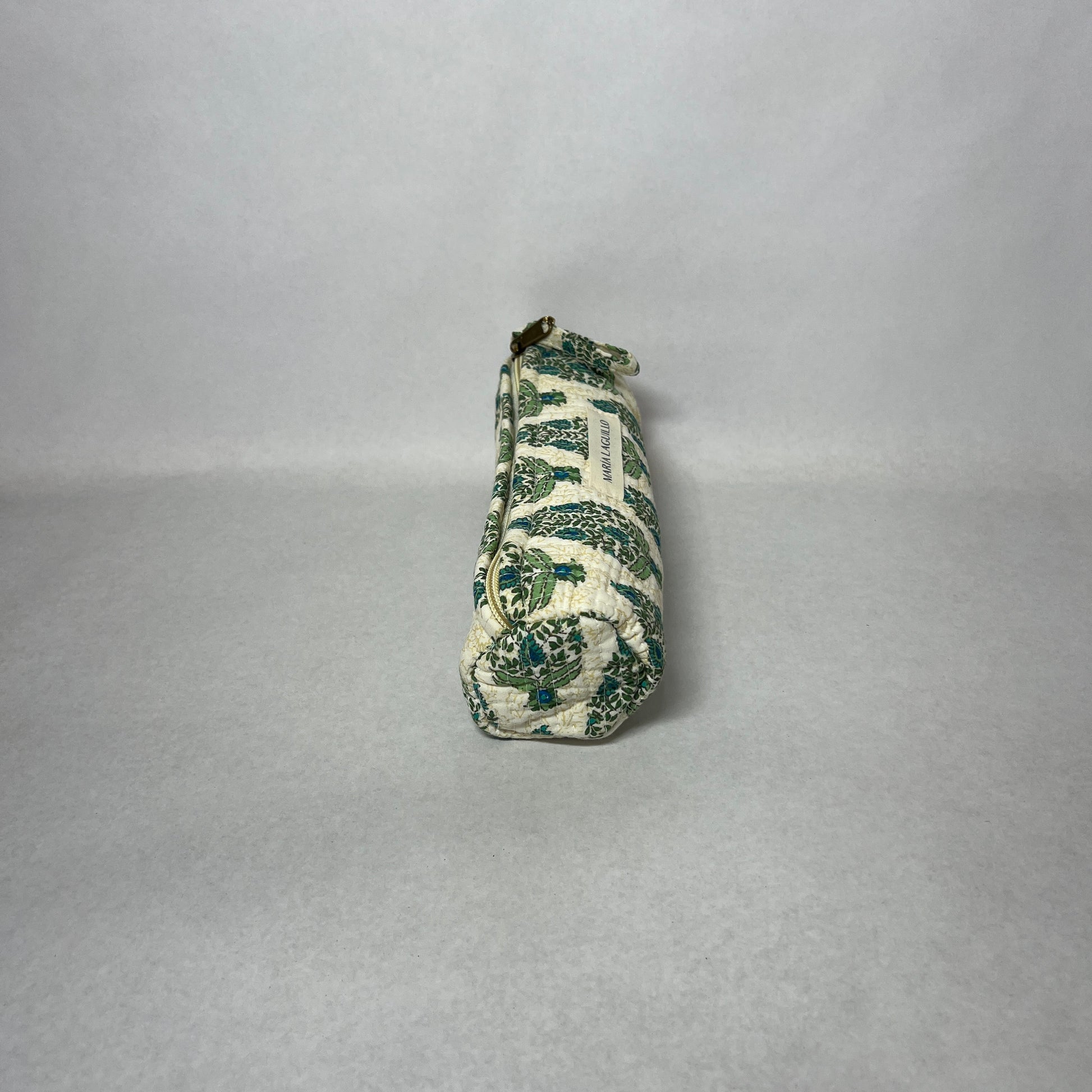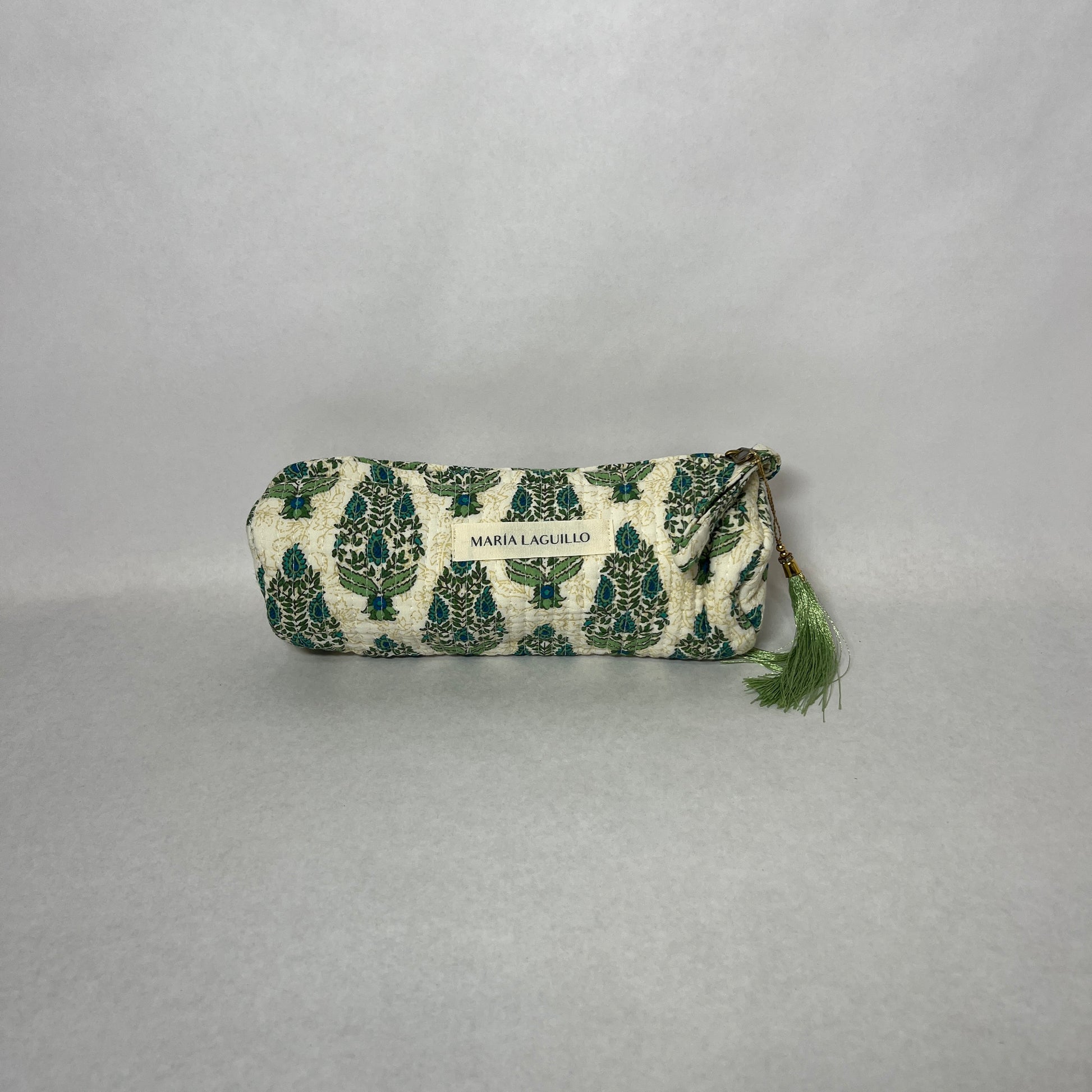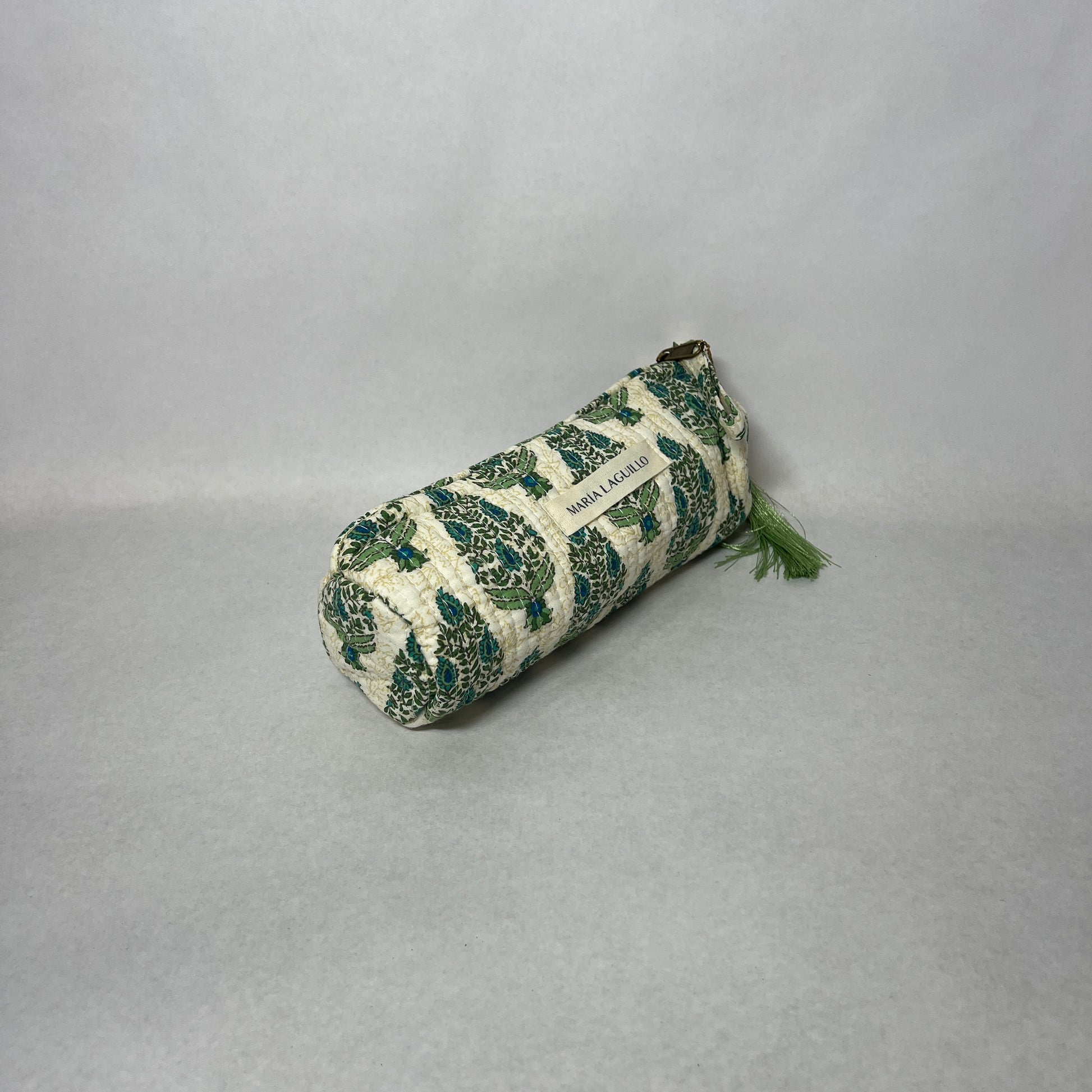 Neceser S VEKTI de tela "block print", tiene forma cilíndrica.