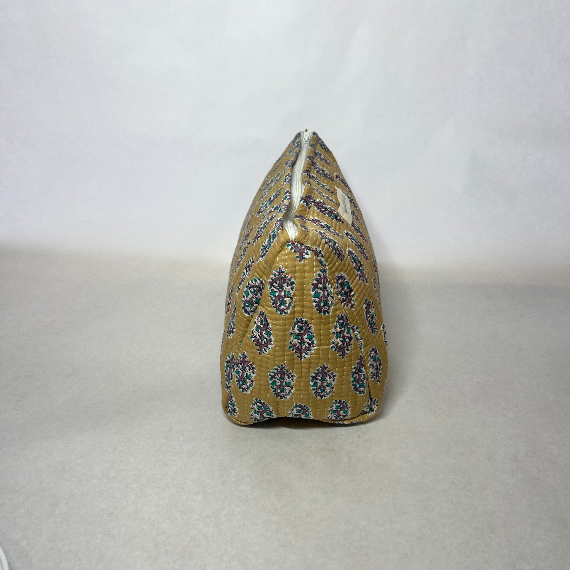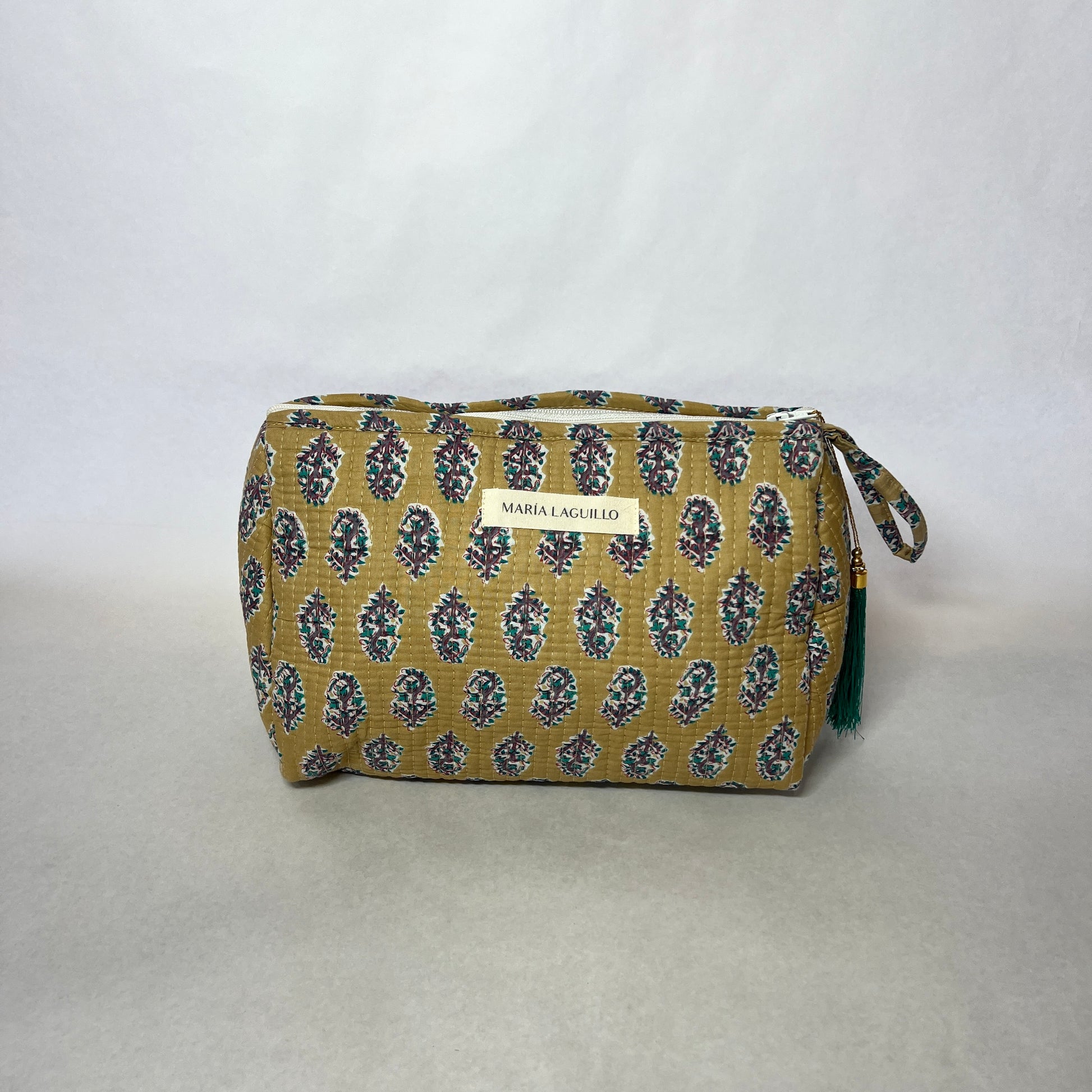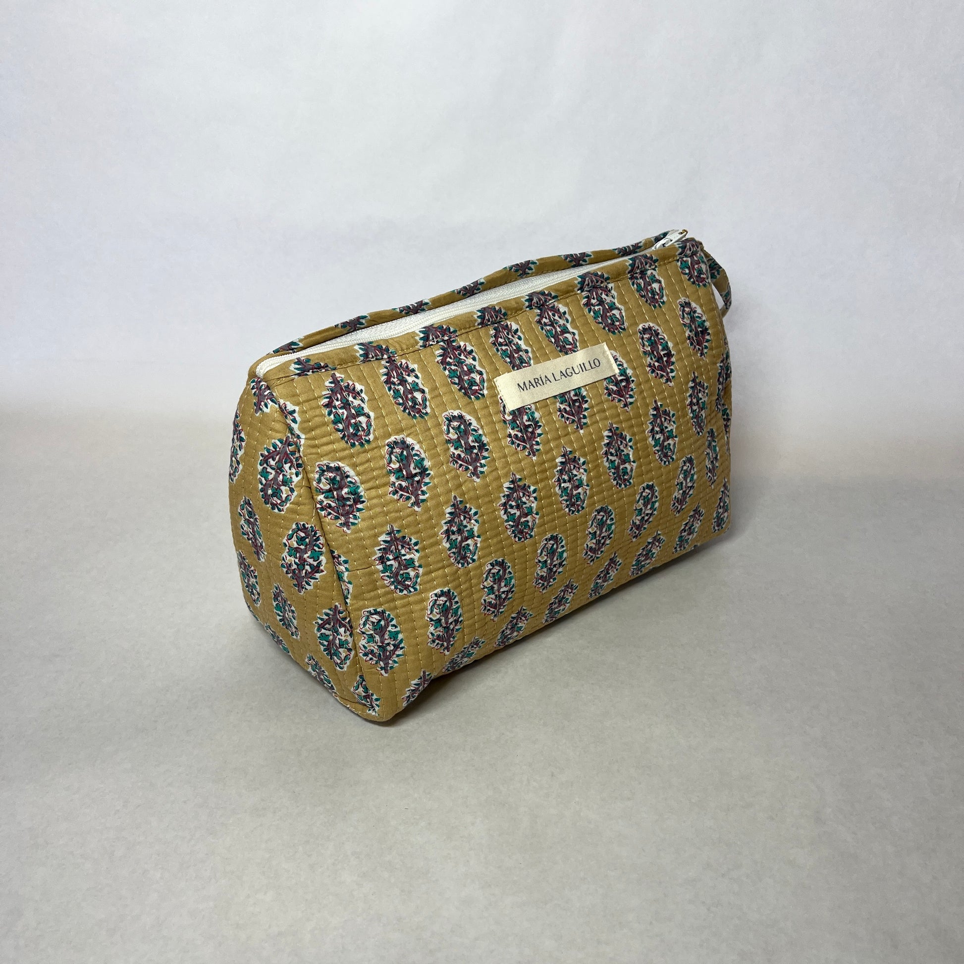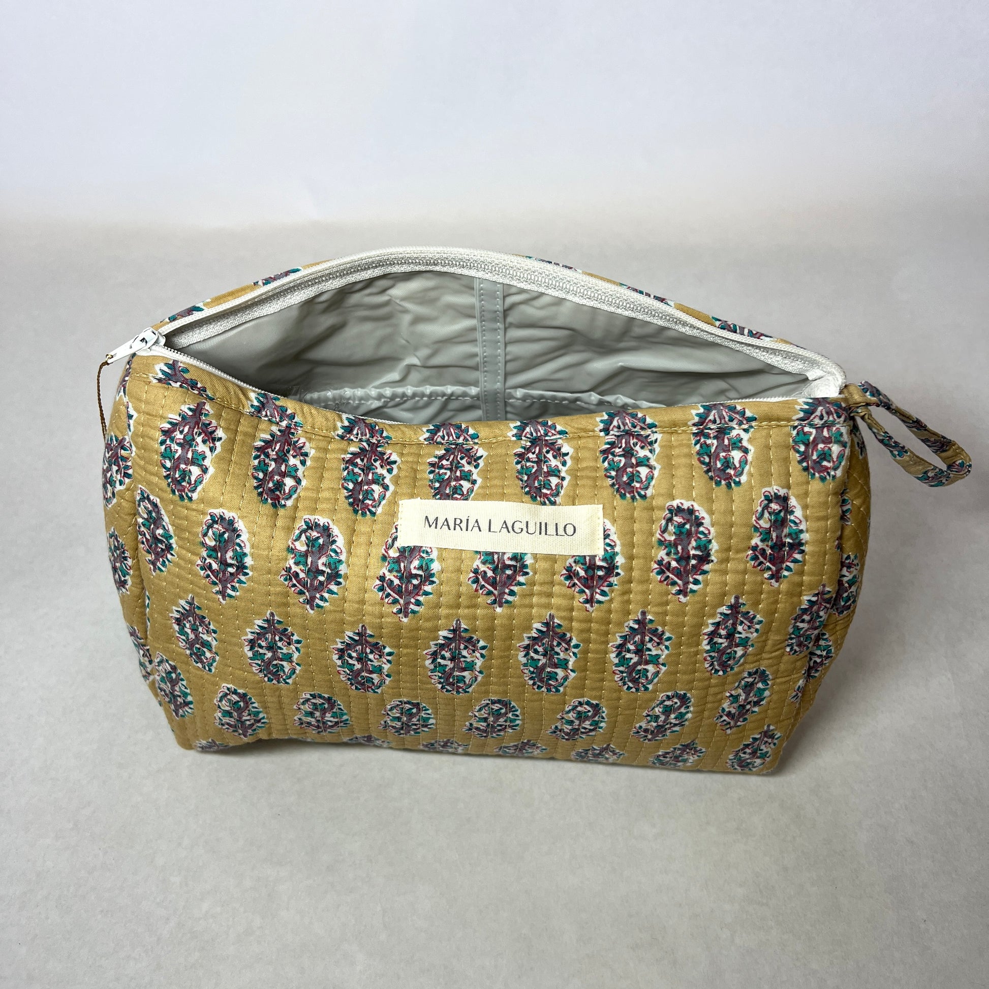 Confeccionado en 100% algodón y decorado con un estampado block print aplicado artesanalmente en la India, cada pieza es única. Su interior impermeable y cuatro bolsillos garantizan orden y protección, mientras que su forma triangular ofrece una gran capacidad sin ocupar demasiado espacio.