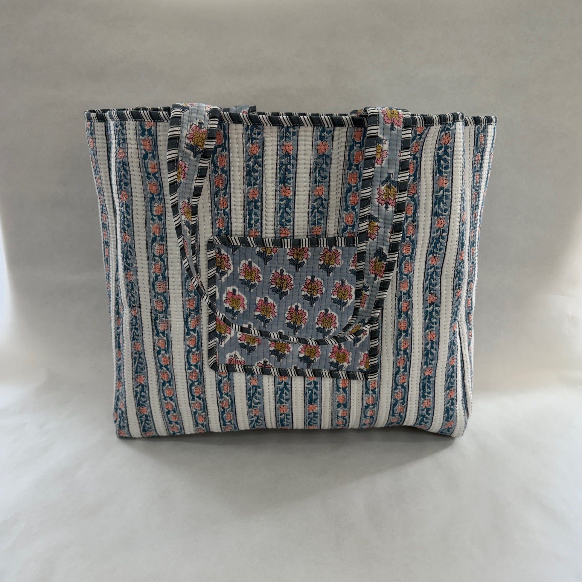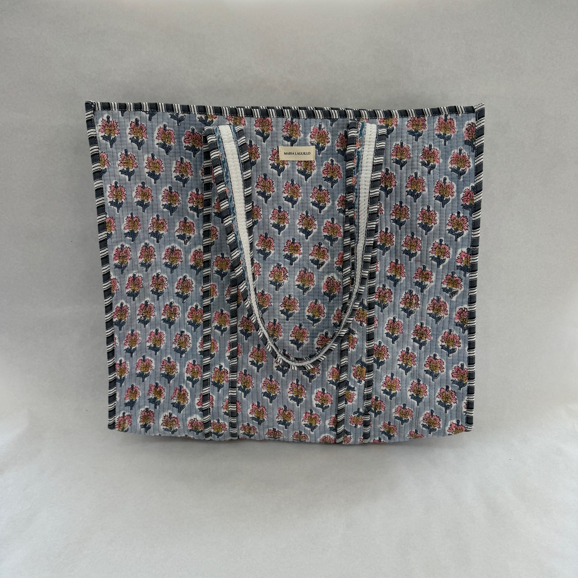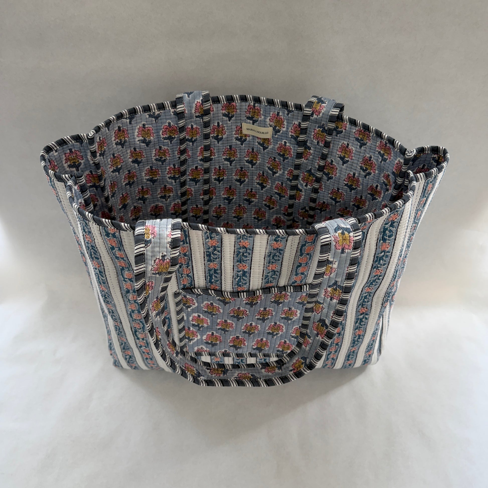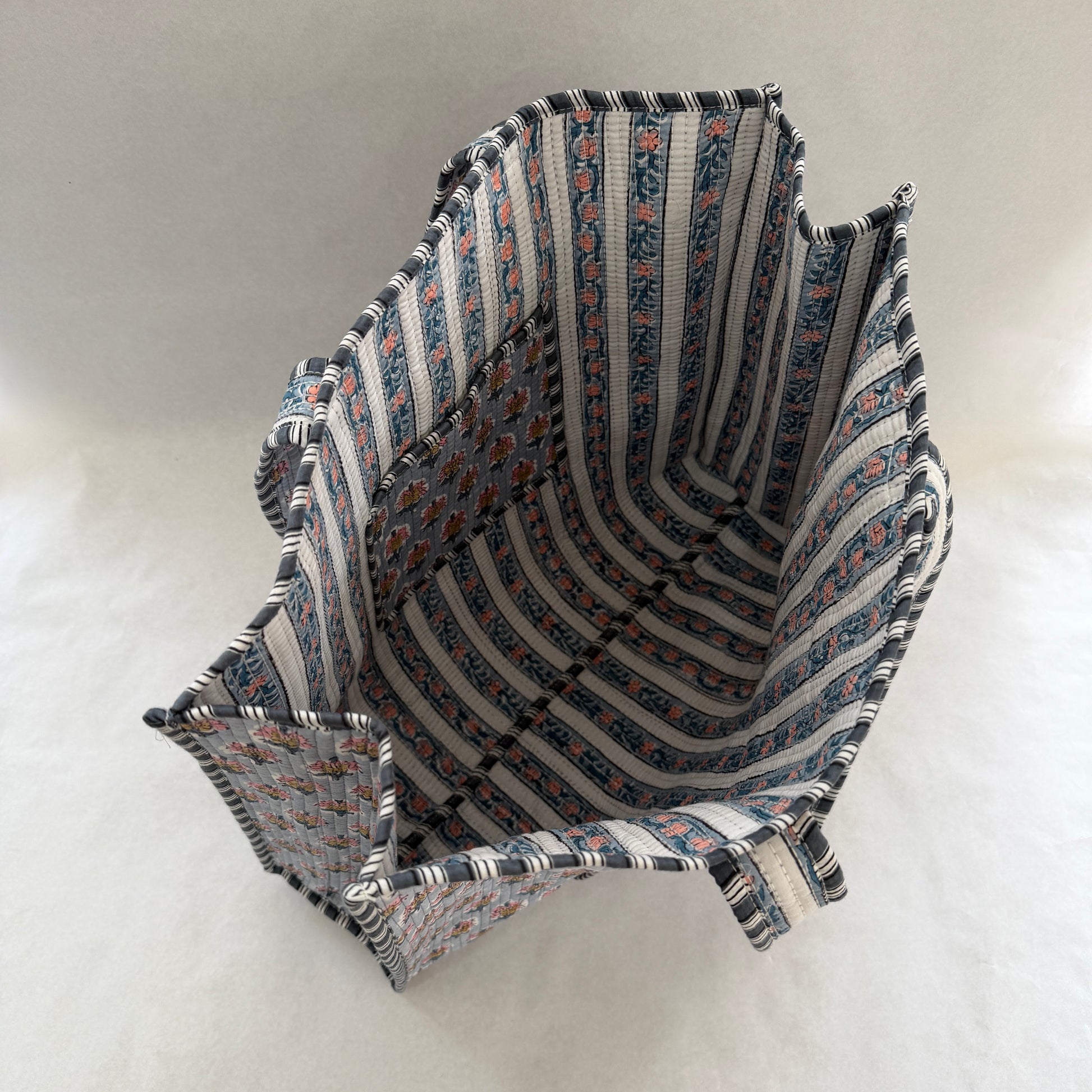 Tote bag reversible confeccionada en 100% algodón con estampado block print, fabricada en la India. Su diseño reversible permite usarla por ambos lados, combinando dos estampados distintos.