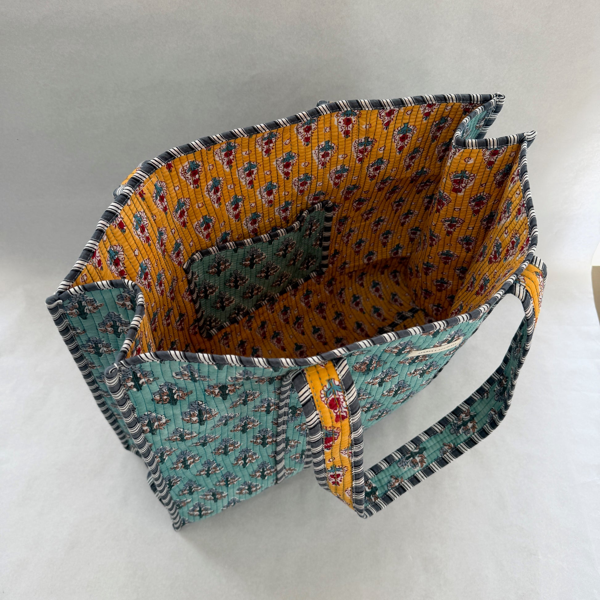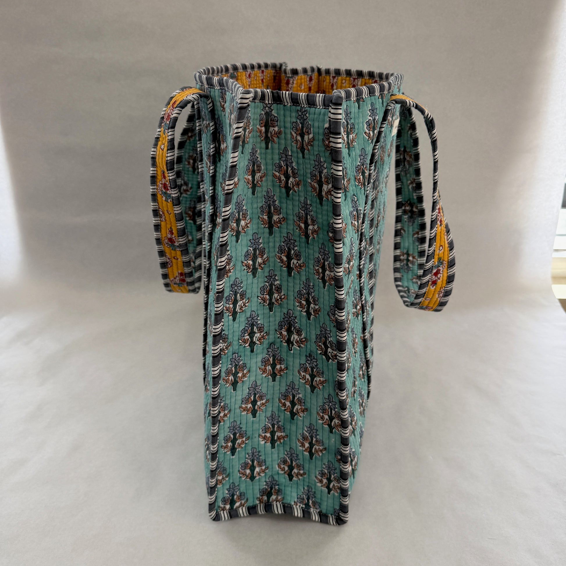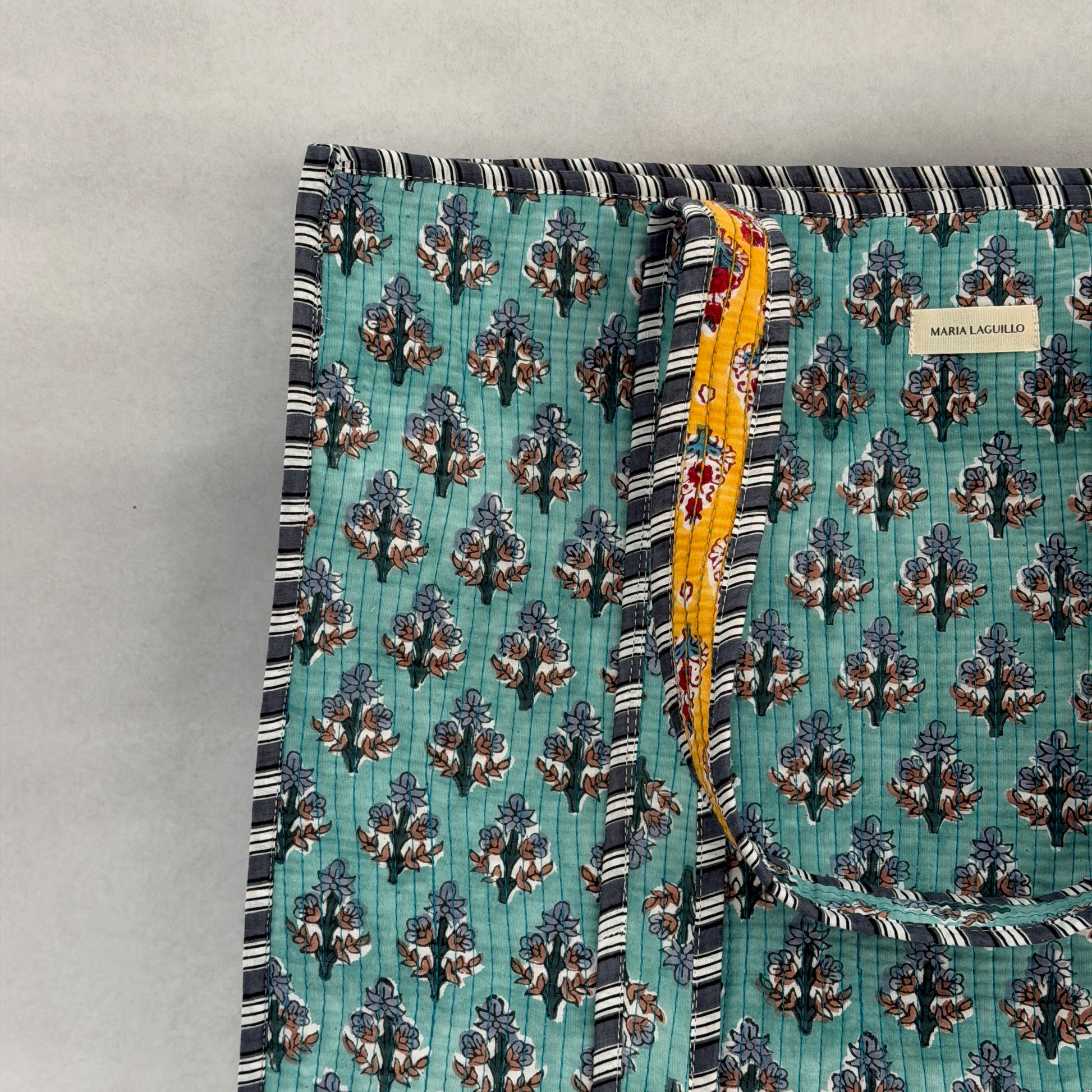 Tote bag reversible confeccionada en 100% algodón con estampado block print, fabricada en la India. Su diseño reversible permite usarla por ambos lados, combinando dos estampados distintos.